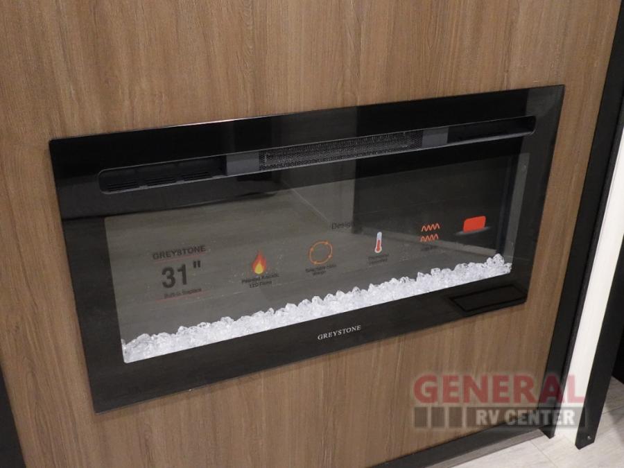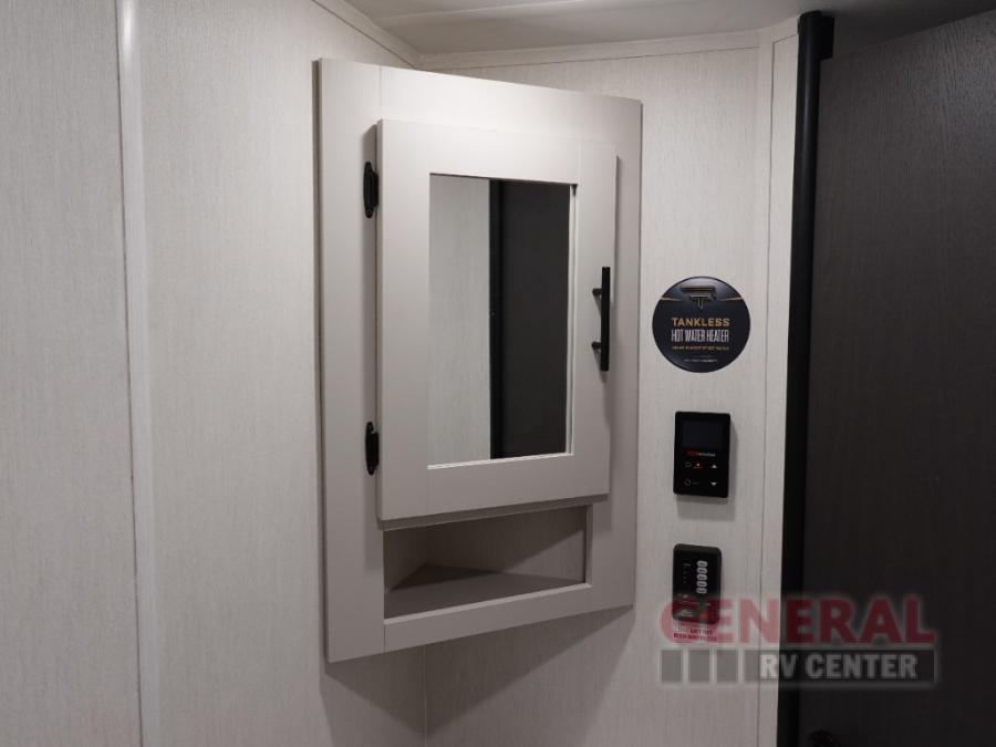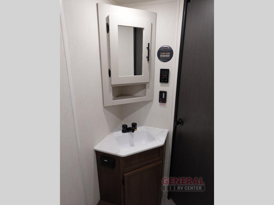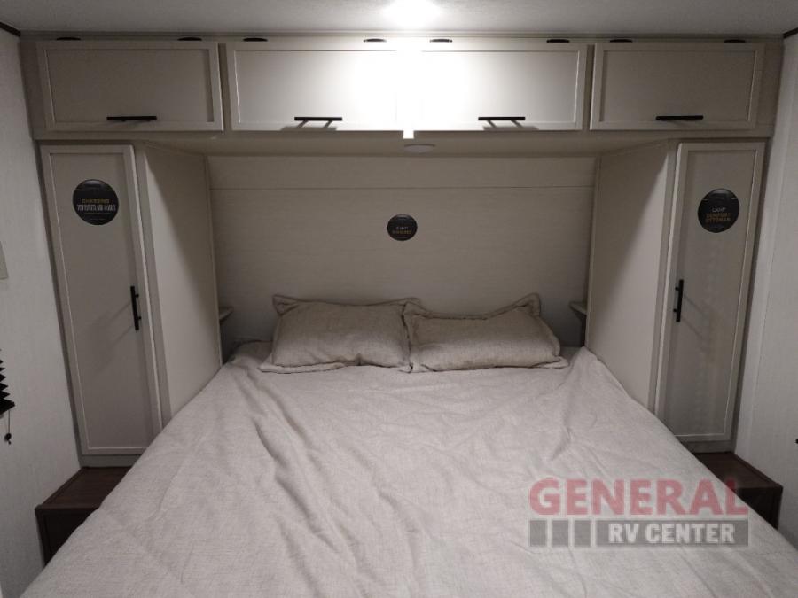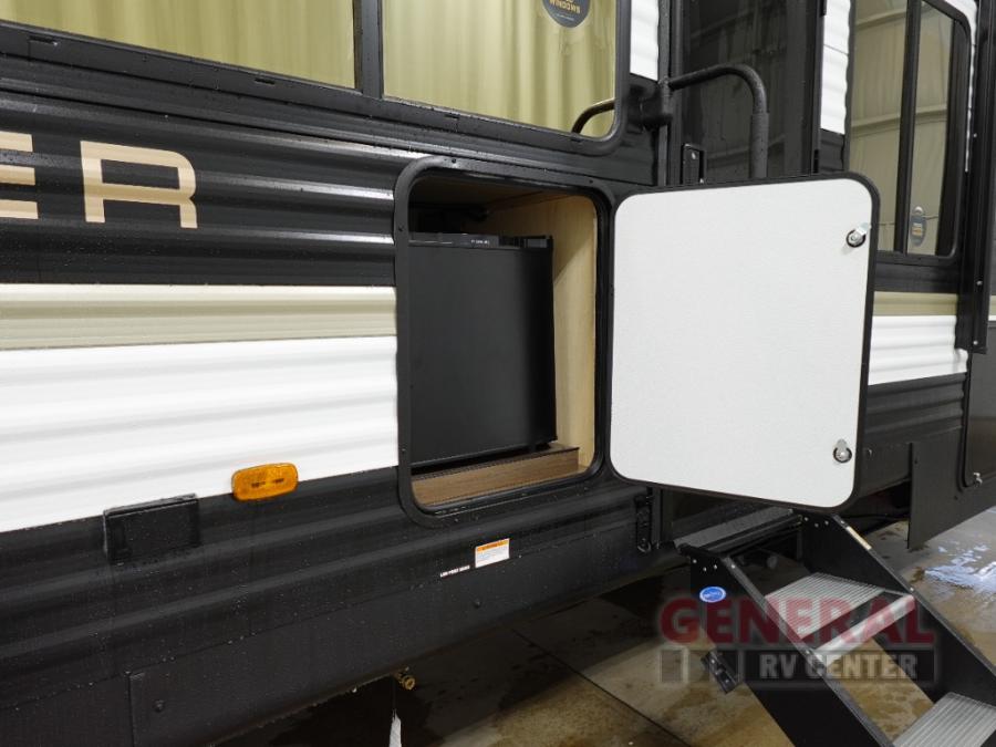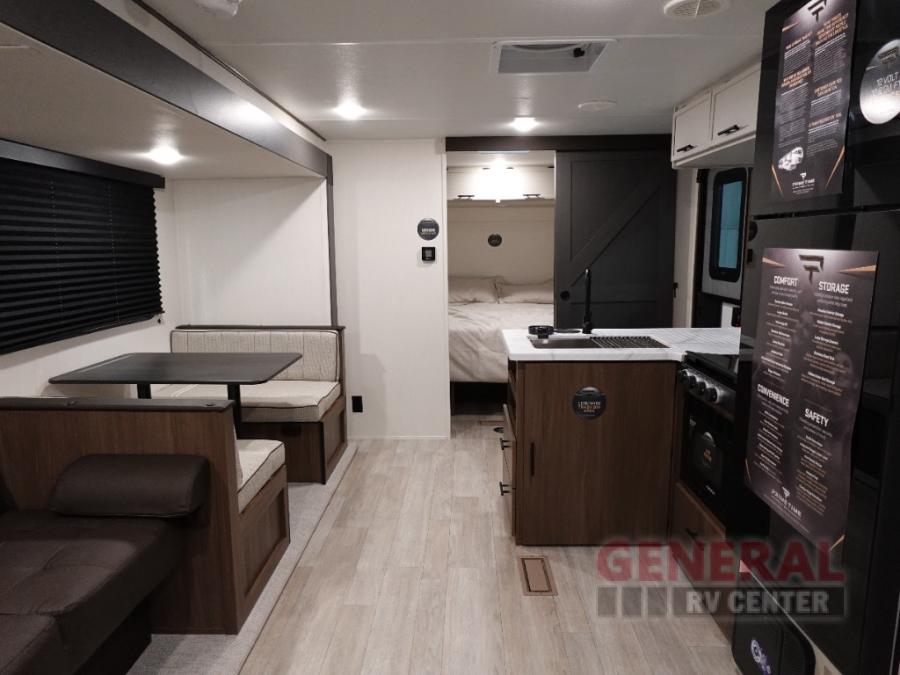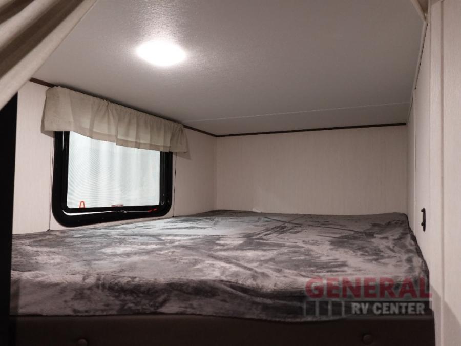 You'll appreciate the added space in this travel trailer thanks to the large slide out! The booth dinette and sofa are found here, and there is a moveable storage ottoman for extra blankets or board games. You'll have your own space up front in the private bedroom, complete with a camp king bed and storage for your things, while your guests take the double-size bunk beds towards the back. The chef of your group will find a three burner cooktop and a built-in convection microwave with an air fryer to cook meals, plus there is a 12V refrigerator and large hidden pantry for food storage. This unit also includes a power awning outdoors and an outside refrigerator to keep cold drinks close by.
