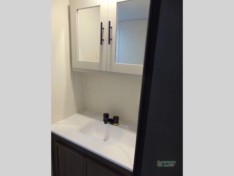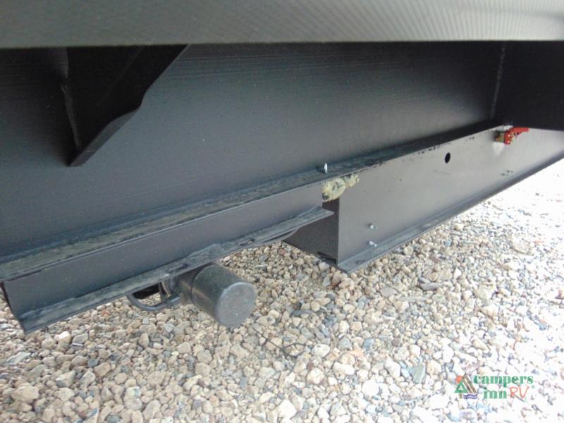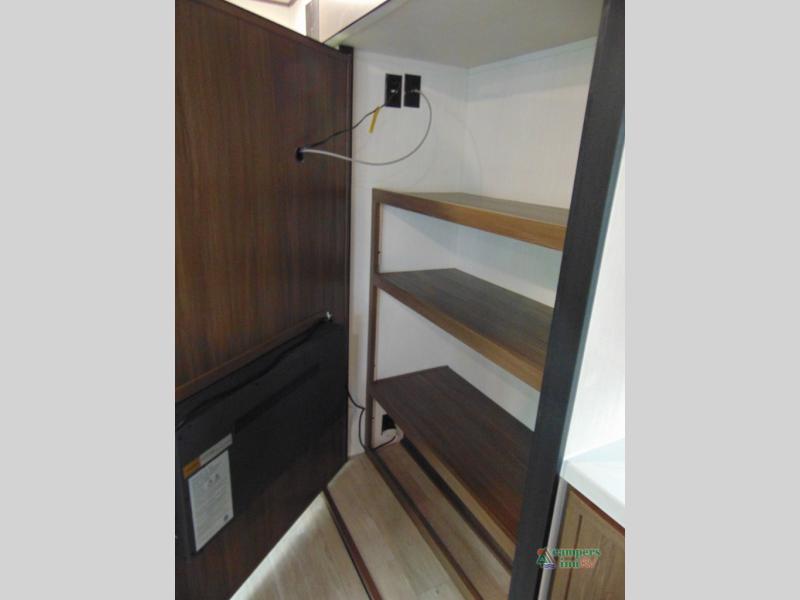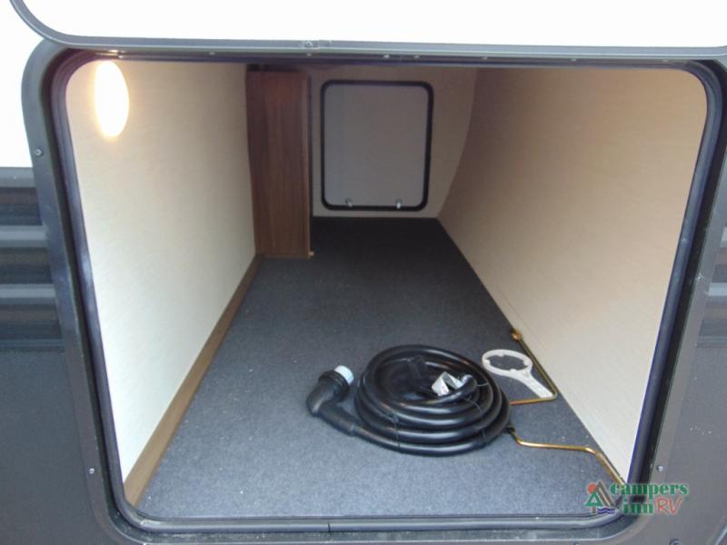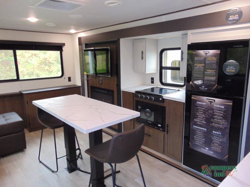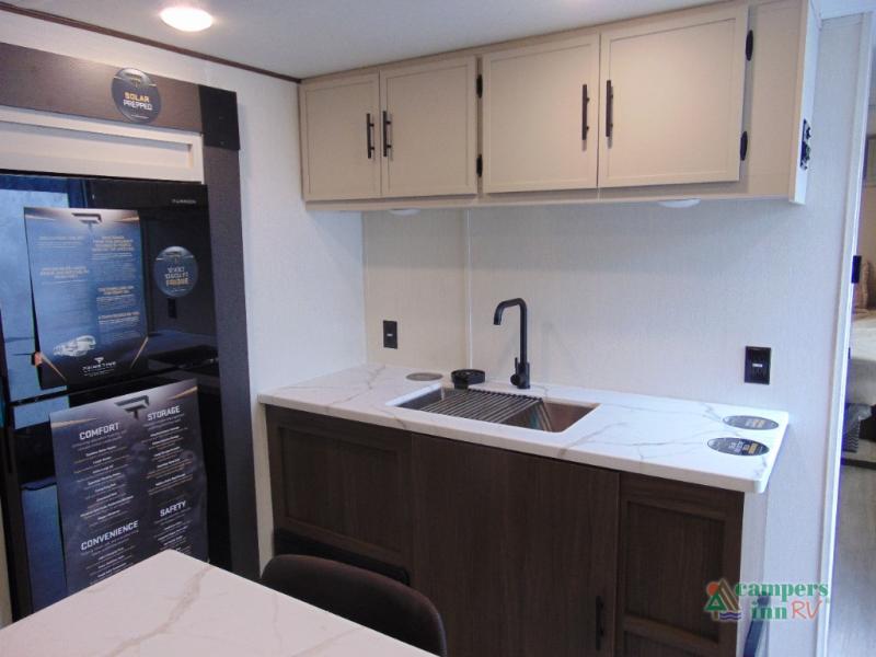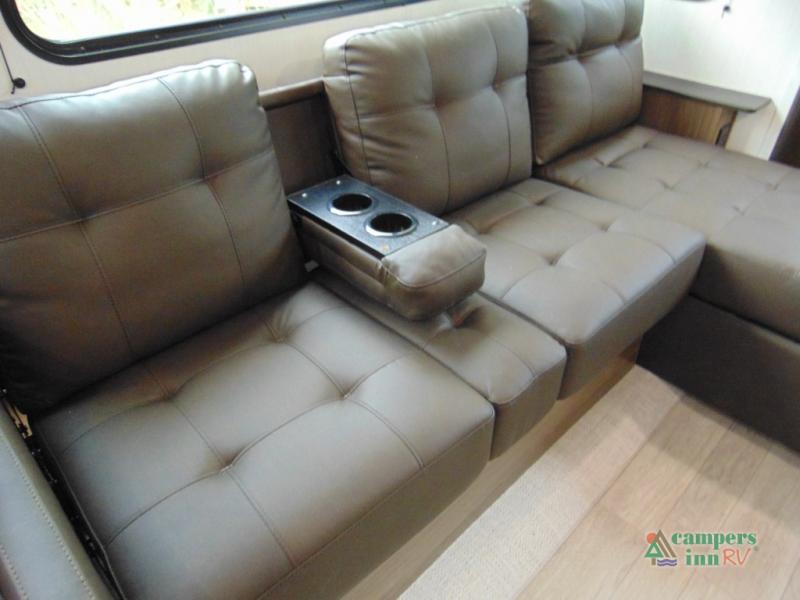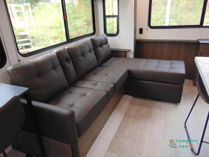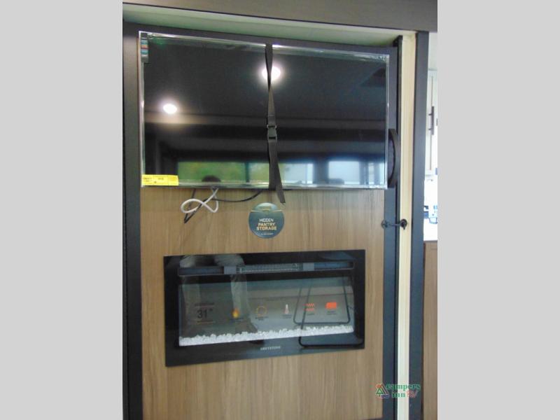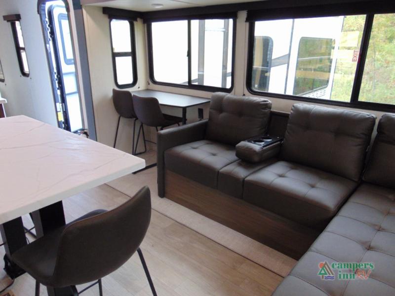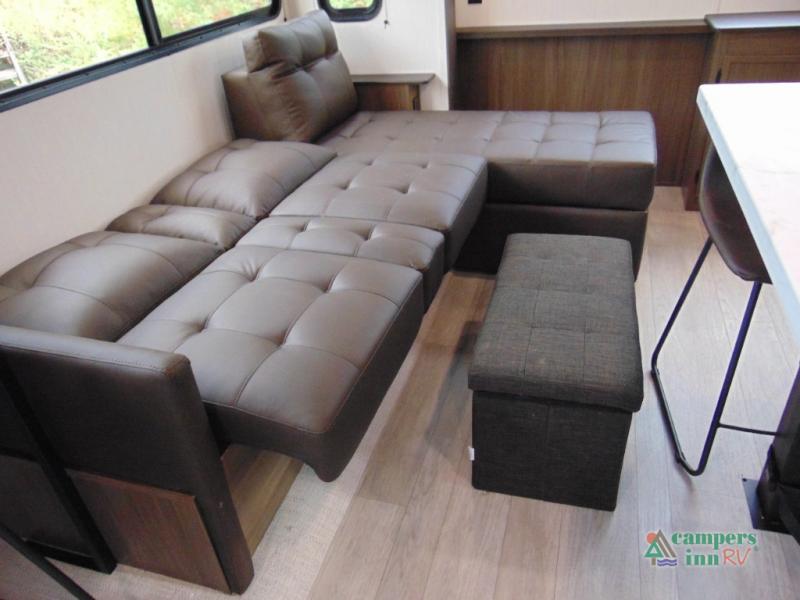 There is ample space to move about in this travel trailer thanks to the dual opposing slides! Here, you'll find an L-shaped sofa with a chaise lounge in direct view of TV and fireplace. There is also a hidden pantry behind the TV for snacks and movies! The center farm table includes four stools so you can gather around for meal times, and the desk with a chair will provide a place for you to get some work done if needed. This unit features a full bath towards the front private bedroom for easy access at night, and you're sure to get a great night's rest on the camp king bed!