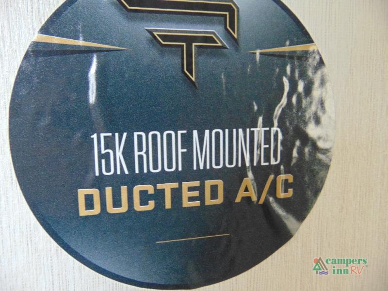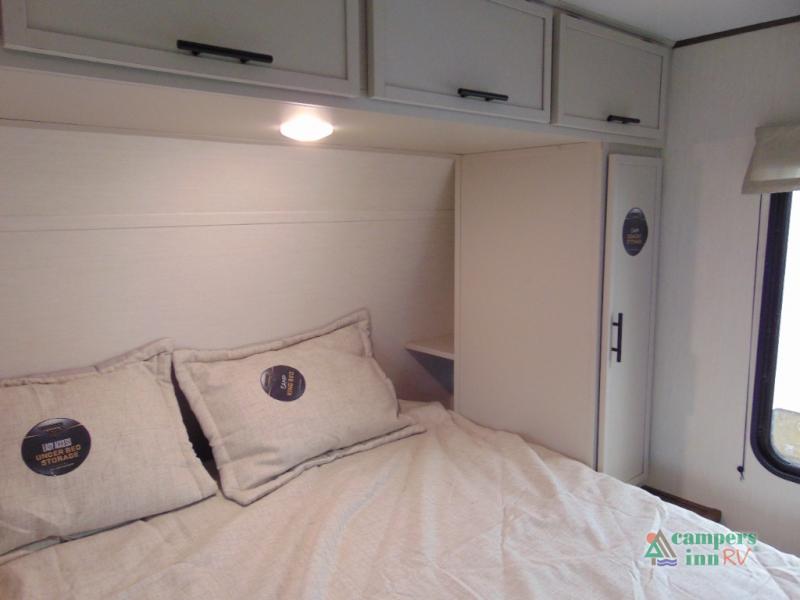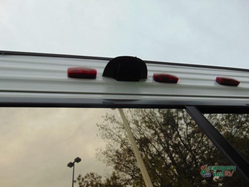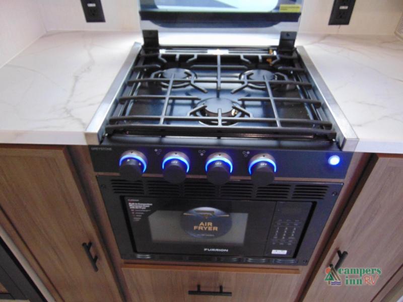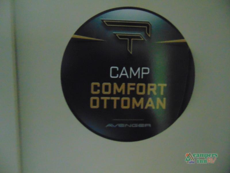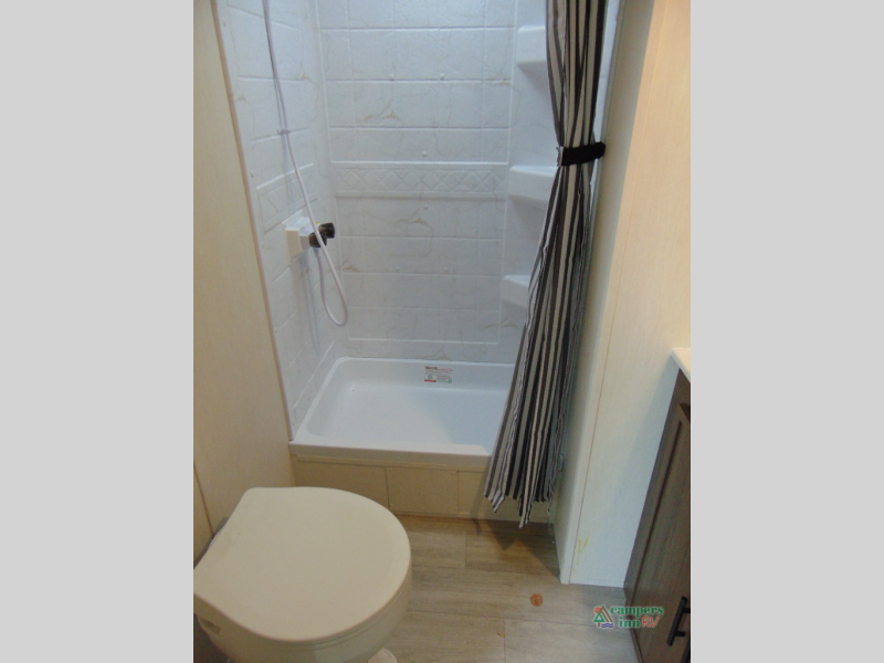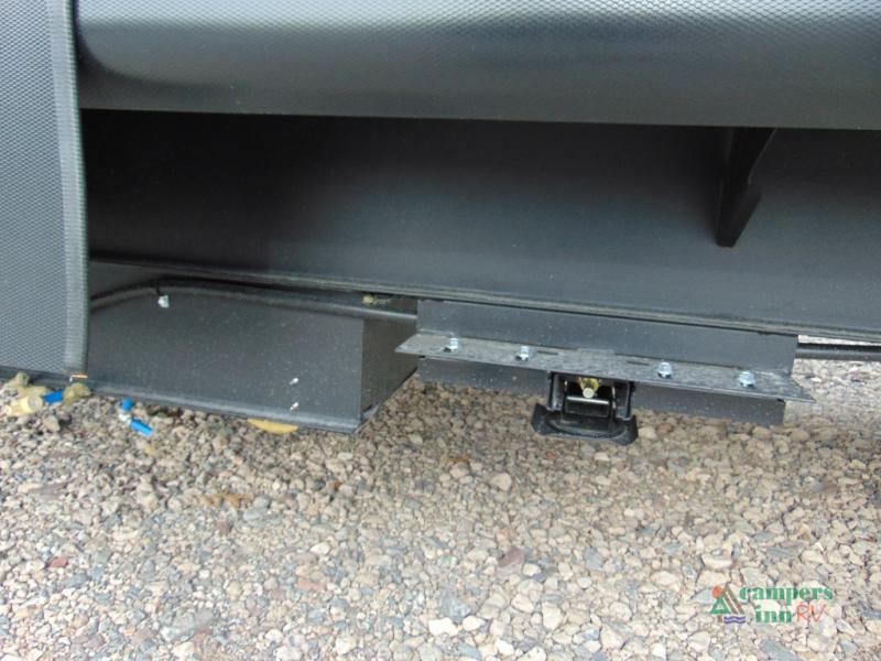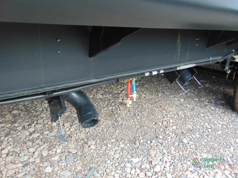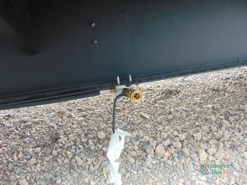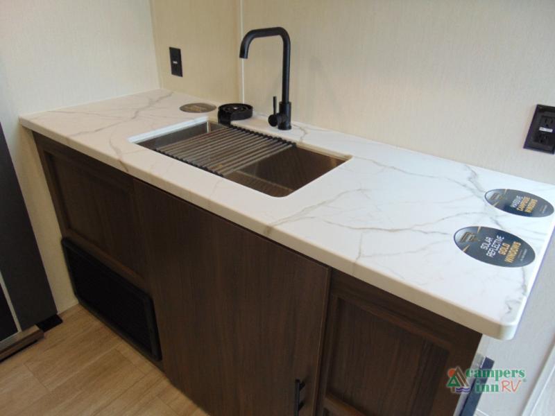 There is ample space to move about in this travel trailer thanks to the dual opposing slides! Here, you'll find an L-shaped sofa with a chaise lounge in direct view of TV and fireplace. There is also a hidden pantry behind the TV for snacks and movies! The center farm table includes four stools so you can gather around for meal times, and the desk with a chair will provide a place for you to get some work done if needed. This unit features a full bath towards the front private bedroom for easy access at night, and you're sure to get a great night's rest on the camp king bed!