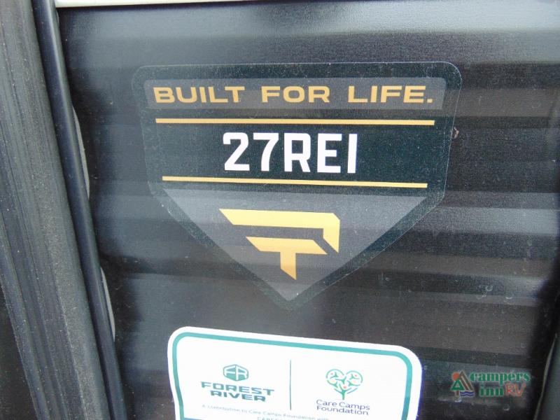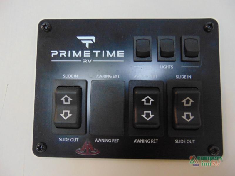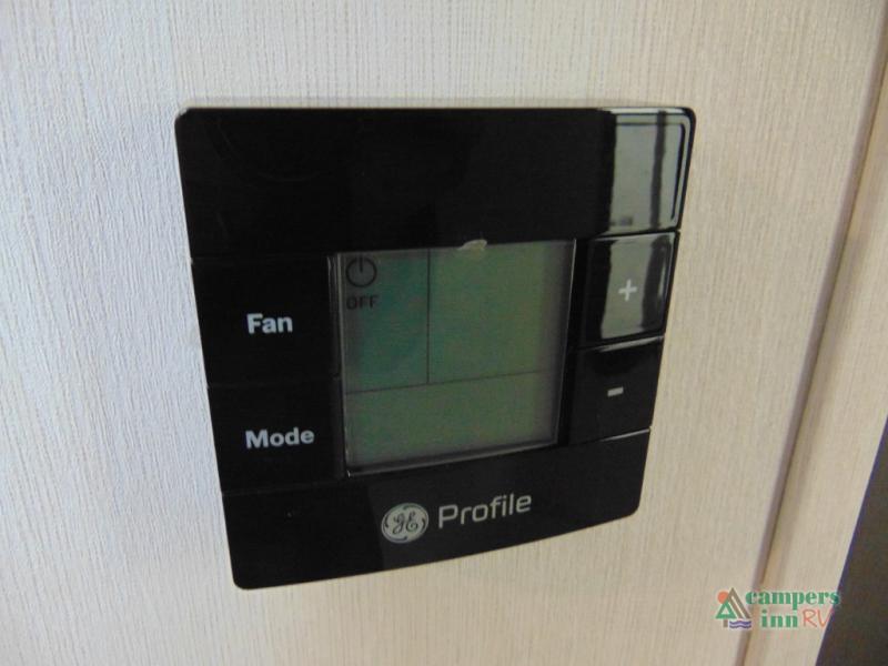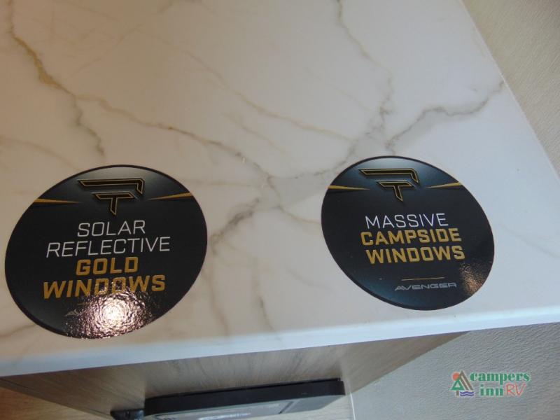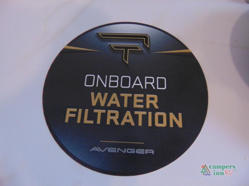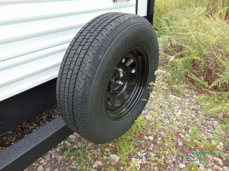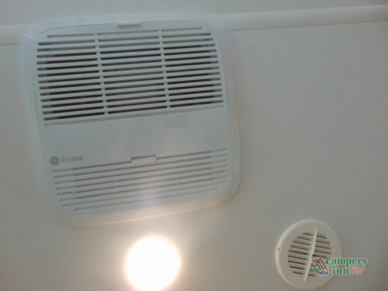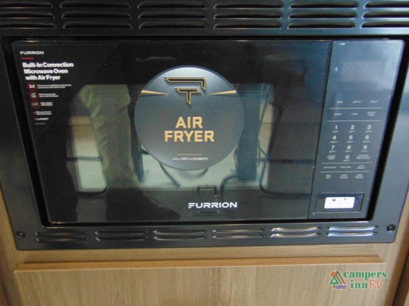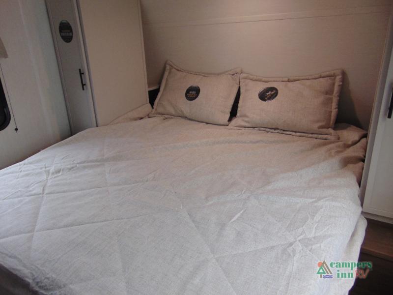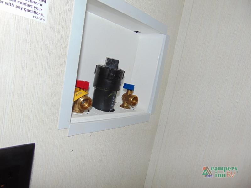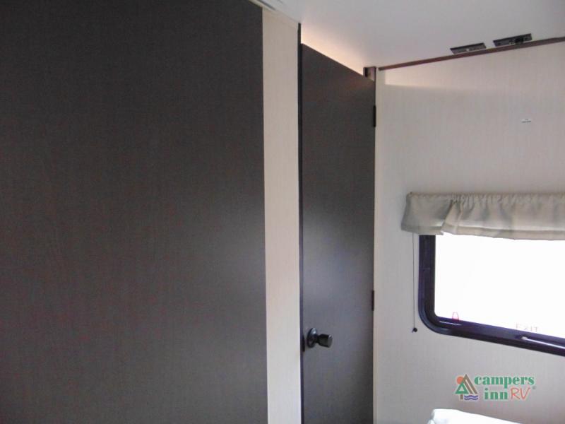 There is ample space to move about in this travel trailer thanks to the dual opposing slides! Here, you'll find an L-shaped sofa with a chaise lounge in direct view of TV and fireplace. There is also a hidden pantry behind the TV for snacks and movies! The center farm table includes four stools so you can gather around for meal times, and the desk with a chair will provide a place for you to get some work done if needed. This unit features a full bath towards the front private bedroom for easy access at night, and you're sure to get a great night's rest on the camp king bed!