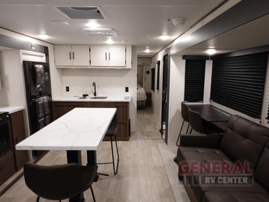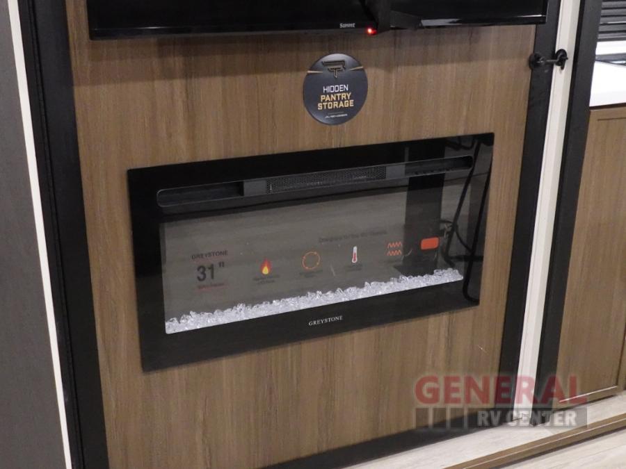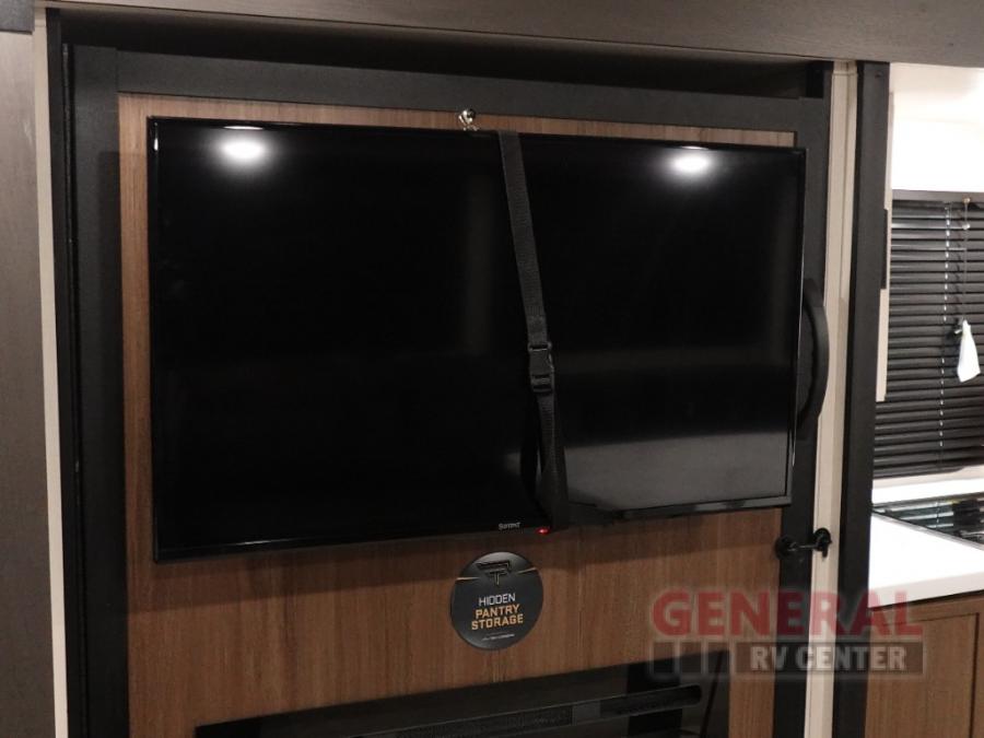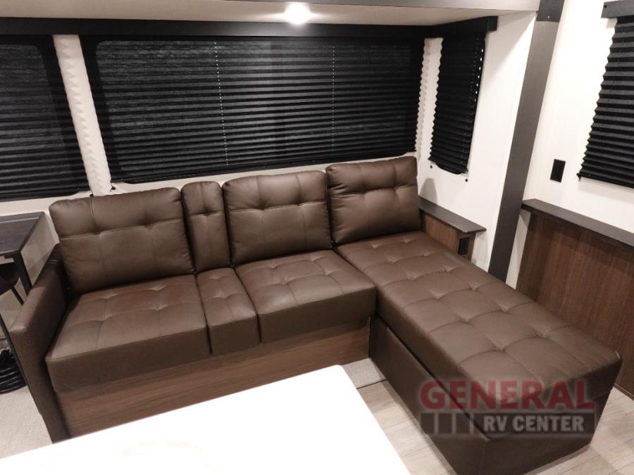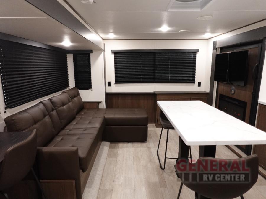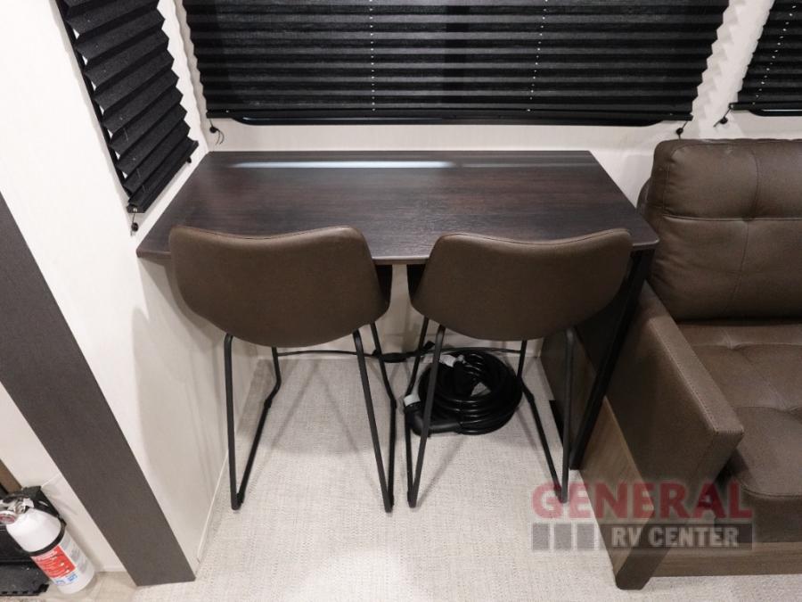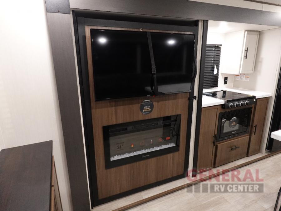There is ample space to move about in this travel trailer thanks to the dual opposing slides! Here, you'll find an L-shaped sofa with a chaise lounge in direct view of TV and fireplace. There is also a hidden pantry behind the TV for snacks and movies! The center farm table includes four stools so you can gather around for meal times, and the desk with a chair will provide a place for you to get some work done if needed. This unit features a full bath towards the front private bedroom for easy access at night, and you're sure to get a great night's rest on the camp king bed!