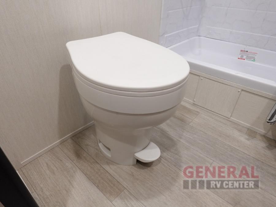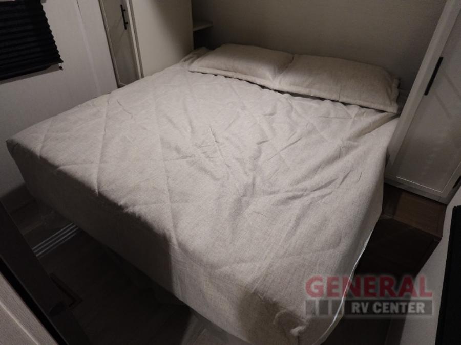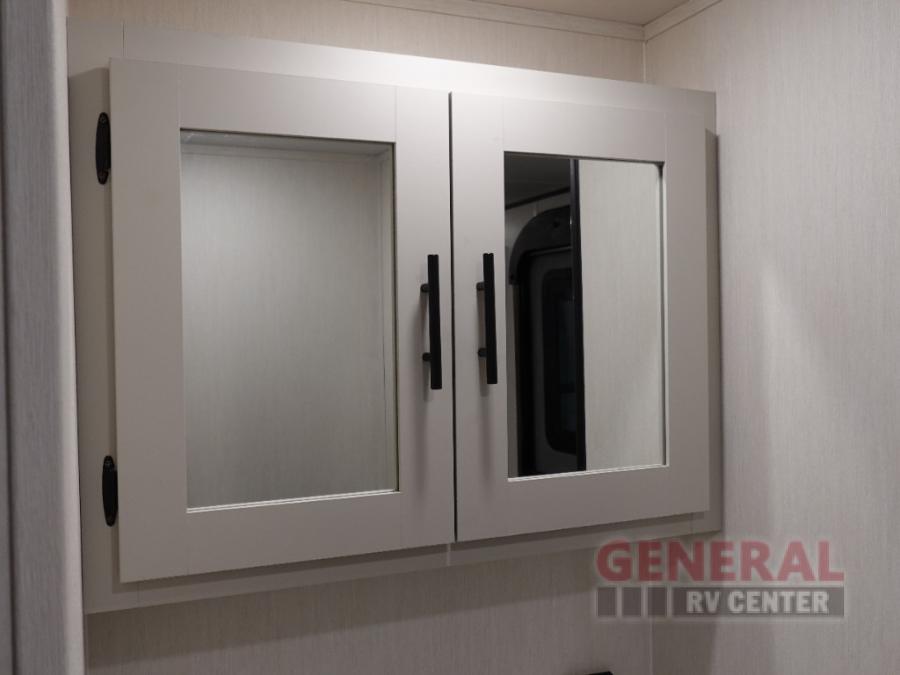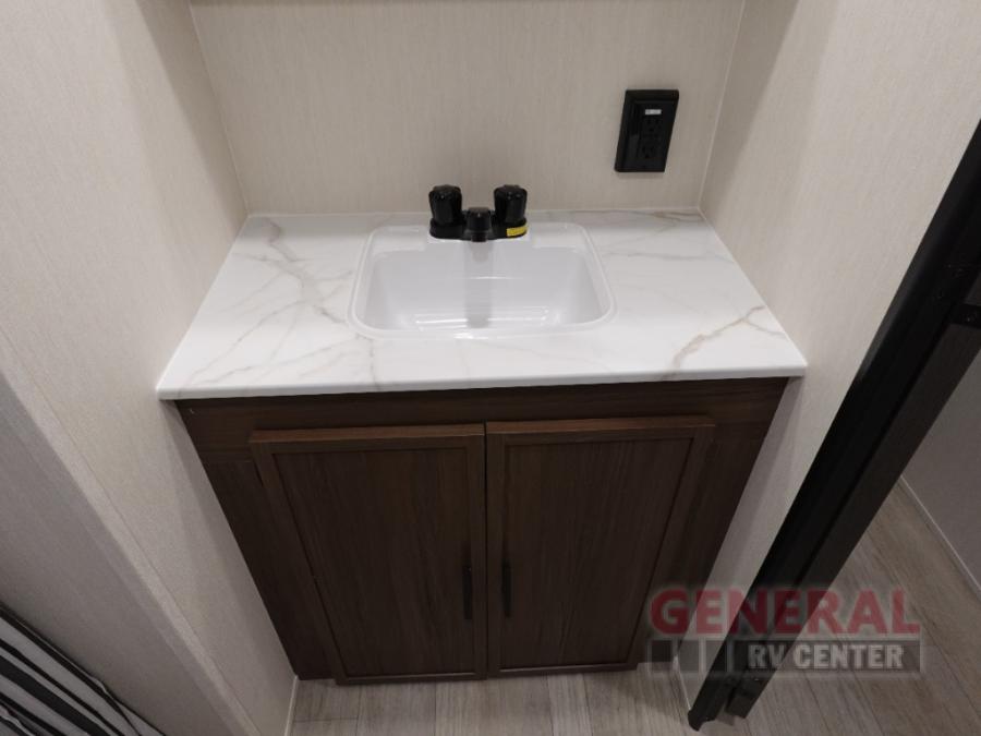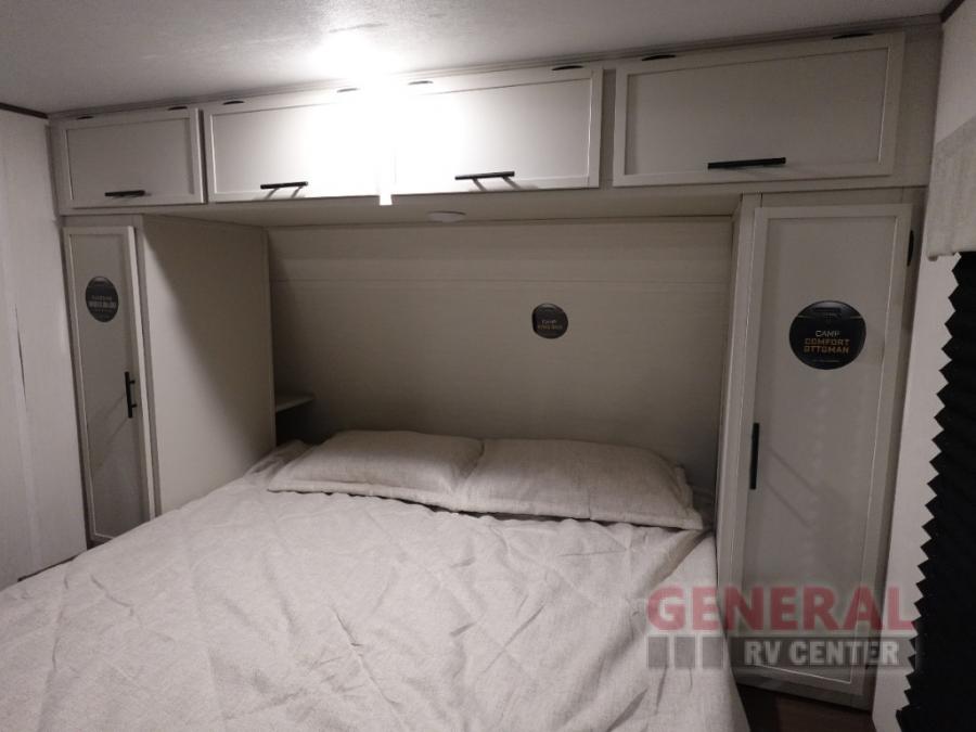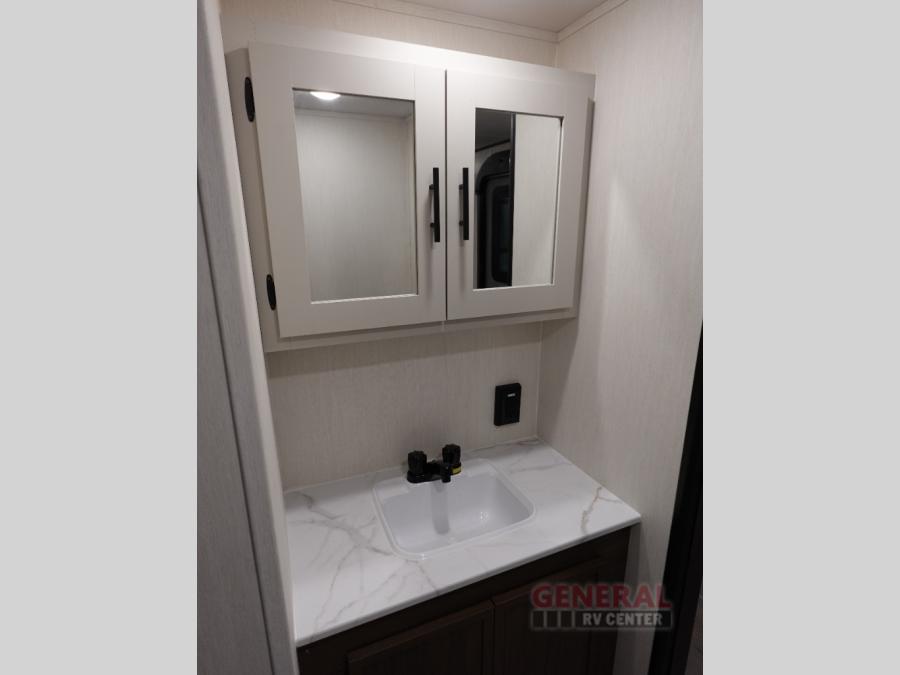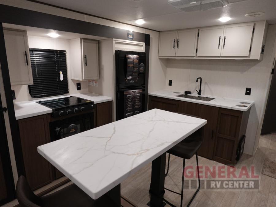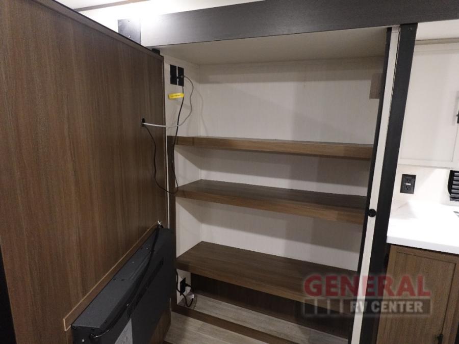 There is ample space to move about in this travel trailer thanks to the dual opposing slides! Here, you'll find an L-shaped sofa with a chaise lounge in direct view of TV and fireplace. There is also a hidden pantry behind the TV for snacks and movies! The center farm table includes four stools so you can gather around for meal times, and the desk with a chair will provide a place for you to get some work done if needed. This unit features a full bath towards the front private bedroom for easy access at night, and you're sure to get a great night's rest on the camp king bed!