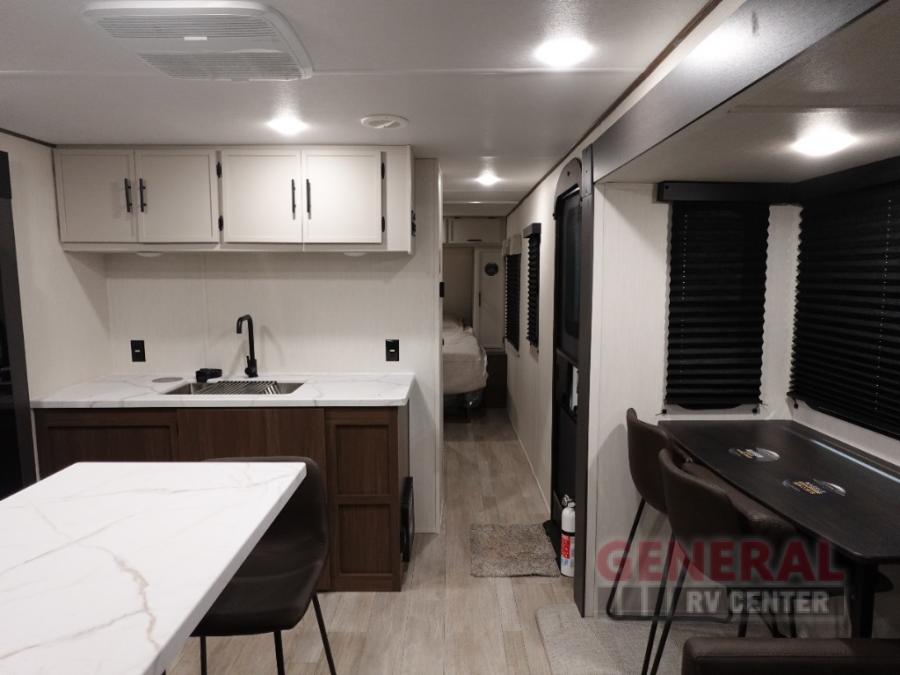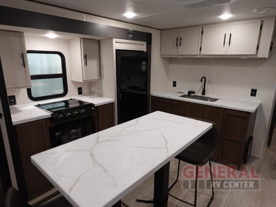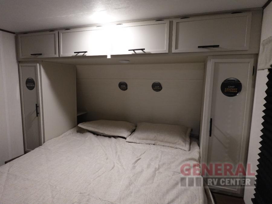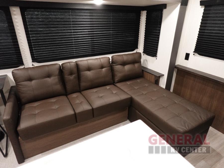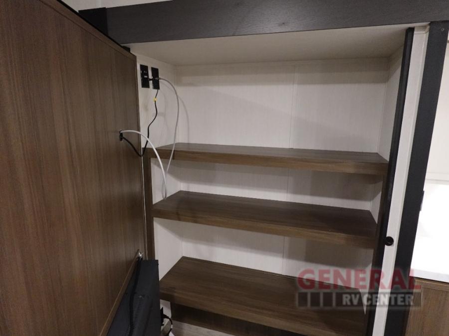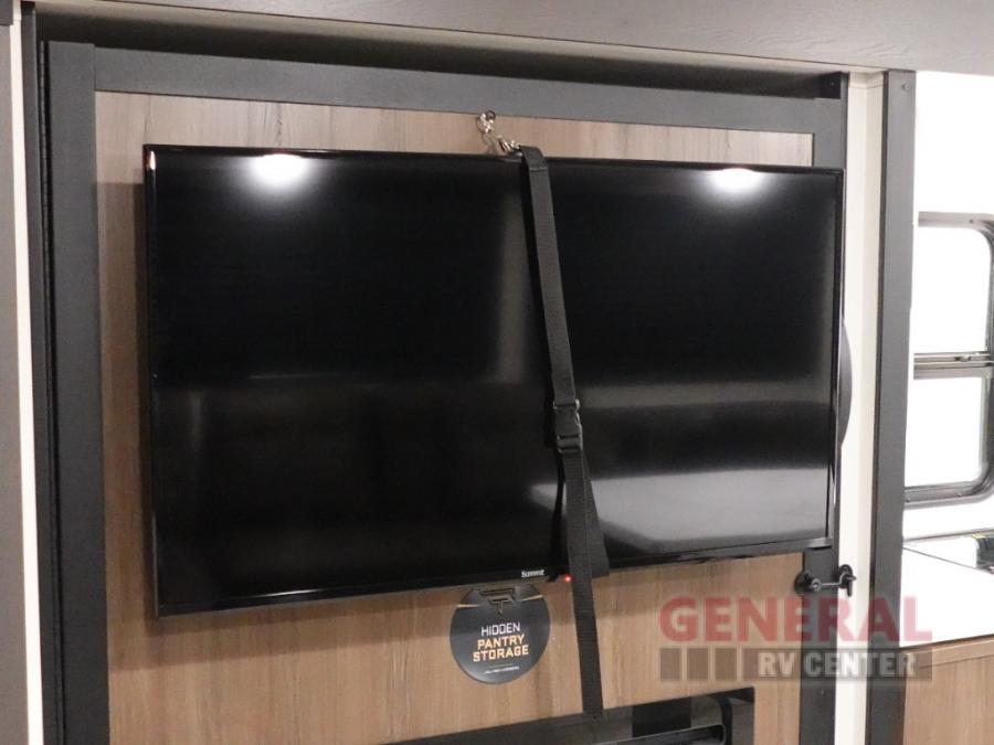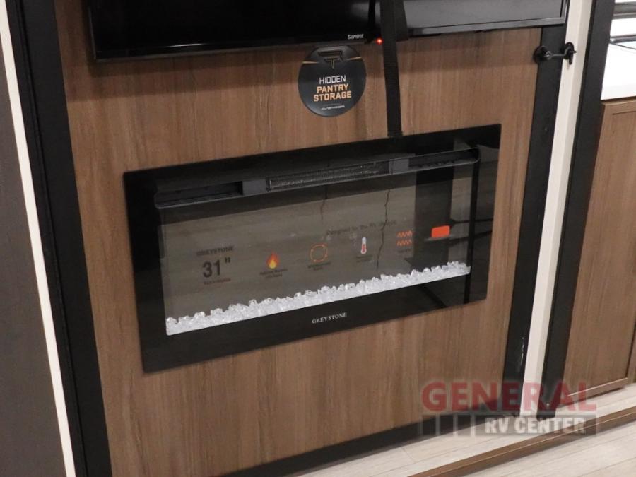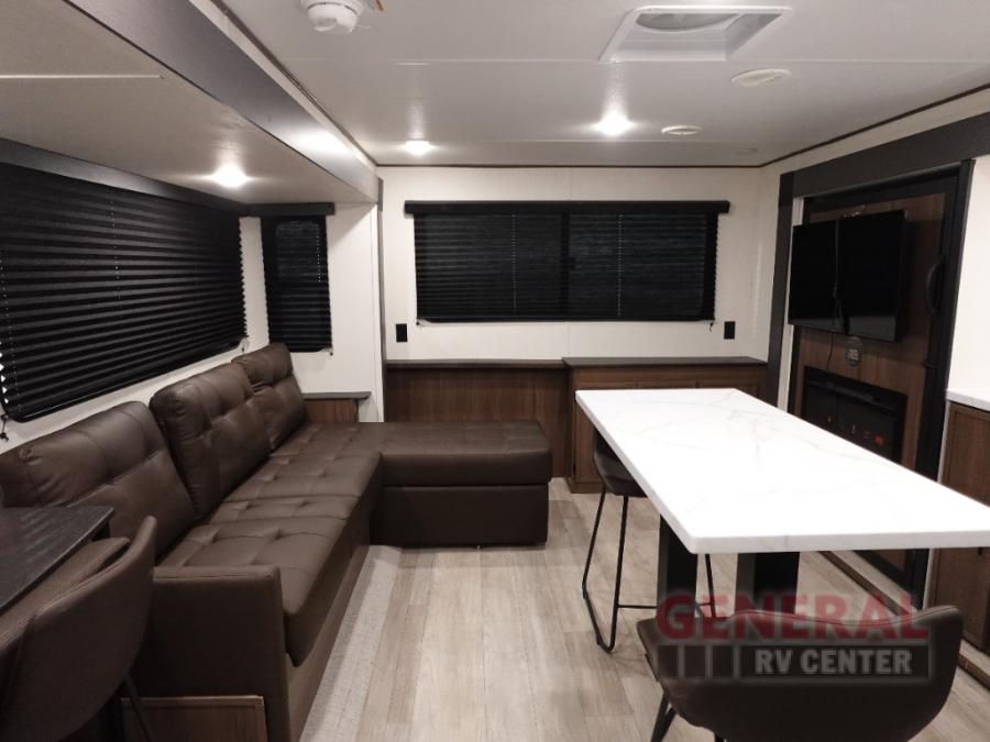 There is ample space to move about in this travel trailer thanks to the dual opposing slides! Here, you'll find an L-shaped sofa with a chaise lounge in direct view of TV and fireplace. There is also a hidden pantry behind the TV for snacks and movies! The center farm table includes four stools so you can gather around for meal times, and the desk with a chair will provide a place for you to get some work done if needed. This unit features a full bath towards the front private bedroom for easy access at night, and you're sure to get a great night's rest on the camp king bed!