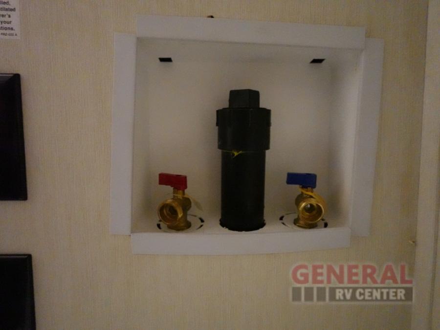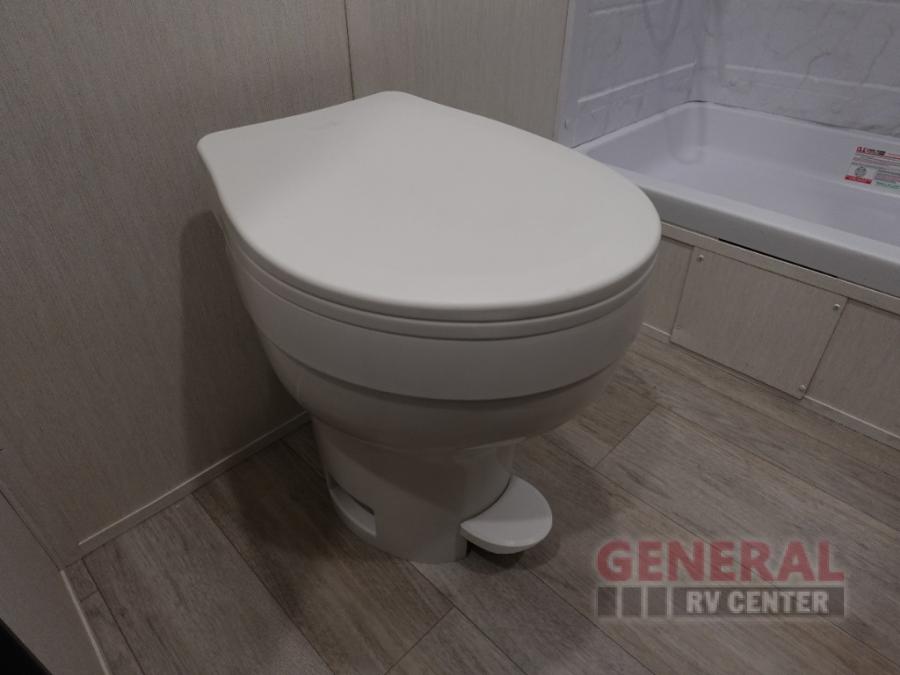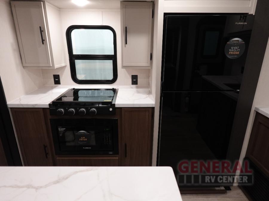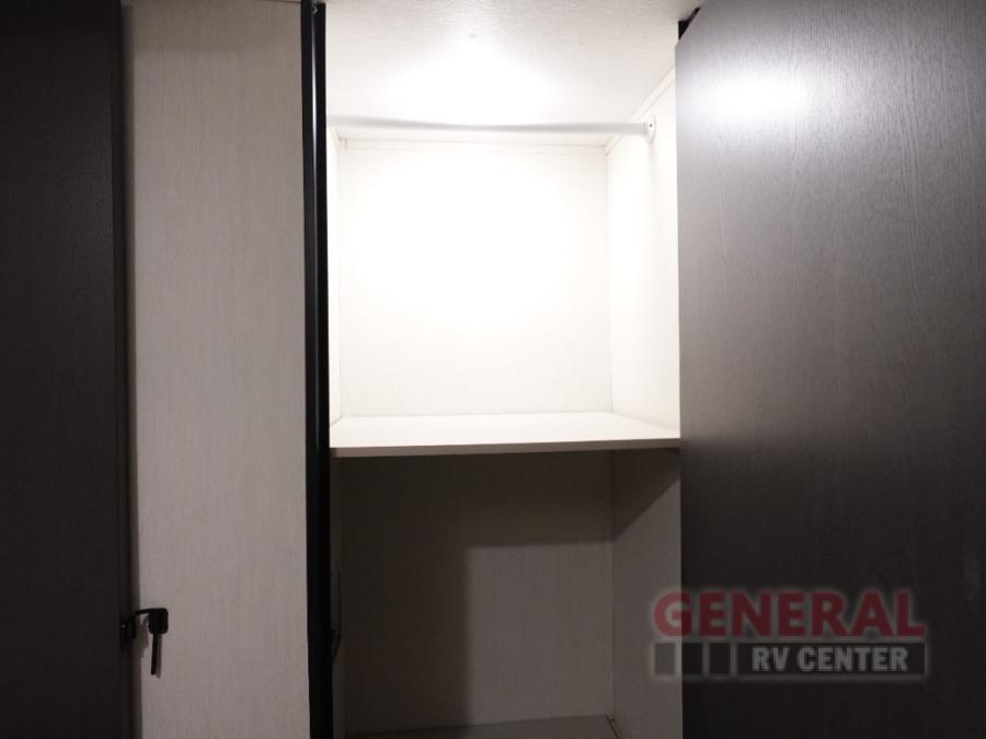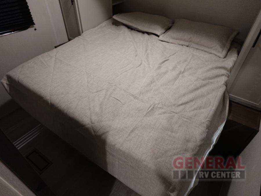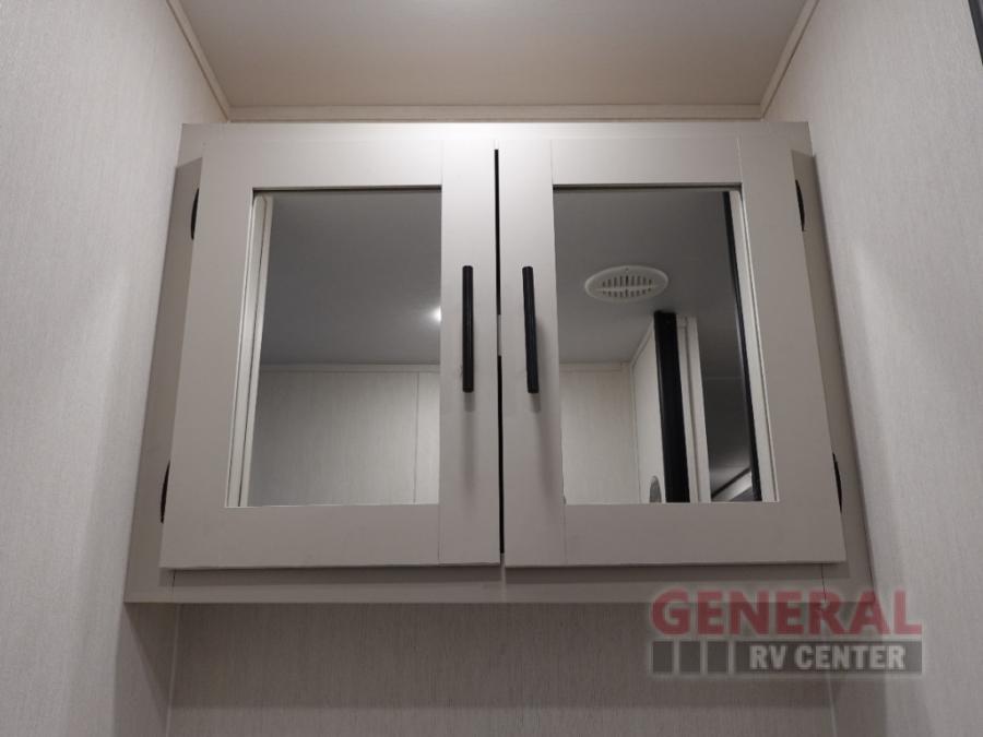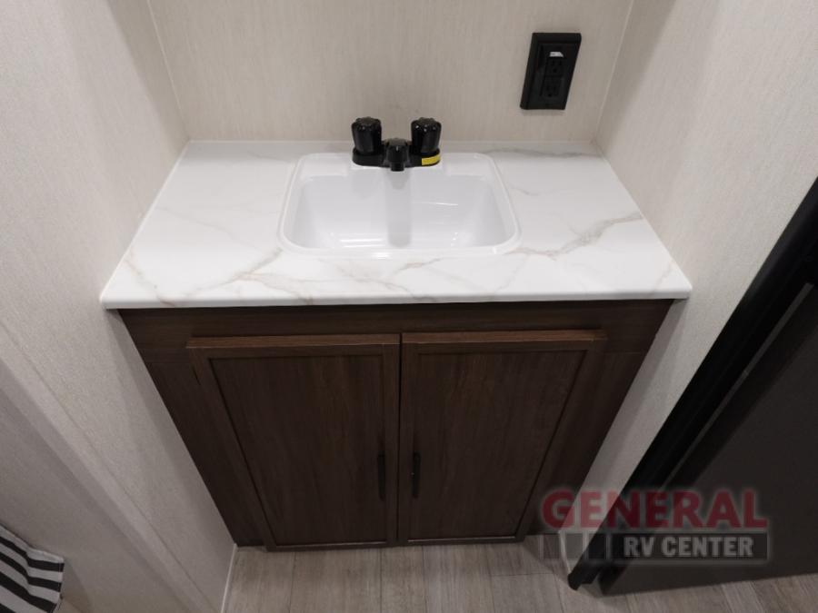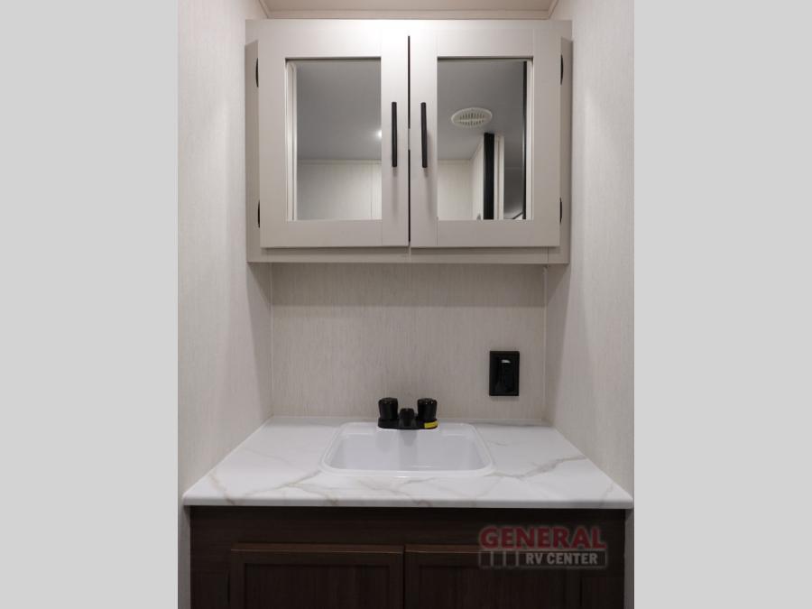 There is ample space to move about in this travel trailer thanks to the dual opposing slides! Here, you'll find an L-shaped sofa with a chaise lounge in direct view of TV and fireplace. There is also a hidden pantry behind the TV for snacks and movies! The center farm table includes four stools so you can gather around for meal times, and the desk with a chair will provide a place for you to get some work done if needed. This unit features a full bath towards the front private bedroom for easy access at night, and you're sure to get a great night's rest on the camp king bed!
