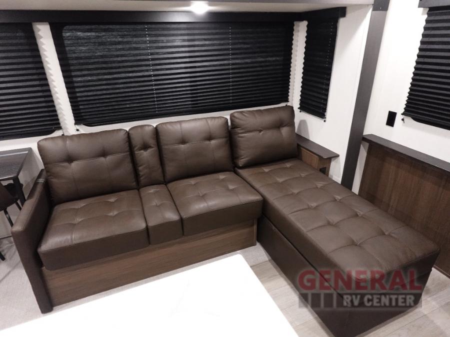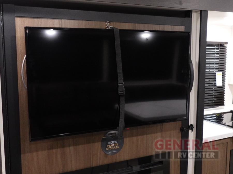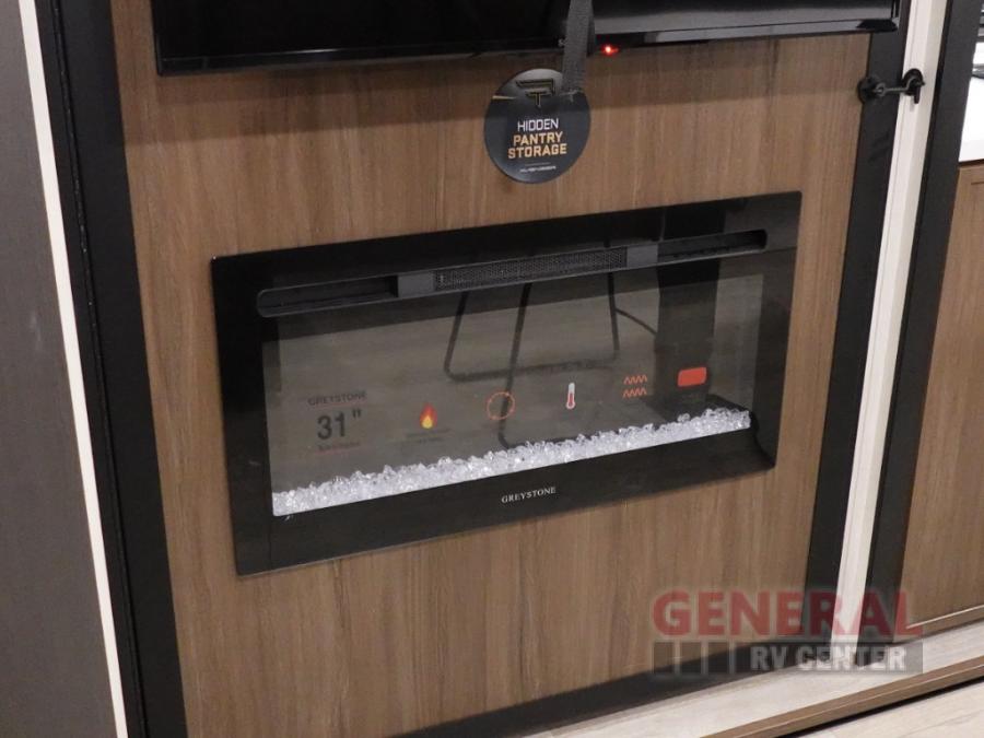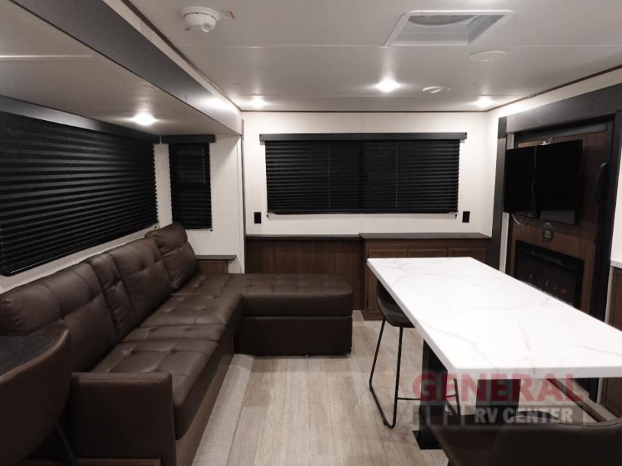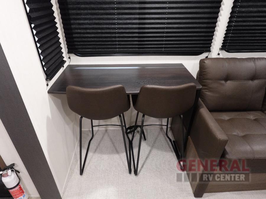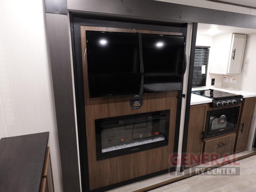 There is ample space to move about in this travel trailer thanks to the dual opposing slides! Here, you'll find an L-shaped sofa with a chaise lounge in direct view of TV and fireplace. There is also a hidden pantry behind the TV for snacks and movies! The center farm table includes four stools so you can gather around for meal times, and the desk with a chair will provide a place for you to get some work done if needed. This unit features a full bath towards the front private bedroom for easy access at night, and you're sure to get a great night's rest on the camp king bed!