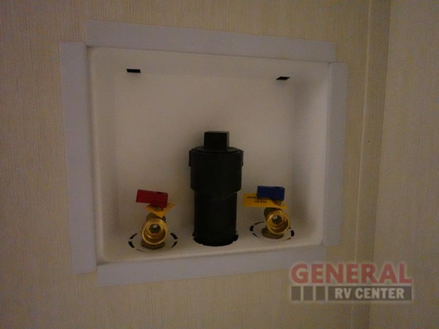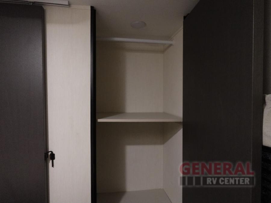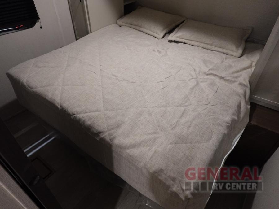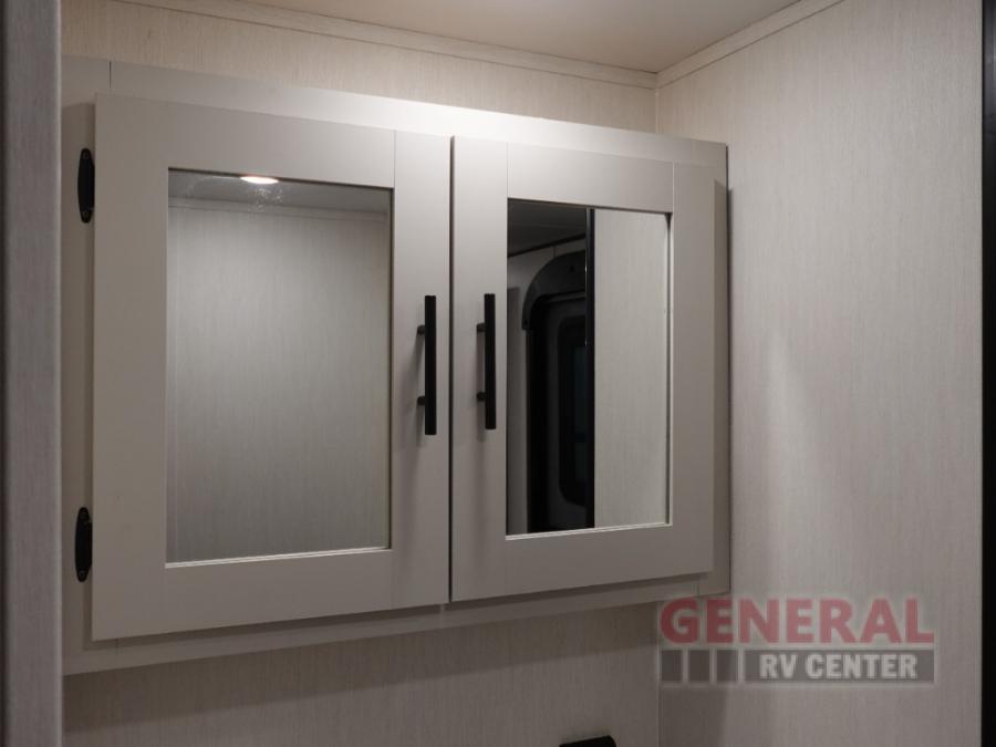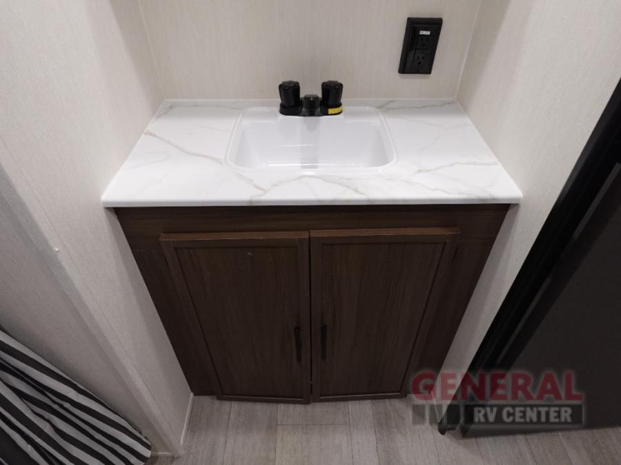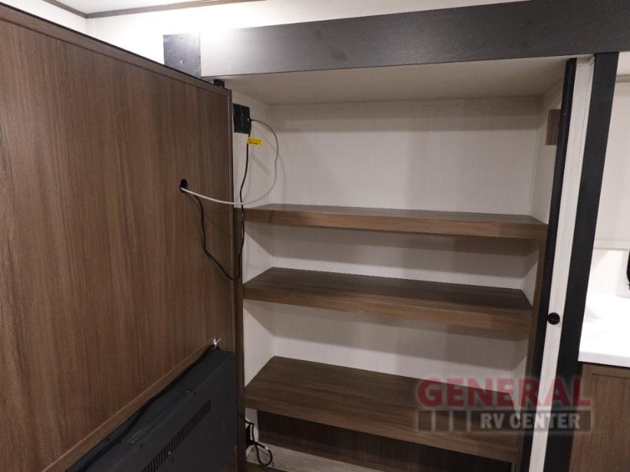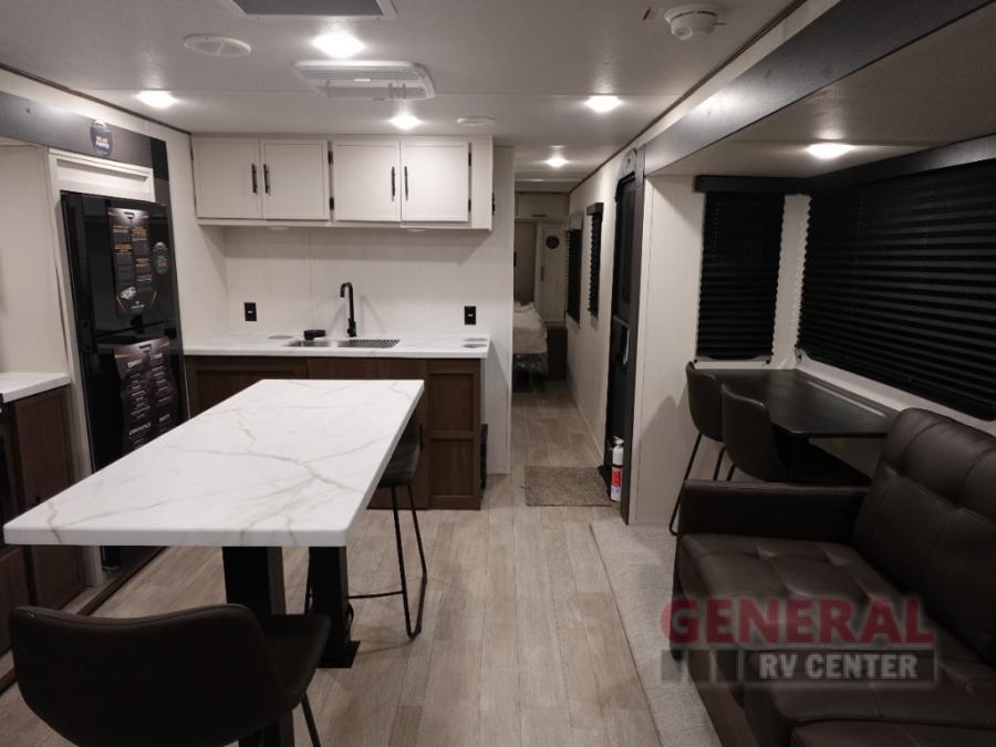 There is ample space to move about in this travel trailer thanks to the dual opposing slides! Here, you'll find an L-shaped sofa with a chaise lounge in direct view of TV and fireplace. There is also a hidden pantry behind the TV for snacks and movies! The center farm table includes four stools so you can gather around for meal times, and the desk with a chair will provide a place for you to get some work done if needed. This unit features a full bath towards the front private bedroom for easy access at night, and you're sure to get a great night's rest on the camp king bed!