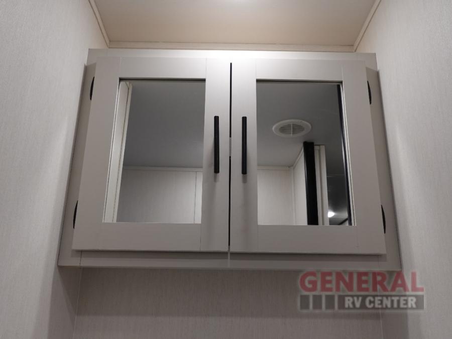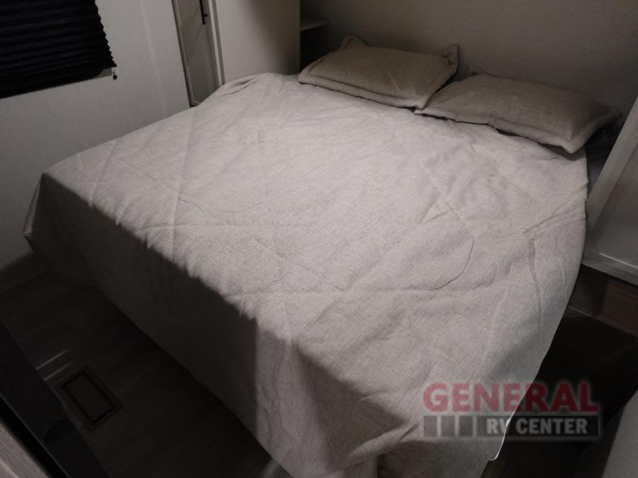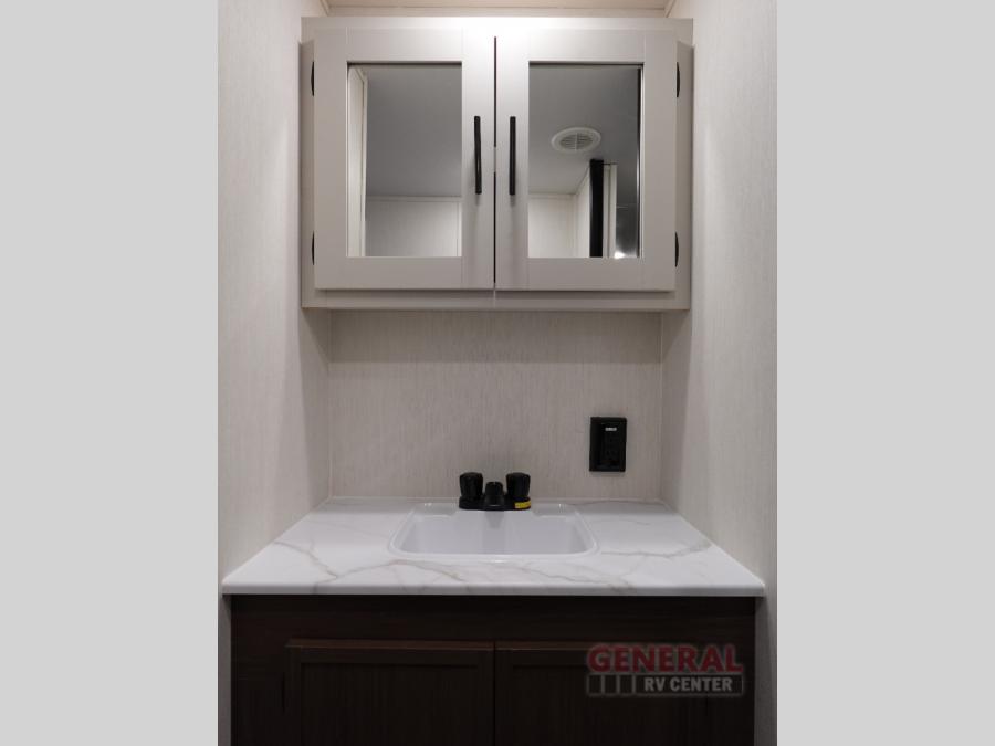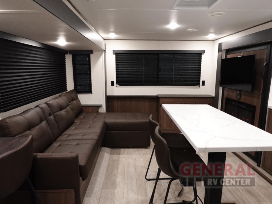 There is ample space to move about in this travel trailer thanks to the dual opposing slides! Here, you'll find an L-shaped sofa with a chaise lounge in direct view of TV and fireplace. There is also a hidden pantry behind the TV for snacks and movies! The center farm table includes four stools so you can gather around for meal times, and the desk with a chair will provide a place for you to get some work done if needed. This unit features a full bath towards the front private bedroom for easy access at night, and you're sure to get a great night's rest on the camp king bed!