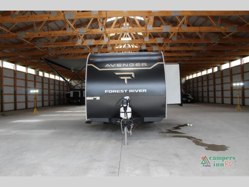 With any Avenger LT travel trailer by Prime Time, the exterior includes an aerodynamic smooth front metal, a front diamond plate for protection on the road, and two stabilizer jacks. There is also exclusive Everlast construction, a PVC roof membrane, and solar prep for the option to go off-grid. The interior offers seamless Carefree Congoleum flooring for easy cleanup and durability, pleated night shades throughout for privacy, a bottle opener, and residential extended ball bearing drawer guides.