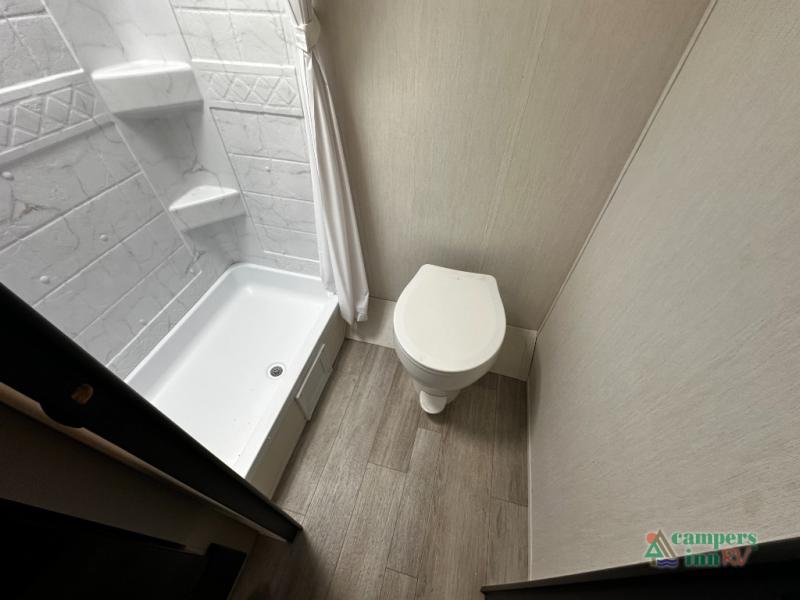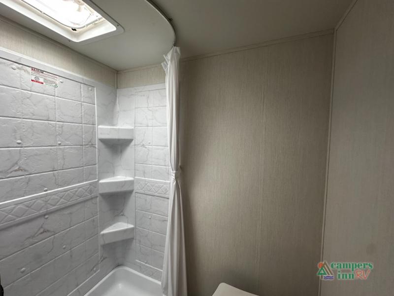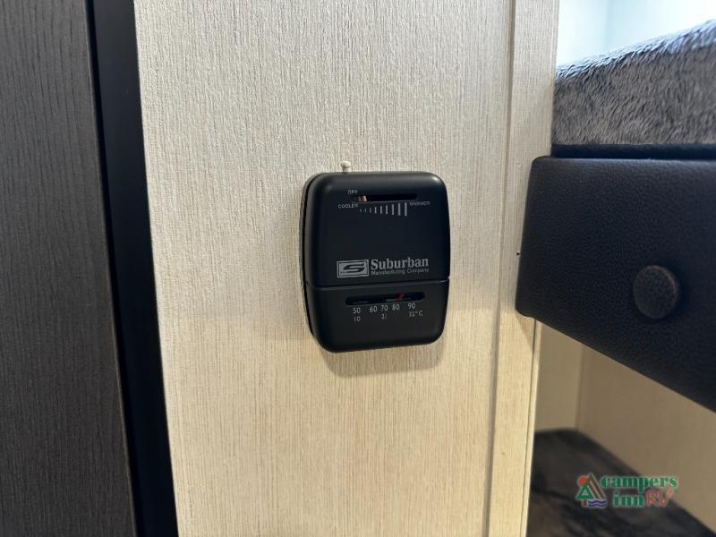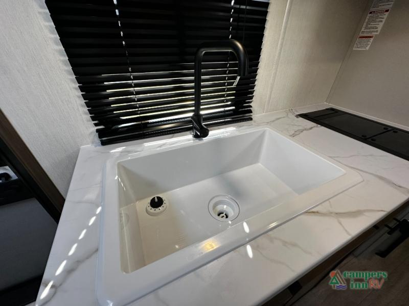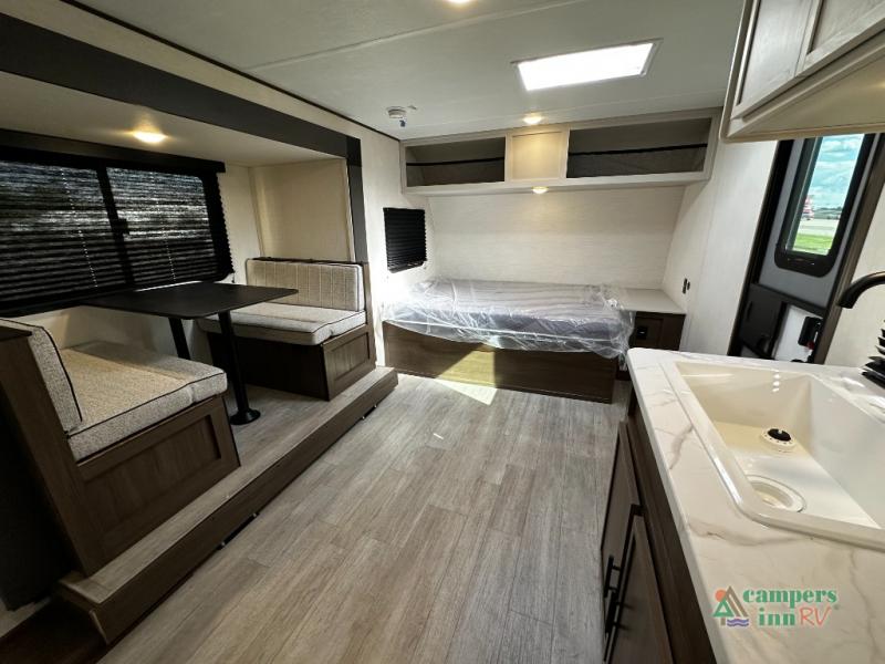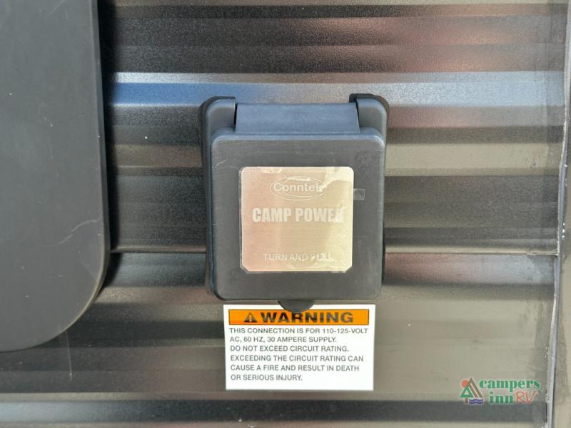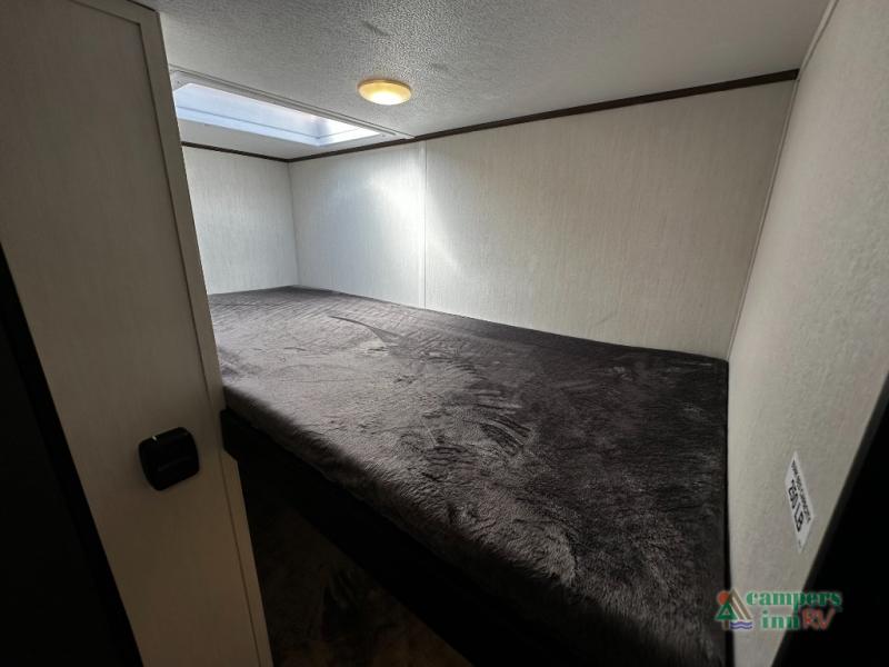 Go hiking, biking or exploring for new places when you have this trailer at the campgrounds! You will find sleeping for five between the rear corner bunk beds, and the front bed with a nightstand for your cellphones and such. And one more can sleep on the dinette slide. You'll be delighted with the kitchen skylight that gives natural lighting as you cook a meal. The LED-lit power awning provides a protected outdoor living area as you visit or make s'mores around the campfire.