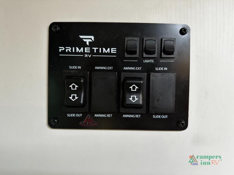 With any Avenger LT travel trailer by Prime Time, the exterior includes an aerodynamic smooth front metal, a front diamond plate for protection on the road, and two stabilizer jacks. There is also exclusive Everlast construction, a PVC roof membrane, and solar prep for the option to go off-grid. The interior offers seamless Carefree Congoleum flooring for easy cleanup and durability, pleated night shades throughout for privacy, a bottle opener, and residential extended ball bearing drawer guides.