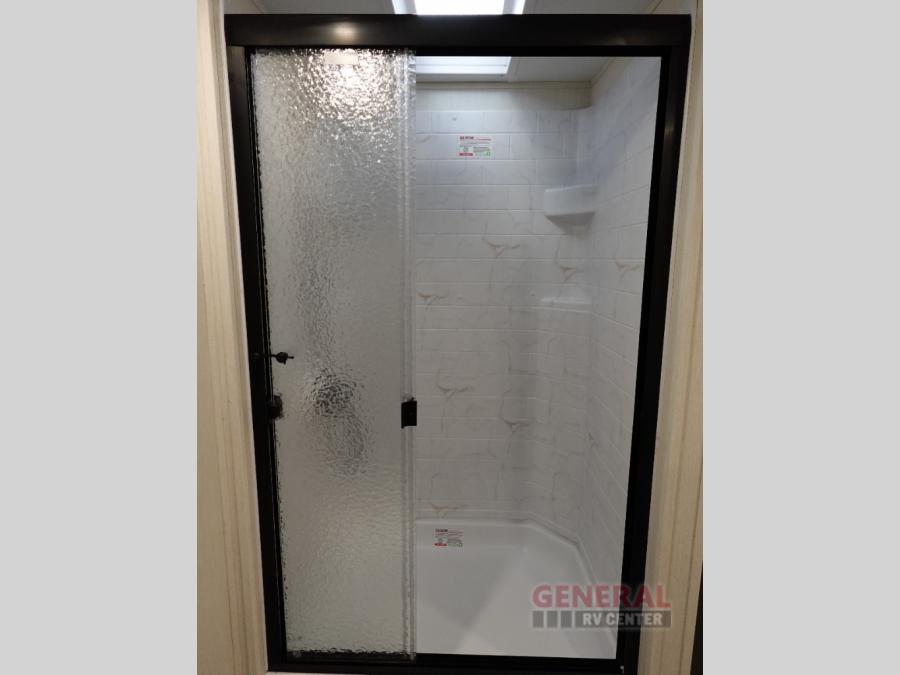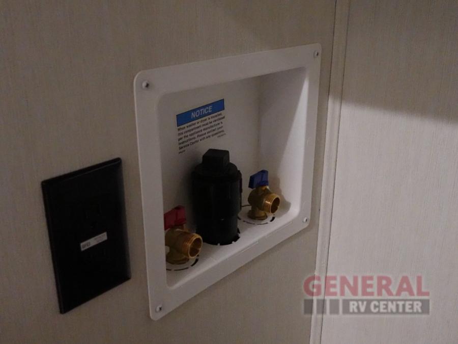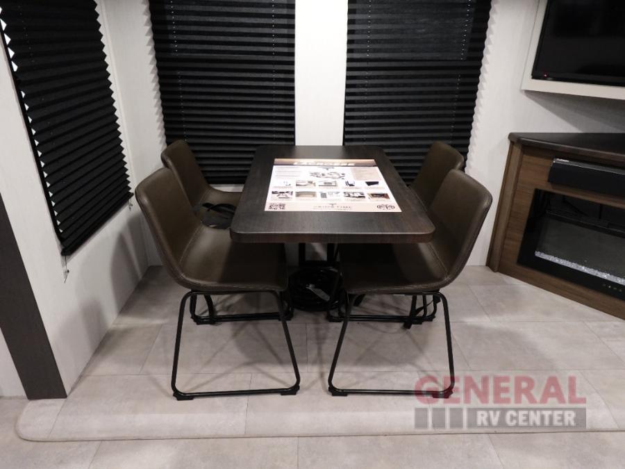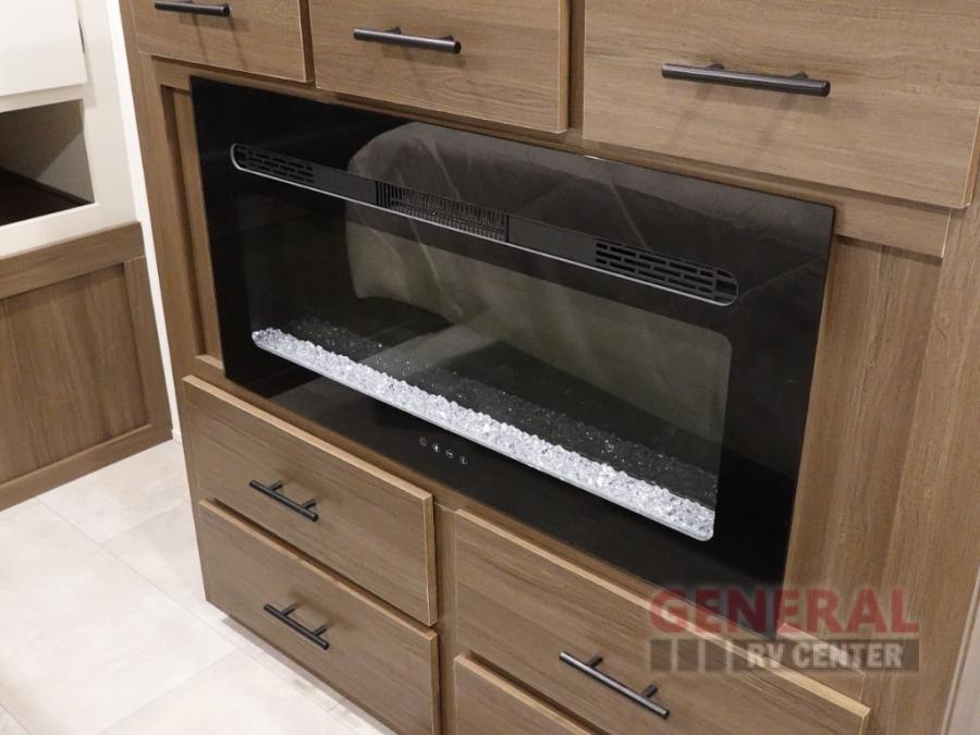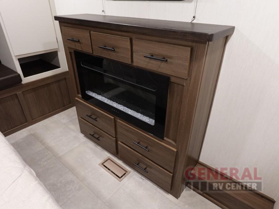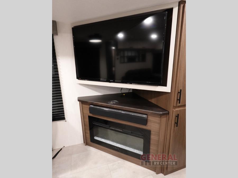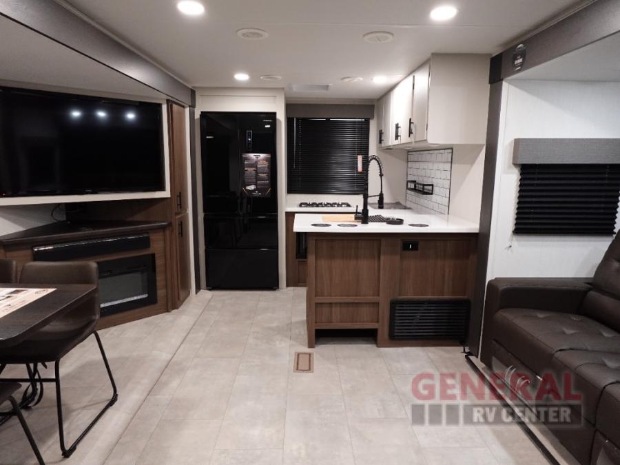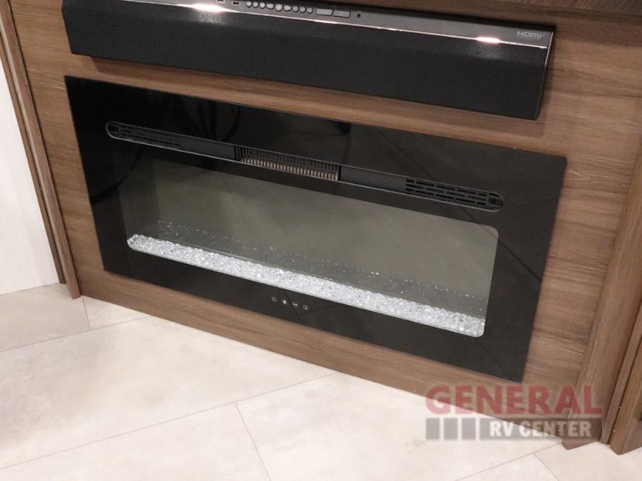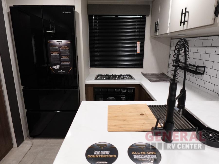 You will be ultra impressed by this LaCrosse travel trailer! First, the interior is made to feel just like your own home with its theater seating, hide-a-bed sofa, free-standing table with chairs, and entertainment center with 50" LED TV and fireplace. Second, you'll find even more residential comfort in the rear kitchen that has a three burner cooktop, a 30" microwave oven, and a 16.2 cubic foot 12V refrigerator. And lastly, the walk-through bathroom has two doors on either side with one of those doors leading directly into the front private bedroom, so you know you'll enjoy great comfort in this space each night. There is also a bedroom bench at the front of this trailer which gives you an enjoyable place to relax as you take in the views from the front windshield