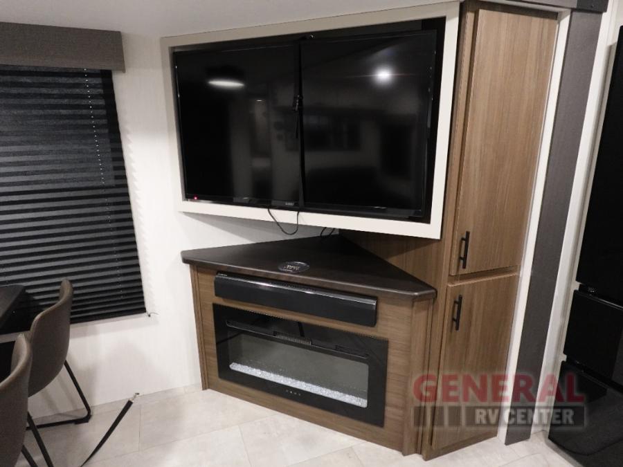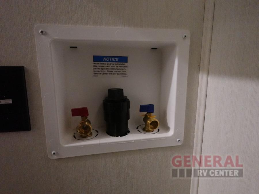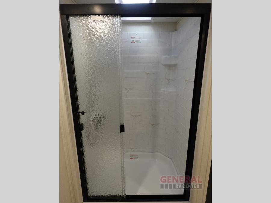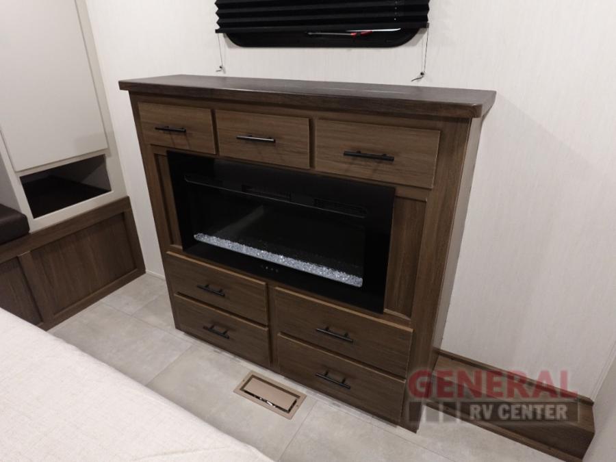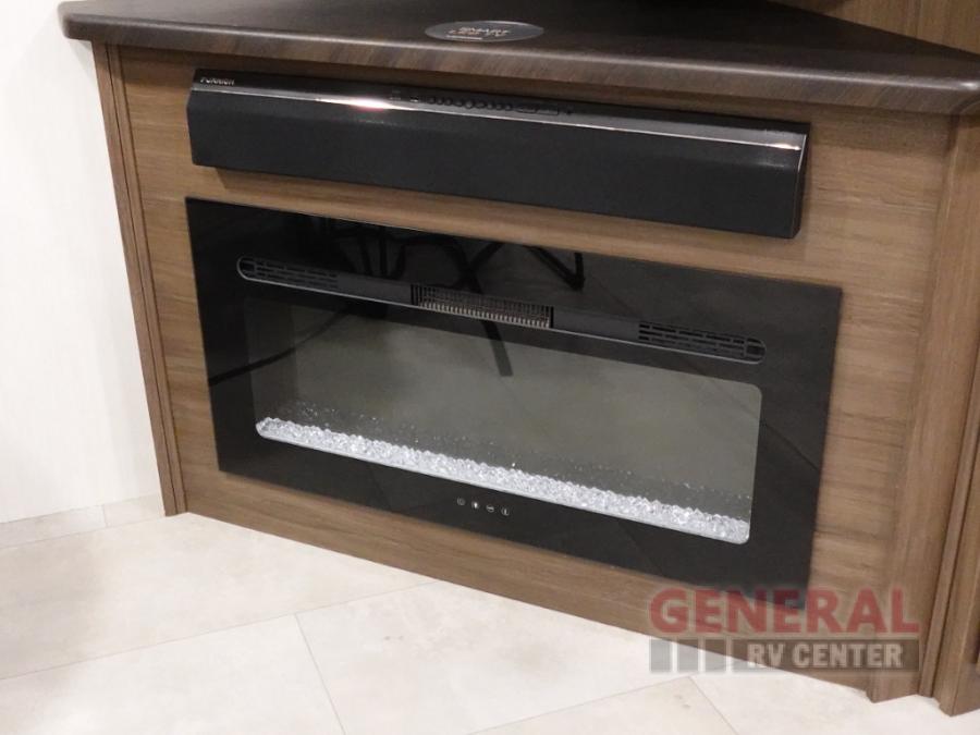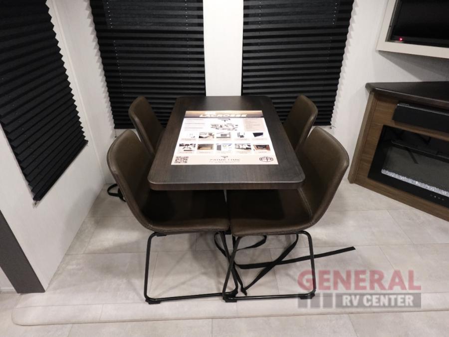 You will be ultra impressed by this LaCrosse travel trailer! First, the interior is made to feel just like your own home with its theater seating, hide-a-bed sofa, free-standing table with chairs, and entertainment center with 50" LED TV and fireplace. Second, you'll find even more residential comfort in the rear kitchen that has a three burner cooktop, a 30" microwave oven, and a 16.2 cubic foot 12V refrigerator. And lastly, the walk-through bathroom has two doors on either side with one of those doors leading directly into the front private bedroom, so you know you'll enjoy great comfort in this space each night. There is also a bedroom bench at the front of this trailer which gives you an enjoyable place to relax as you take in the views from the front windshield