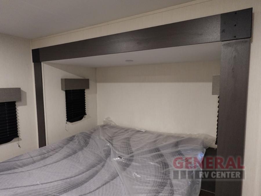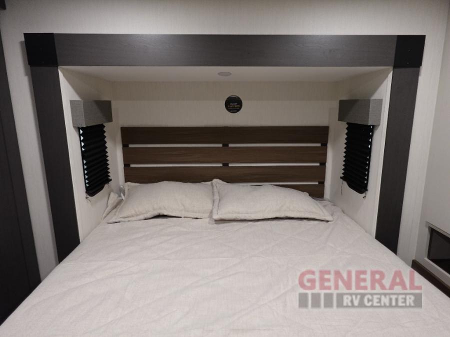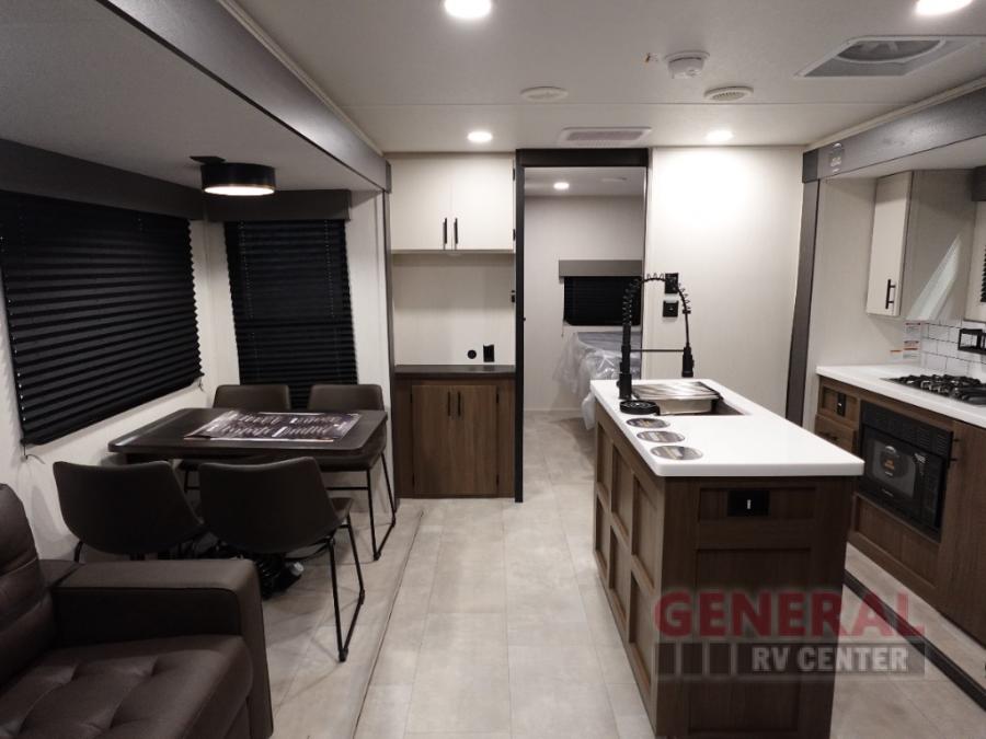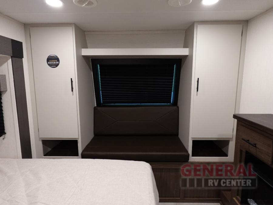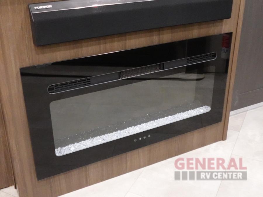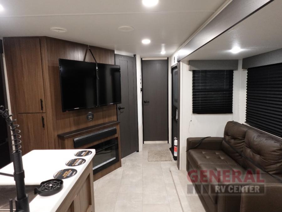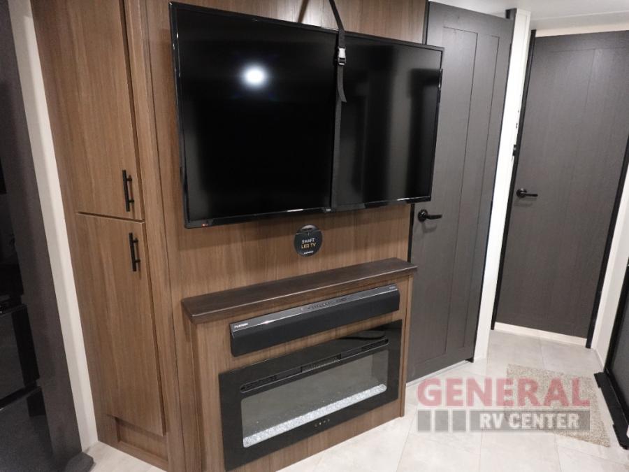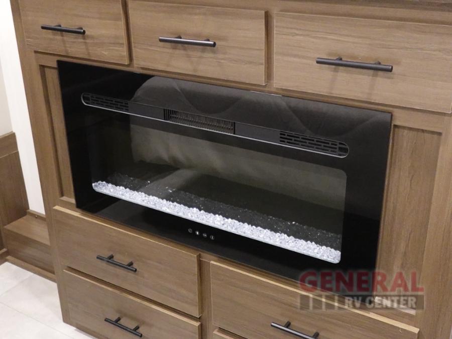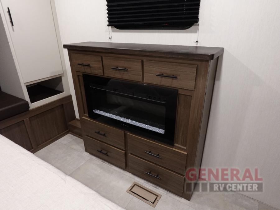 Privacy abounds in this travel trailer with a bedroom at each end! A king bed slide in the front has its own fireplace for cozy nights. Dual wardrobes frame the reading bench which looks out the front window for peaceful moments appreciating the view. At the rear, a second bedroom with queen bed has its own half bath. A pantry closet here also has prep for an optional washer/dryer for convenience on the road. In the center everyone can meet up in the spacious kitchen/living room. A hide-a-bed sofa has even more sleeping space, or relax there and watch the TV which is in the entertainment center along with another fireplace. The kitchen is well-equipped with a three-burner cooktop, microwave, and even an island where the sink is located for easy meal prep. Outside there are not one but two 10' power awnings for extra protection from the elements!