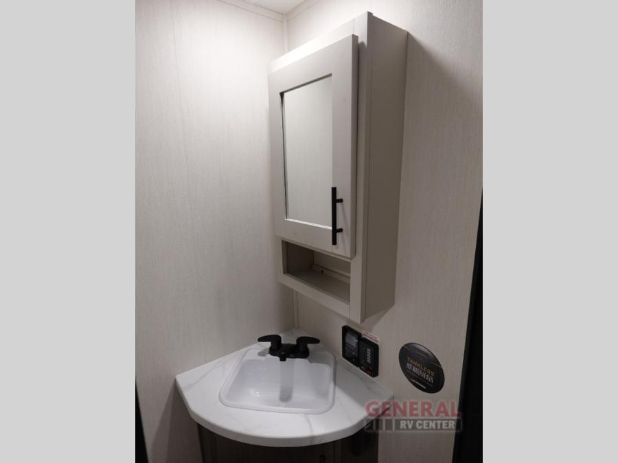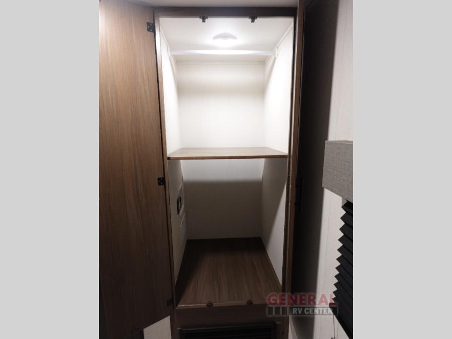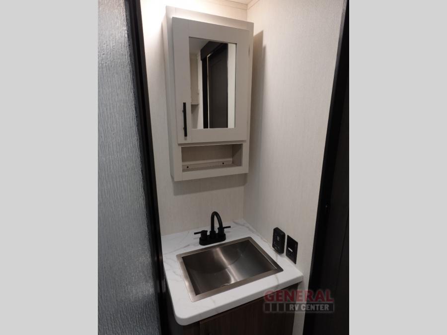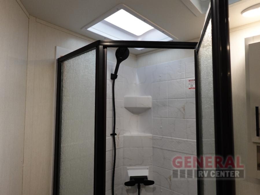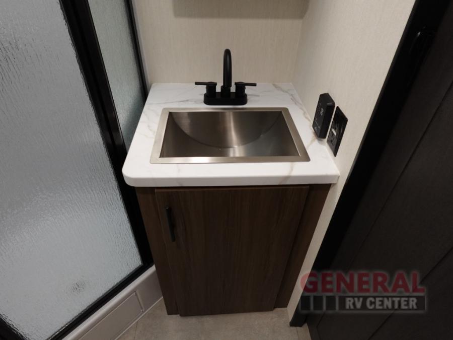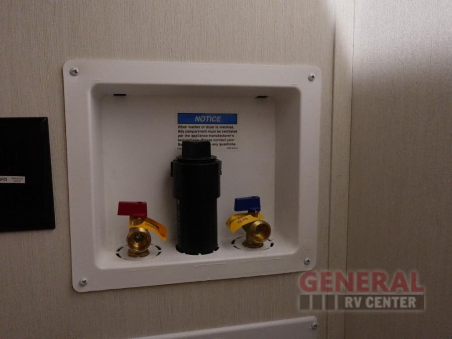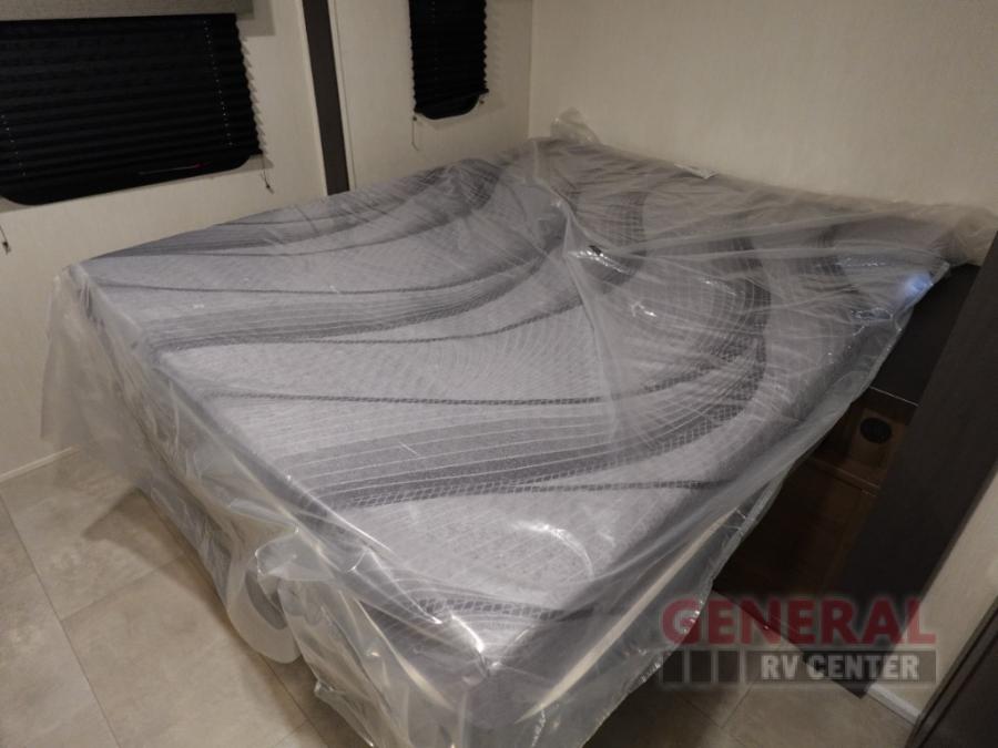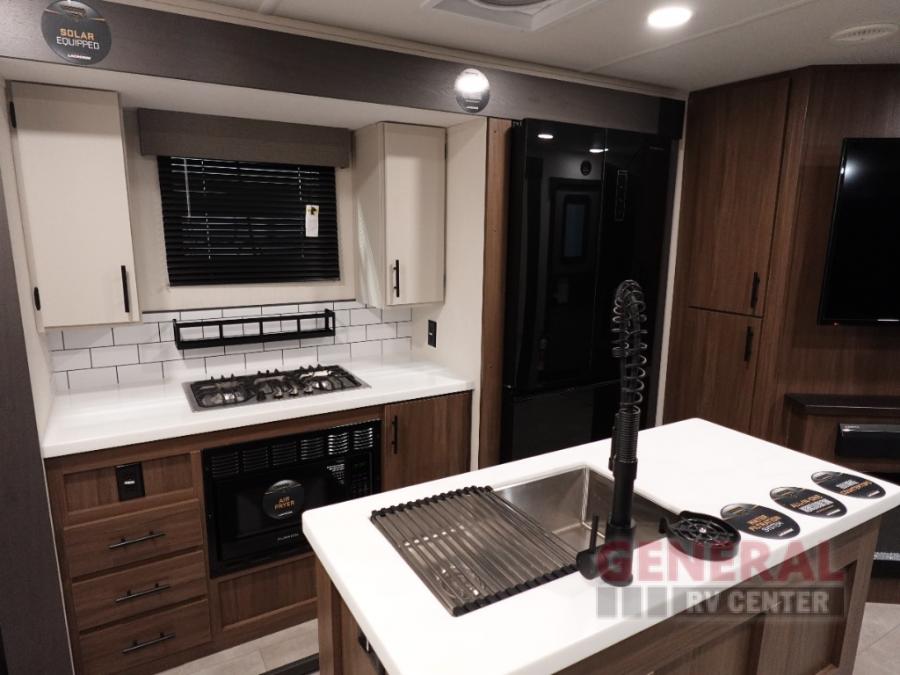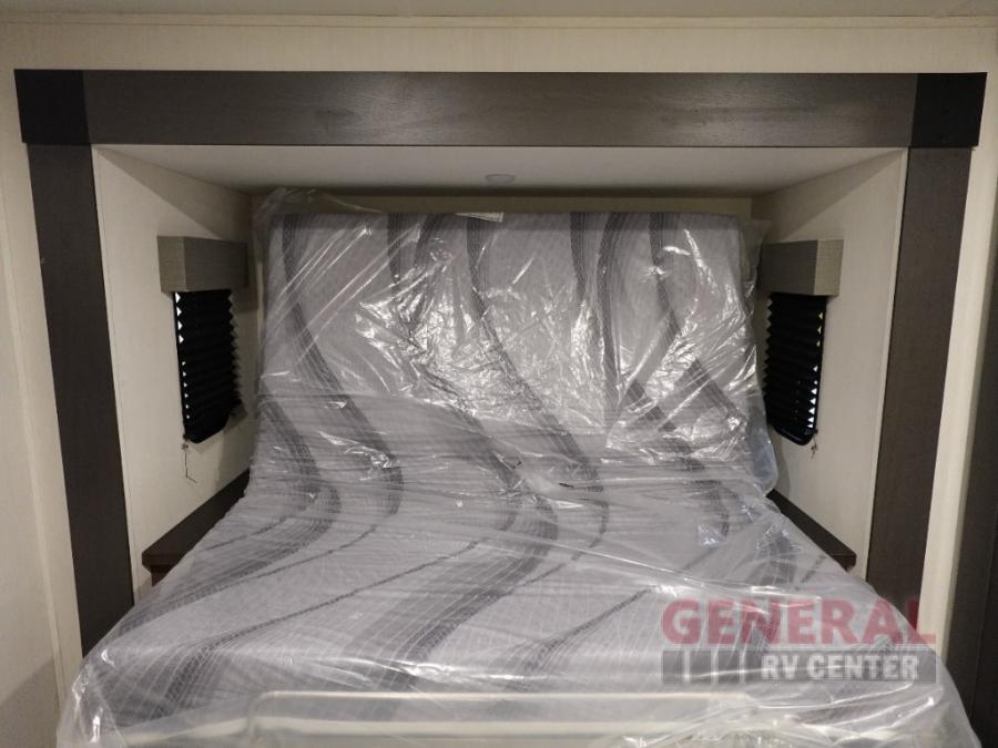 Privacy abounds in this travel trailer with a bedroom at each end! A king bed slide in the front has its own fireplace for cozy nights. Dual wardrobes frame the reading bench which looks out the front window for peaceful moments appreciating the view. At the rear, a second bedroom with queen bed has its own half bath. A pantry closet here also has prep for an optional washer/dryer for convenience on the road. In the center everyone can meet up in the spacious kitchen/living room. A hide-a-bed sofa has even more sleeping space, or relax there and watch the TV which is in the entertainment center along with another fireplace. The kitchen is well-equipped with a three-burner cooktop, microwave, and even an island where the sink is located for easy meal prep. Outside there are not one but two 10' power awnings for extra protection from the elements!