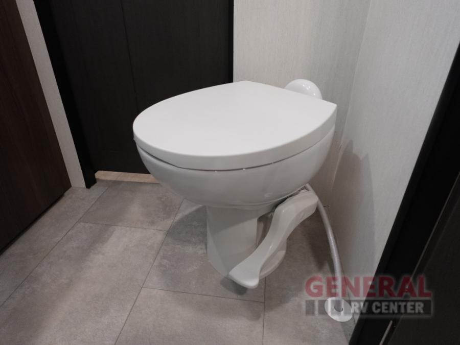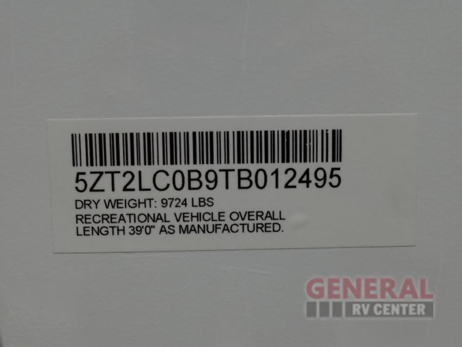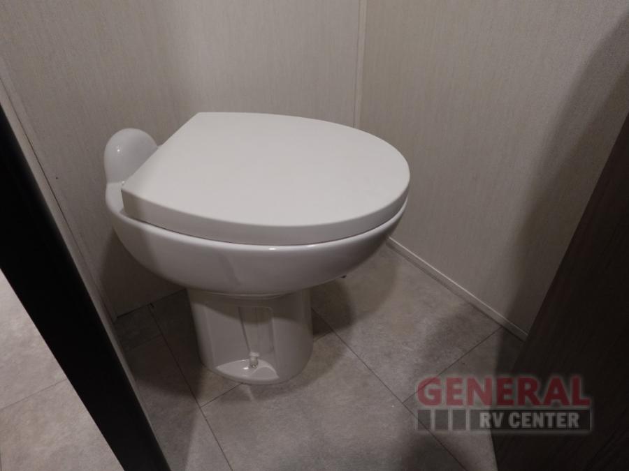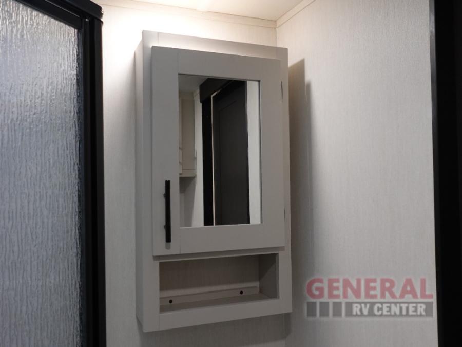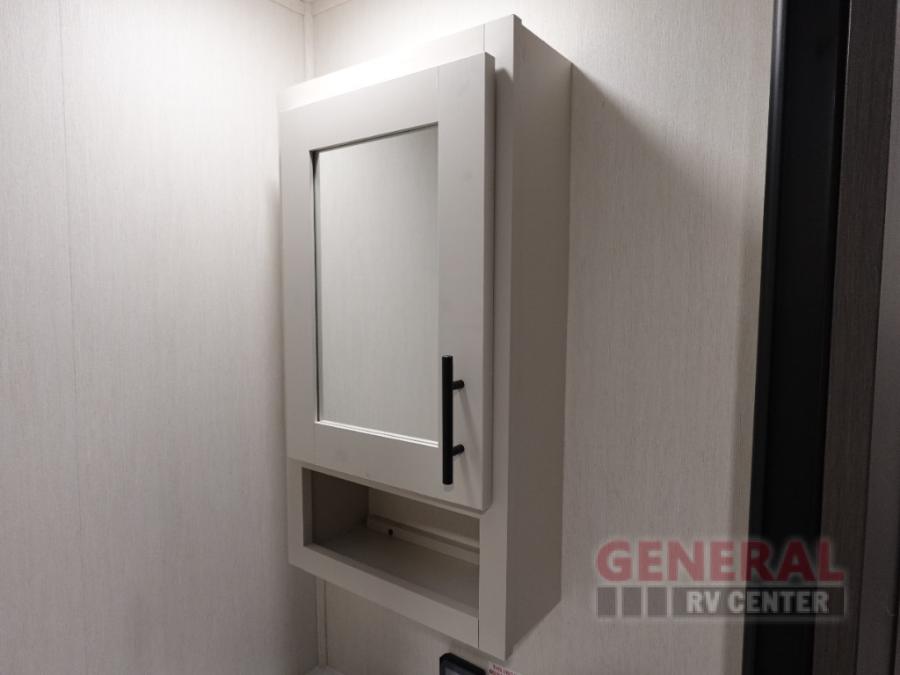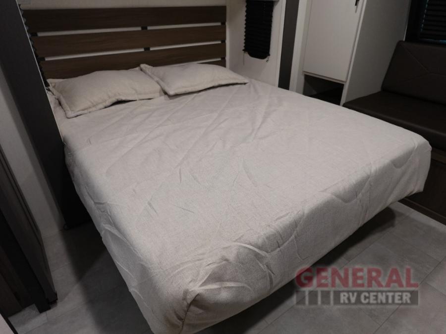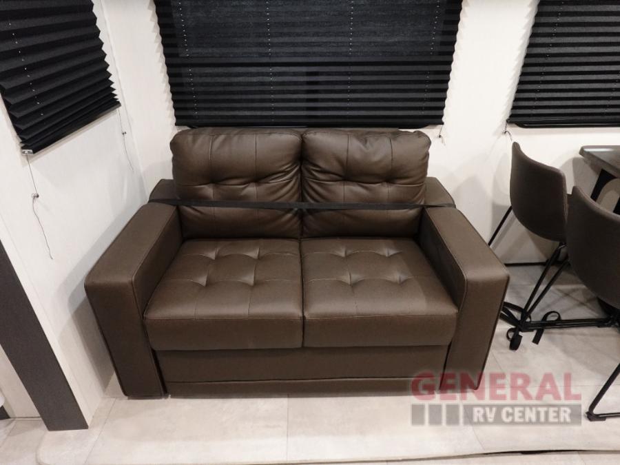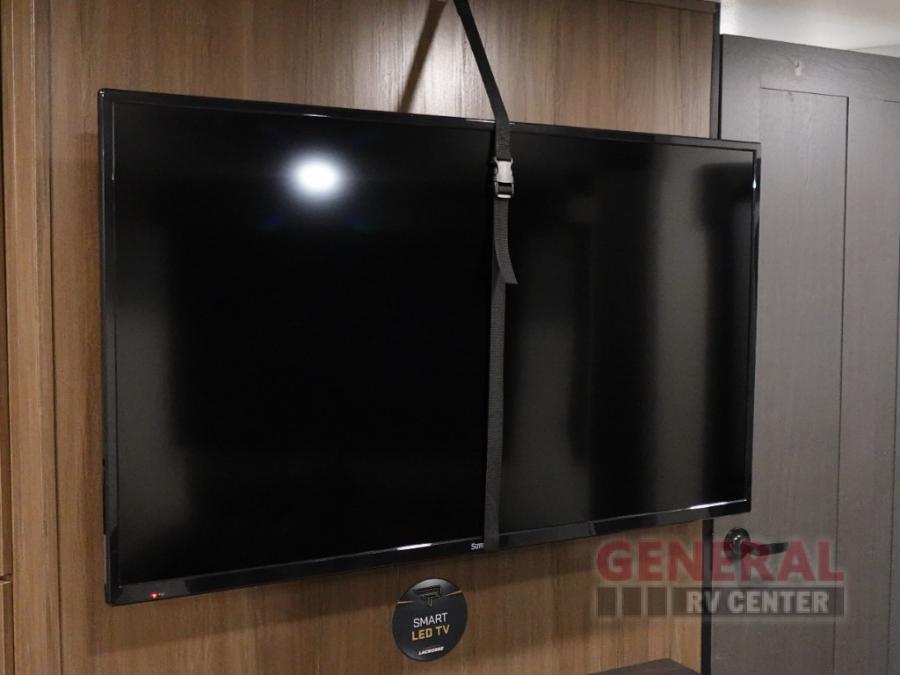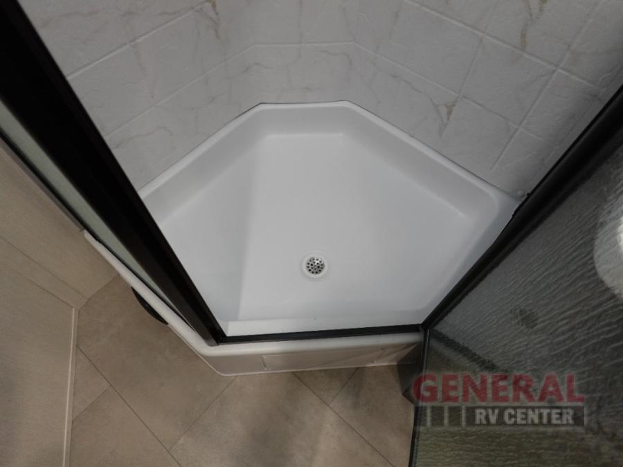 Privacy abounds in this travel trailer with a bedroom at each end! A king bed slide in the front has its own fireplace for cozy nights. Dual wardrobes frame the reading bench which looks out the front window for peaceful moments appreciating the view. At the rear, a second bedroom with queen bed has its own half bath. A pantry closet here also has prep for an optional washer/dryer for convenience on the road. In the center everyone can meet up in the spacious kitchen/living room. A hide-a-bed sofa has even more sleeping space, or relax there and watch the TV which is in the entertainment center along with another fireplace. The kitchen is well-equipped with a three-burner cooktop, microwave, and even an island where the sink is located for easy meal prep. Outside there are not one but two 10' power awnings for extra protection from the elements!