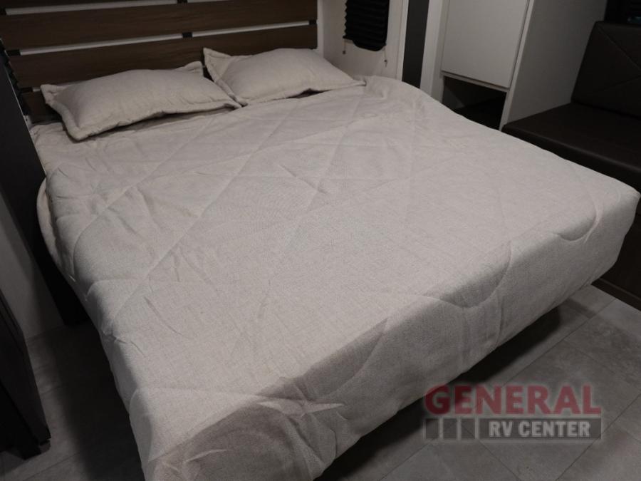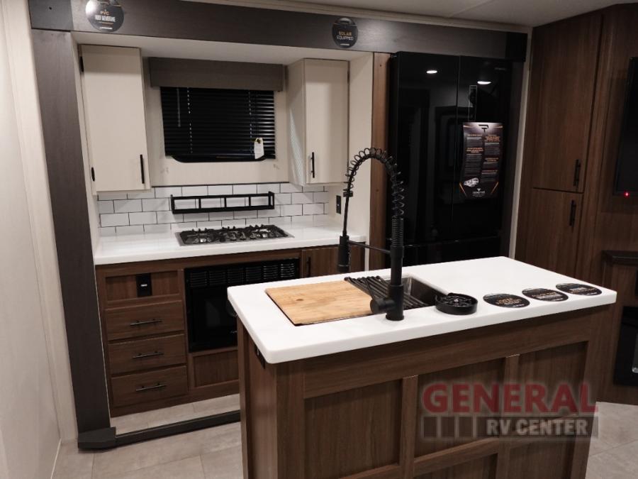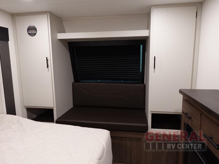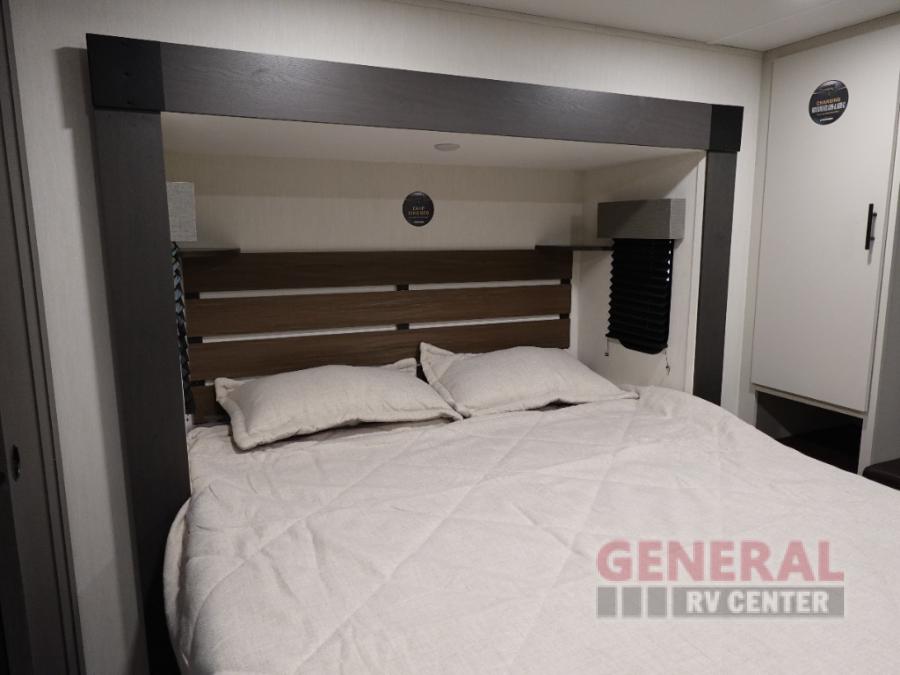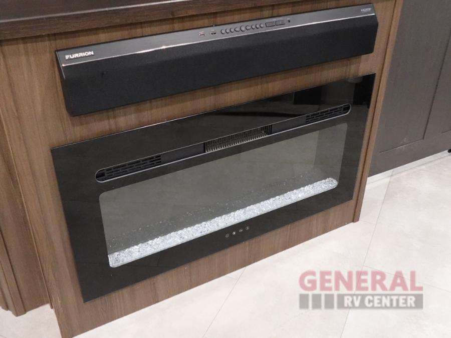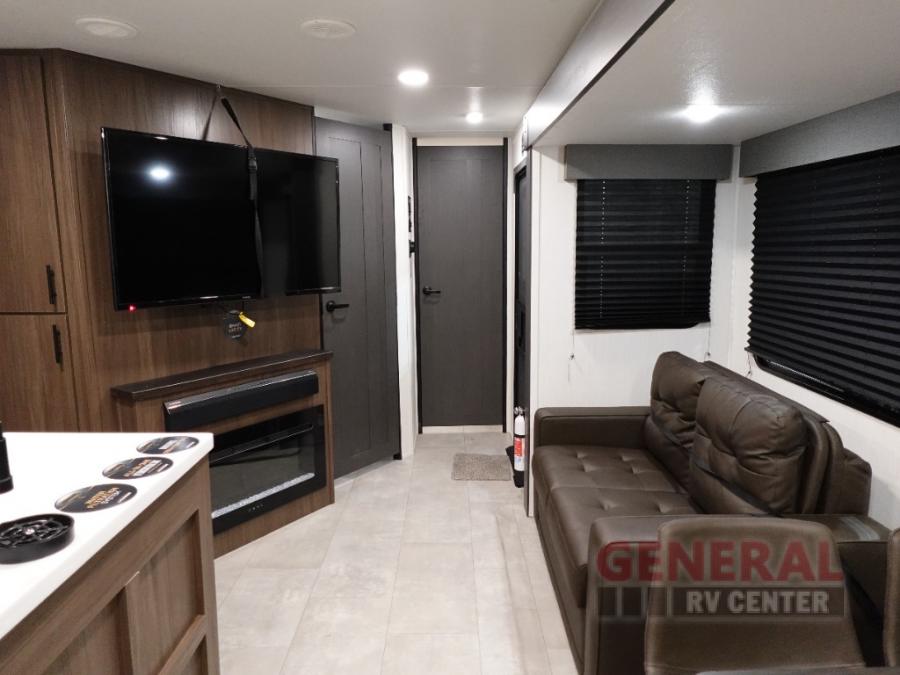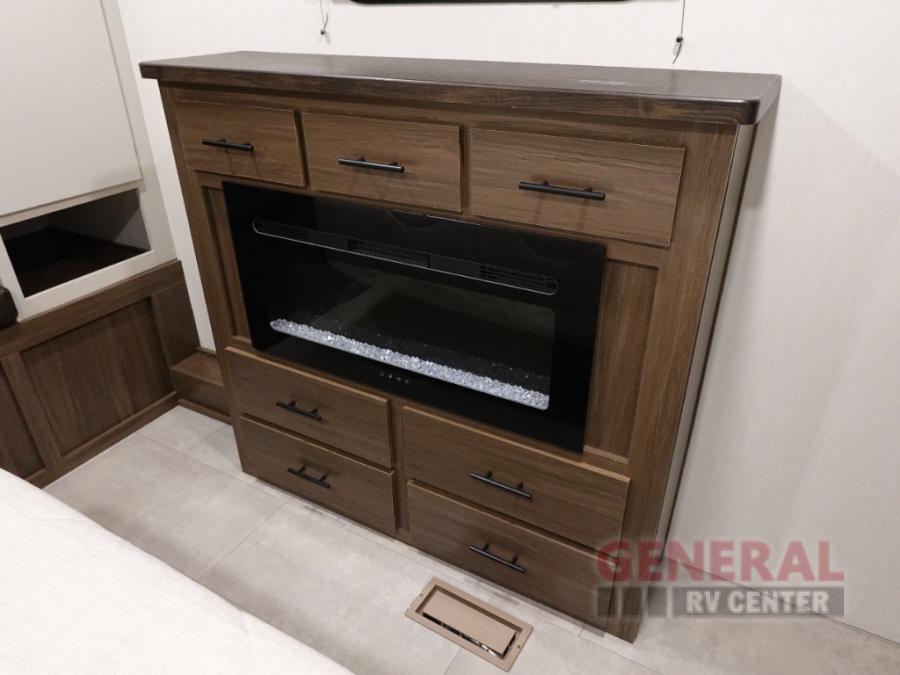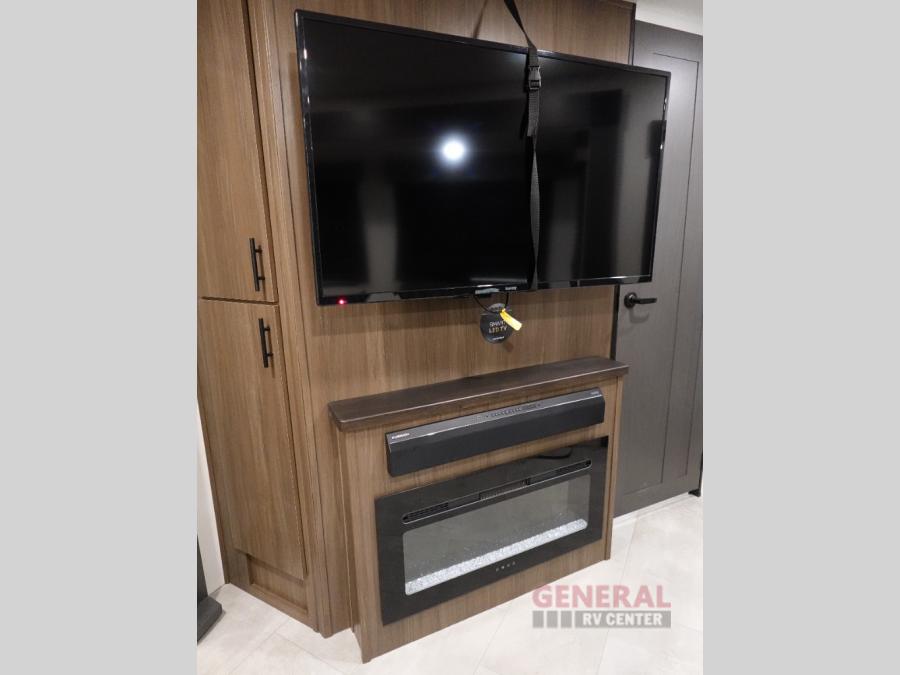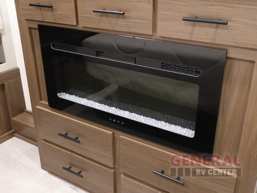 Privacy abounds in this travel trailer with a bedroom at each end! A king bed slide in the front has its own fireplace for cozy nights. Dual wardrobes frame the reading bench which looks out the front window for peaceful moments appreciating the view. At the rear, a second bedroom with queen bed has its own half bath. A pantry closet here also has prep for a washer/dryer for convenience on the road. In the center everyone can meet up in the spacious kitchen/living room. A hide-a-bed sofa has even more sleeping space, or relax there and watch the TV which is in the entertainment center along with another fireplace. The kitchen is well-equipped with a three-burner cooktop, microwave, and even an island where the sink is located for easy meal prep. Outside there are not one but two 10' power awnings for extra protection from the elements!