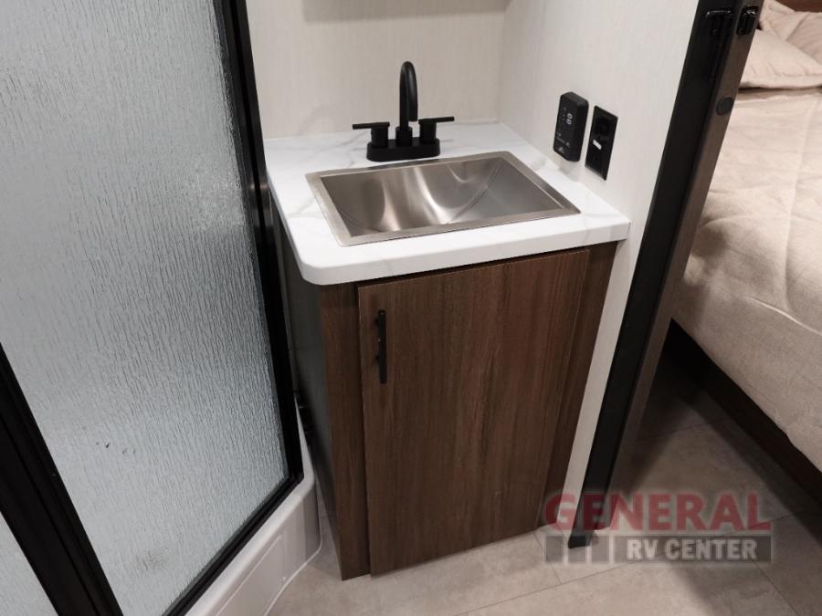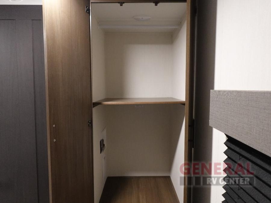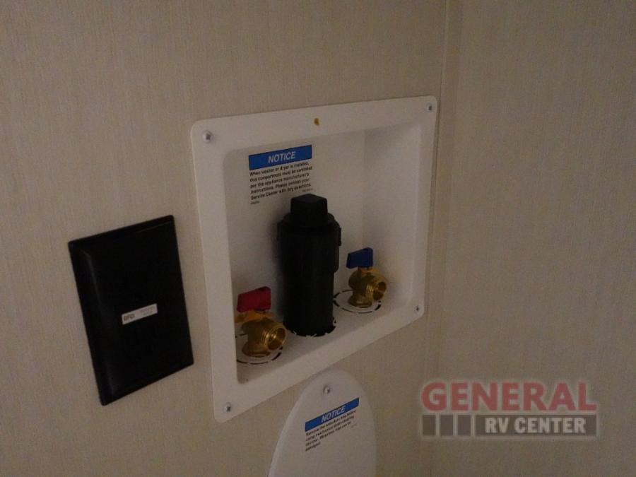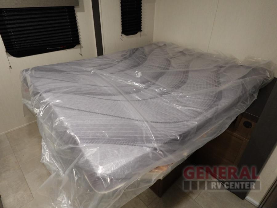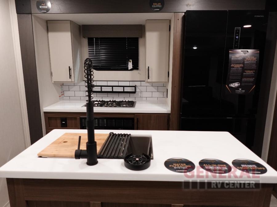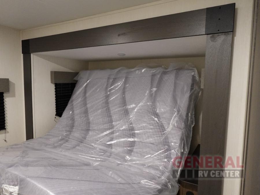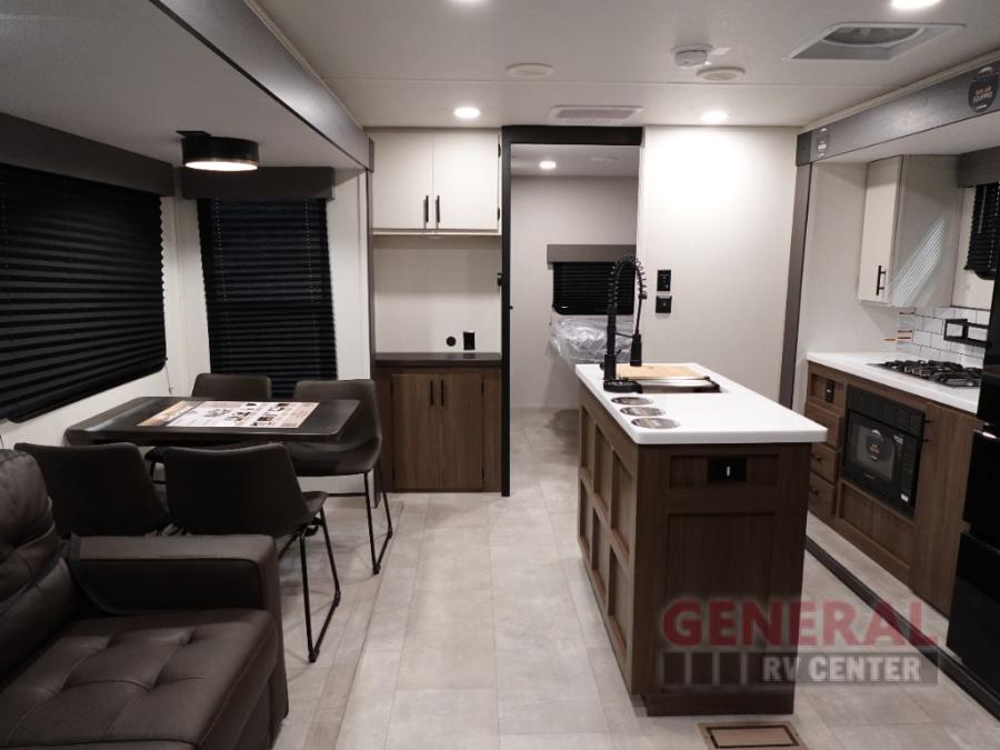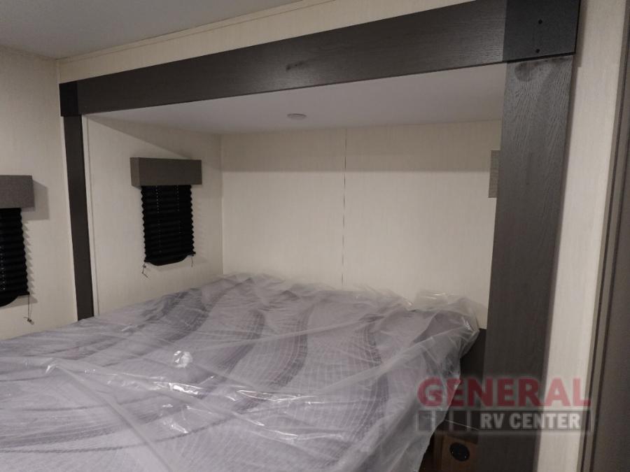 Privacy abounds in this travel trailer with a bedroom at each end! A king bed slide in the front has its own fireplace for cozy nights. Dual wardrobes frame the reading bench which looks out the front window for peaceful moments appreciating the view. At the rear, a second bedroom with queen bed has its own half bath. A pantry closet here also has prep for a washer/dryer for convenience on the road. In the center everyone can meet up in the spacious kitchen/living room. A hide-a-bed sofa has even more sleeping space, or relax there and watch the TV which is in the entertainment center along with another fireplace. The kitchen is well-equipped with a three-burner cooktop, microwave, and even an island where the sink is located for easy meal prep. Outside there are not one but two 10' power awnings for extra protection from the elements!