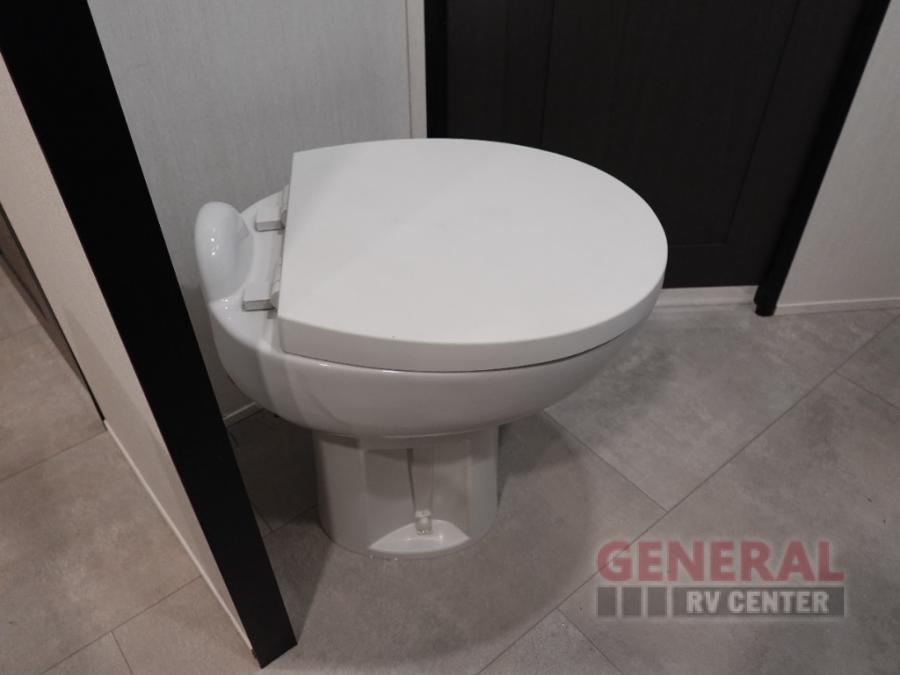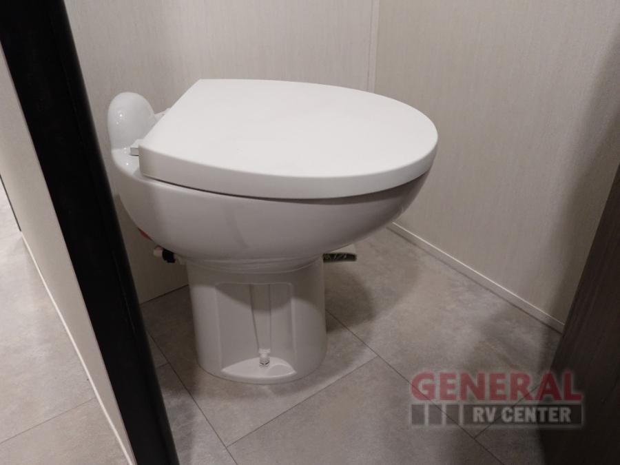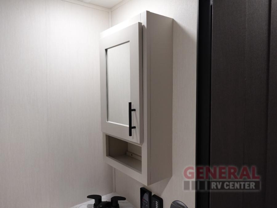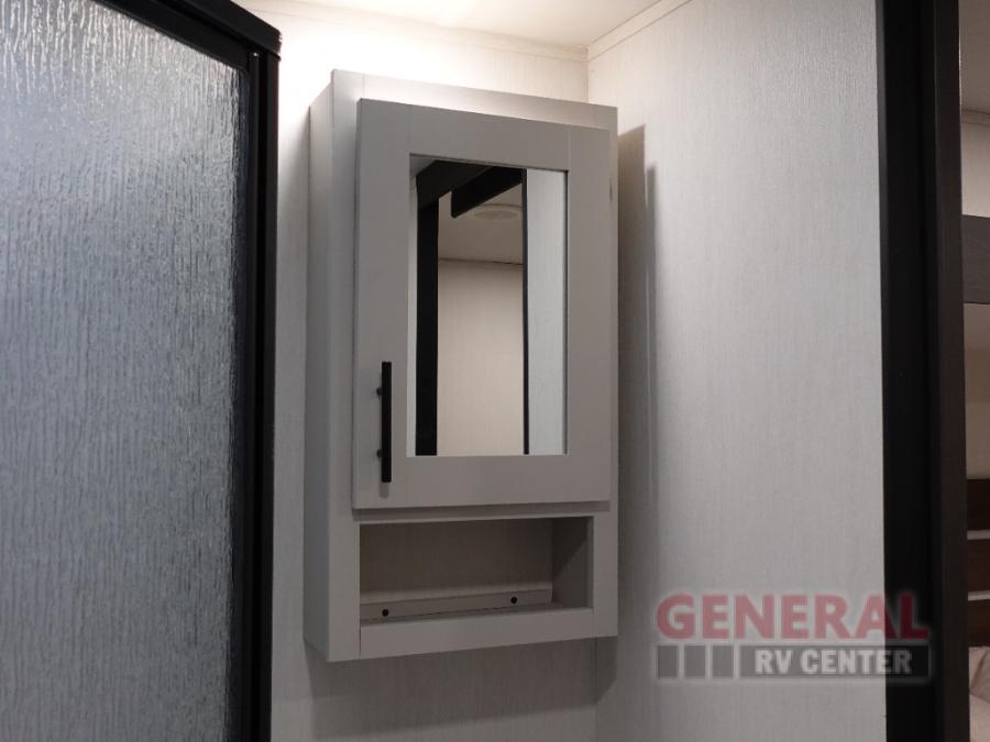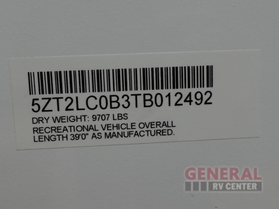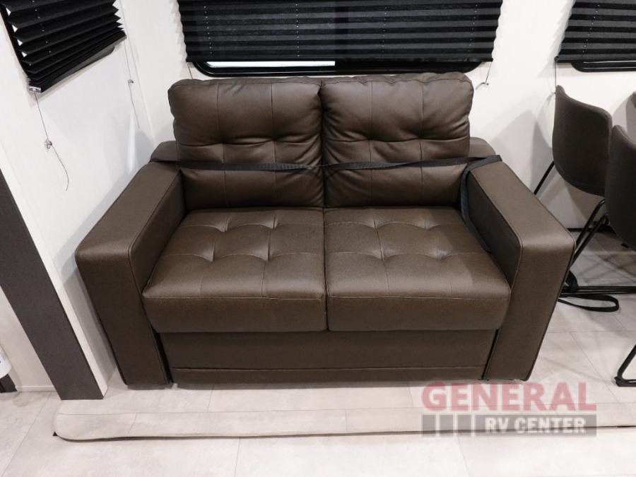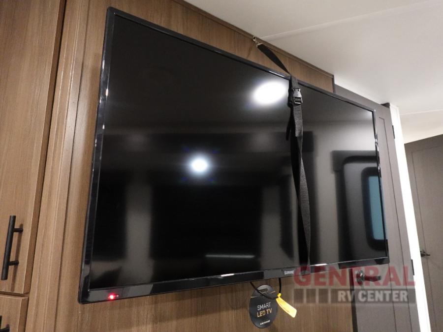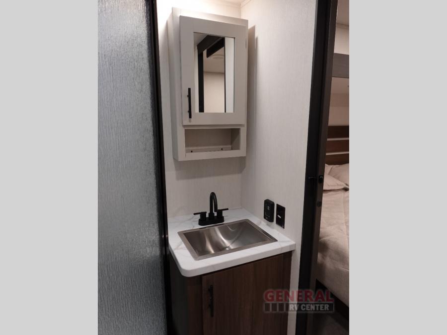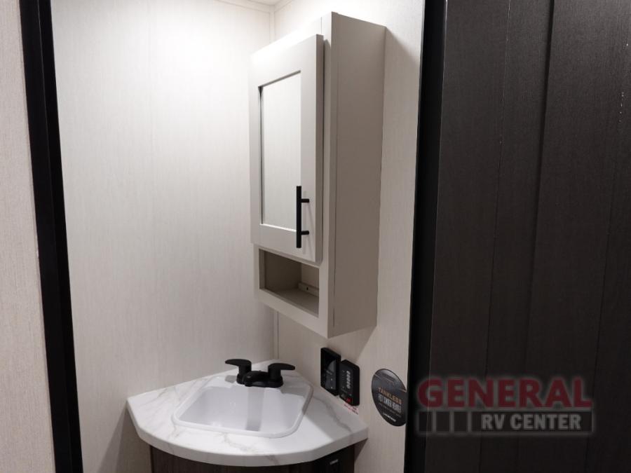 Privacy abounds in this travel trailer with a bedroom at each end! A king bed slide in the front has its own fireplace for cozy nights. Dual wardrobes frame the reading bench which looks out the front window for peaceful moments appreciating the view. At the rear, a second bedroom with queen bed has its own half bath. A pantry closet here also has prep for a washer/dryer for convenience on the road. In the center everyone can meet up in the spacious kitchen/living room. A hide-a-bed sofa has even more sleeping space, or relax there and watch the TV which is in the entertainment center along with another fireplace. The kitchen is well-equipped with a three-burner cooktop, microwave, and even an island where the sink is located for easy meal prep. Outside there are not one but two 10' power awnings for extra protection from the elements!