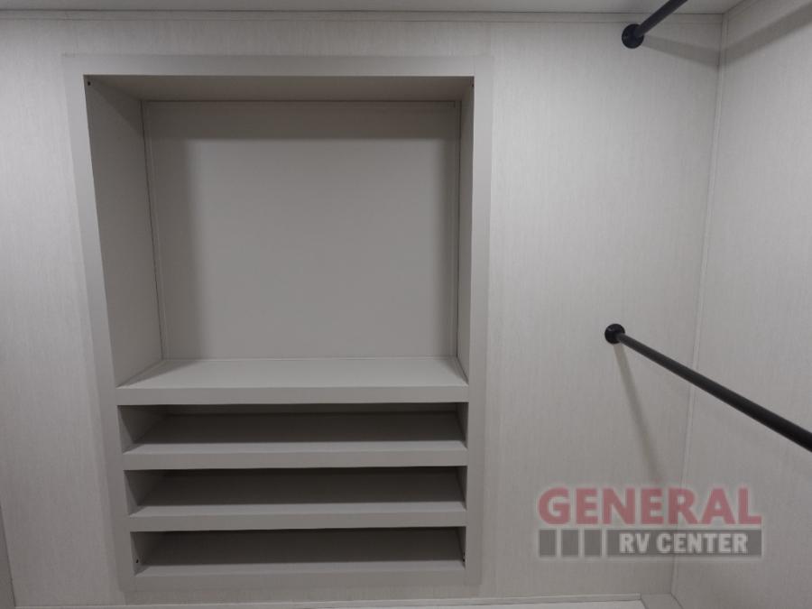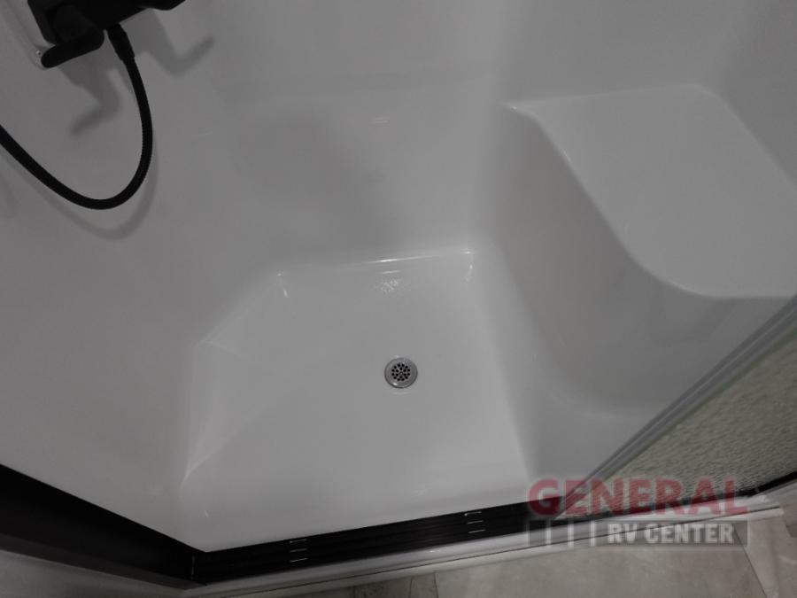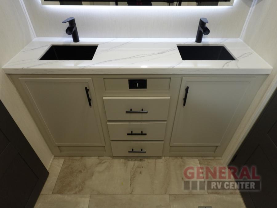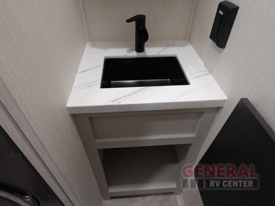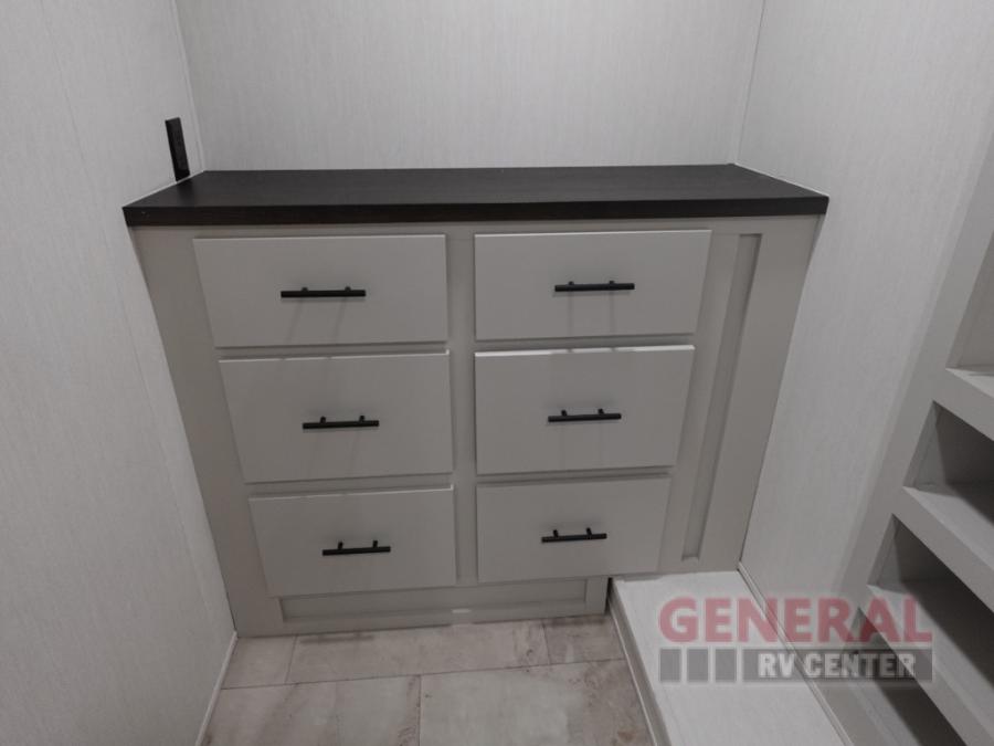 The Sanibel series stands out with a combination of unique and highly functional exterior and interior features designed for both convenience and durability. On the outside, a drop-frame pass-through storage area with a rubberized liner offers ample space while protecting your gear from moisture and wear. Setting up camp is effortless thanks to the one-touch auto-leveling system and rubberized suspension equalizer, which provide a smooth and stable foundation. Inside, comfort meets practicality with carpet less slides for easy cleaning and blackout roller shades for privacy and temperature control. The real wood cabinet doors and solid surface countertops add a touch of elegance, no matter where the road takes you.