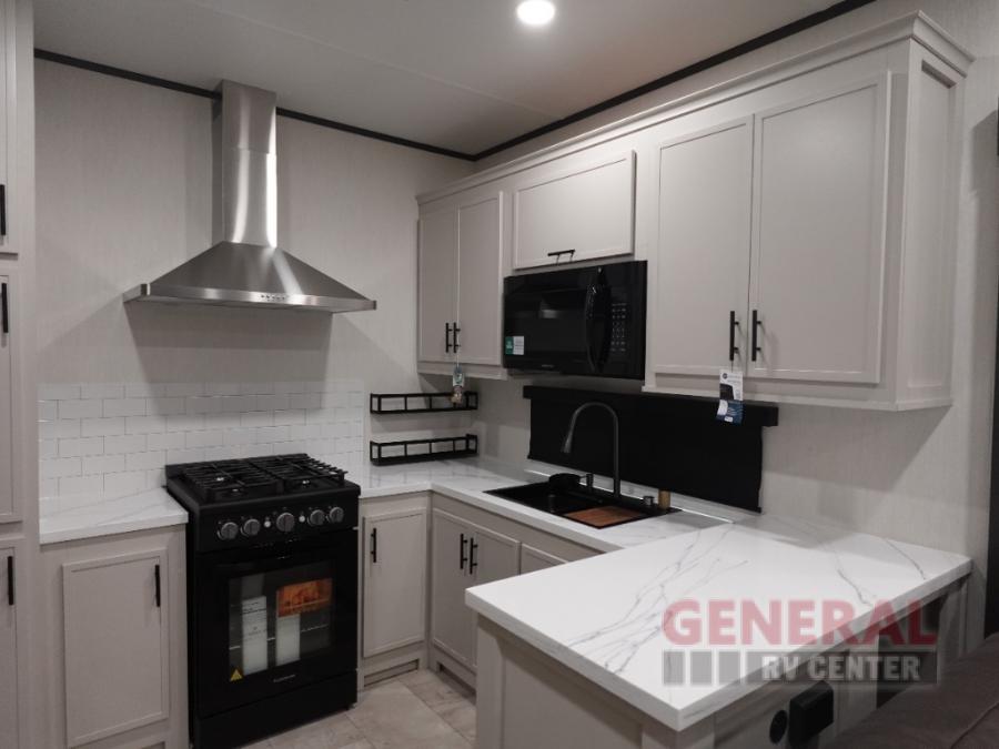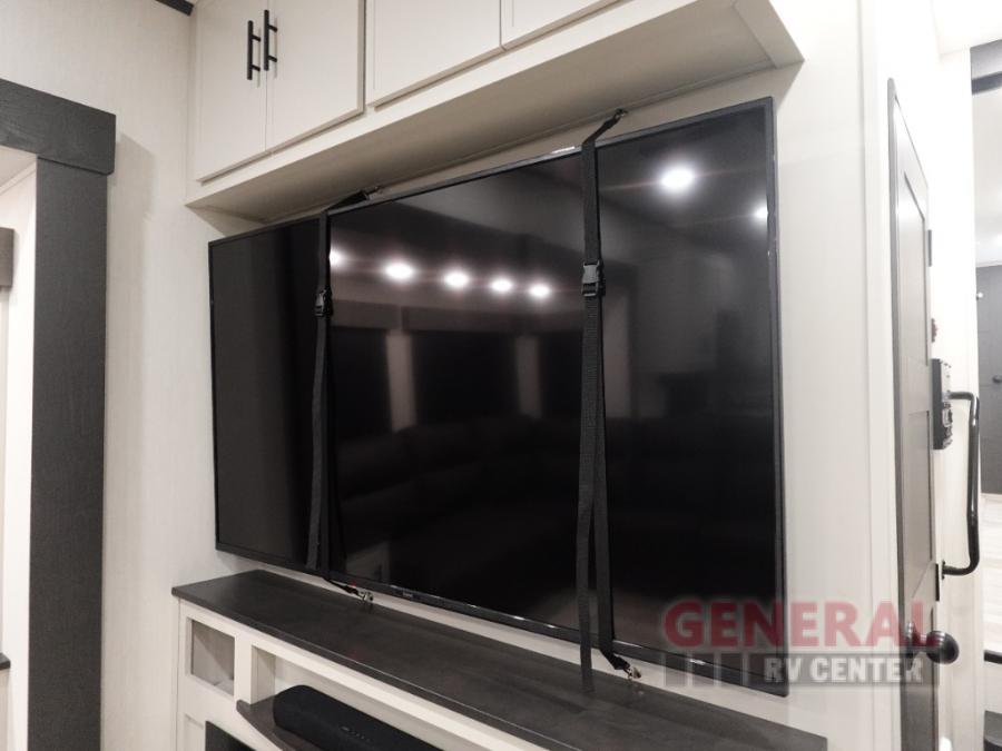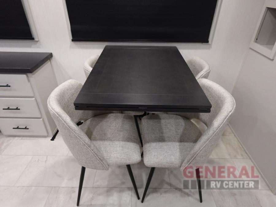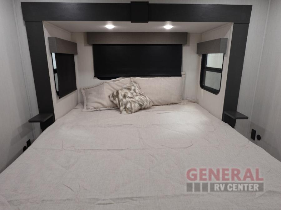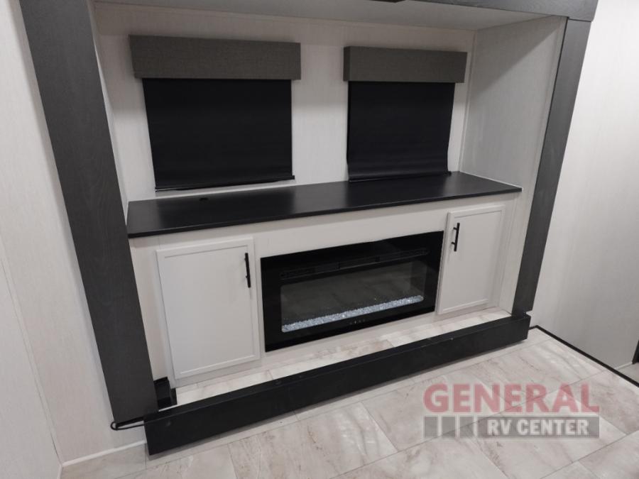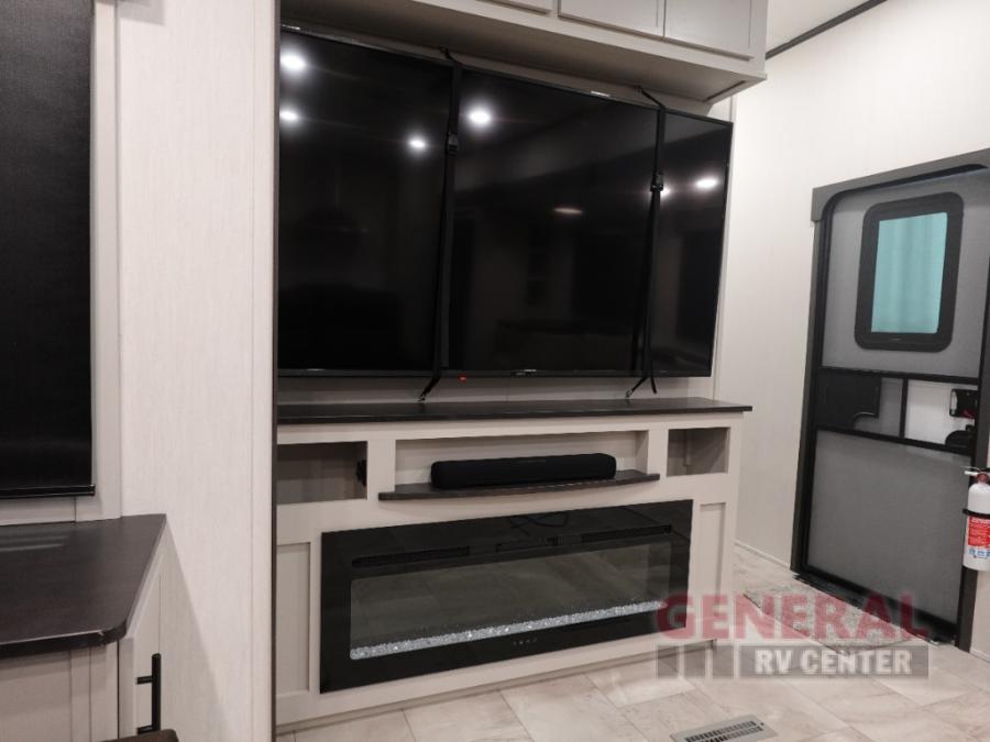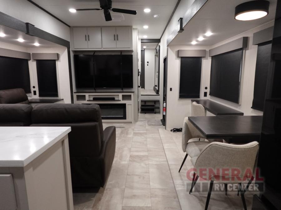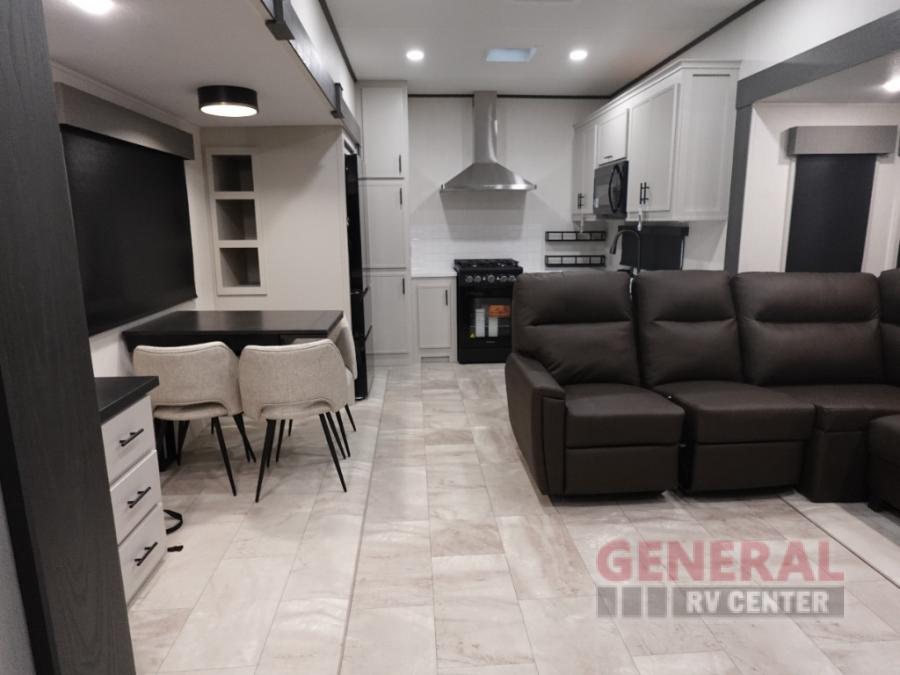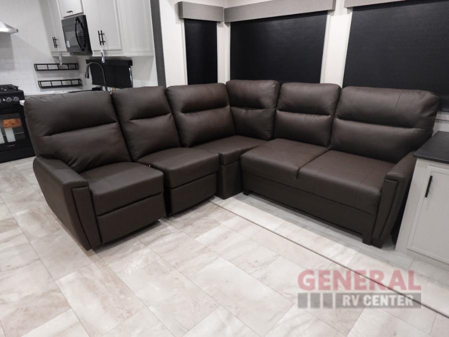 One of the standout features of the 38LAUNDRY fifth wheel is the convenient stackable washer and dryer located in the half bath, letting you take care of laundry right from the comfort of your trailer, no campground laundromat needed. After a day full of outdoor adventures, everyone can relax together in the spacious living room, which features a large sectional sleeper sofa perfect for movie nights or extra sleeping space. The equipped kitchen includes a four-burner range, giving the chef plenty of room to cook up delicious meals with ease. And when it's time to unwind, the private bedroom offers a peaceful retreat complete with a walk-through private bathroom featuring a dual vanity and a generous walk-in closet, ideal for storing all your clothes and camping gear.