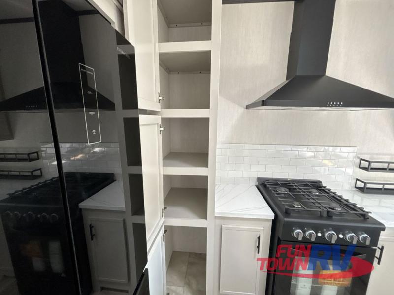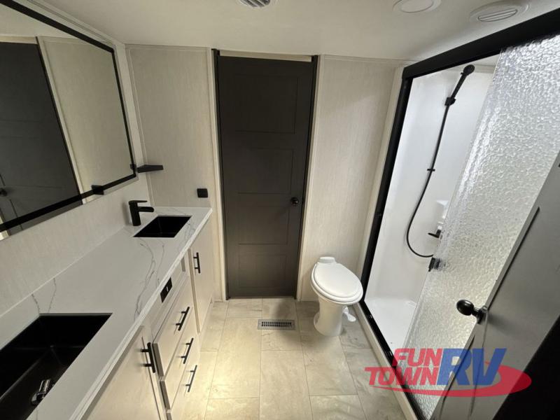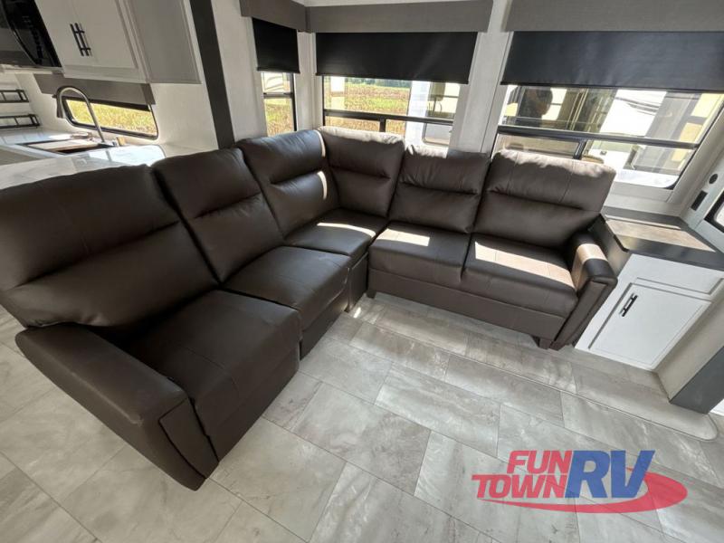 One of the standout features of the 38LAUNDRY fifth wheel is the convenient stackable washer and dryer located in the half bath, letting you take care of laundry right from the comfort of your trailer, no campground laundromat needed. After a day full of outdoor adventures, everyone can relax together in the spacious living room, which features a large sectional sleeper sofa perfect for movie nights or extra sleeping space. The equipped kitchen includes a four-burner range, giving the chef plenty of room to cook up delicious meals with ease. And when it's time to unwind, the private bedroom offers a peaceful retreat complete with a walk-through private bathroom featuring a dual vanity and a generous walk-in closet, ideal for storing all your clothes and camping gear.