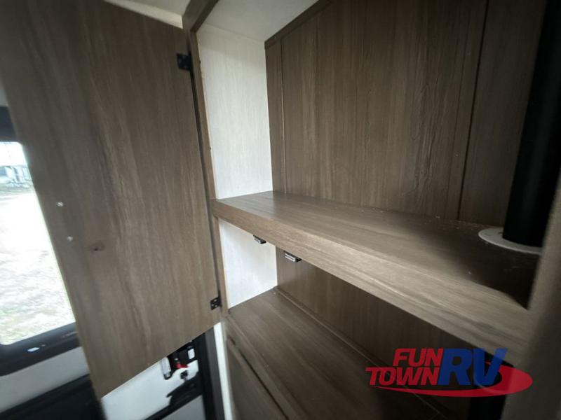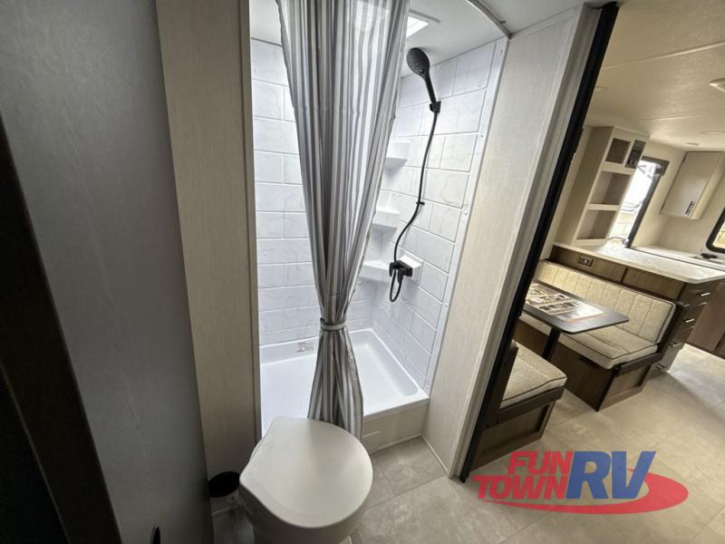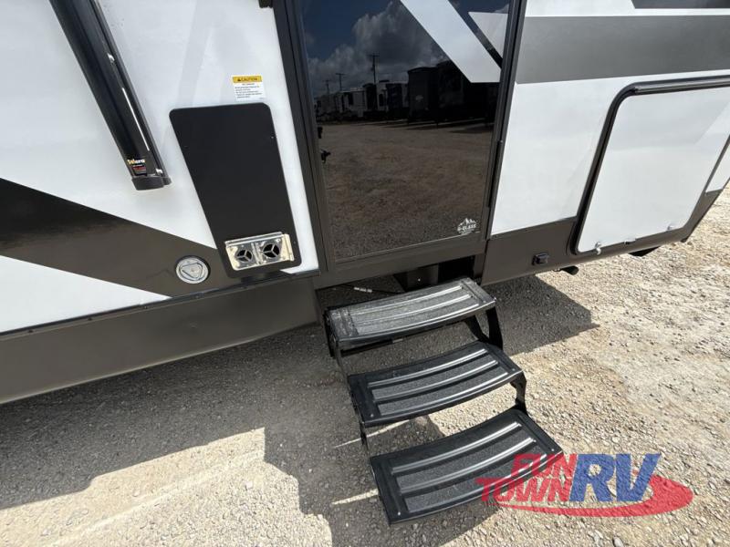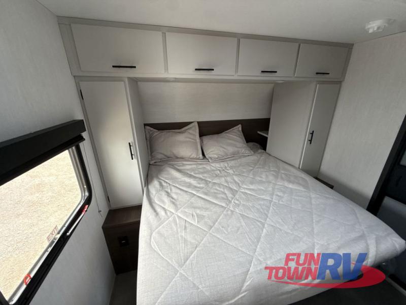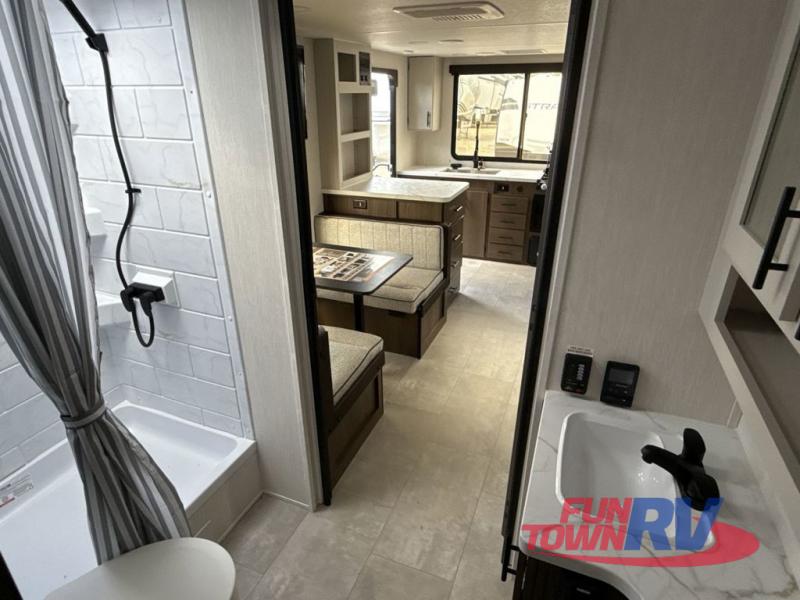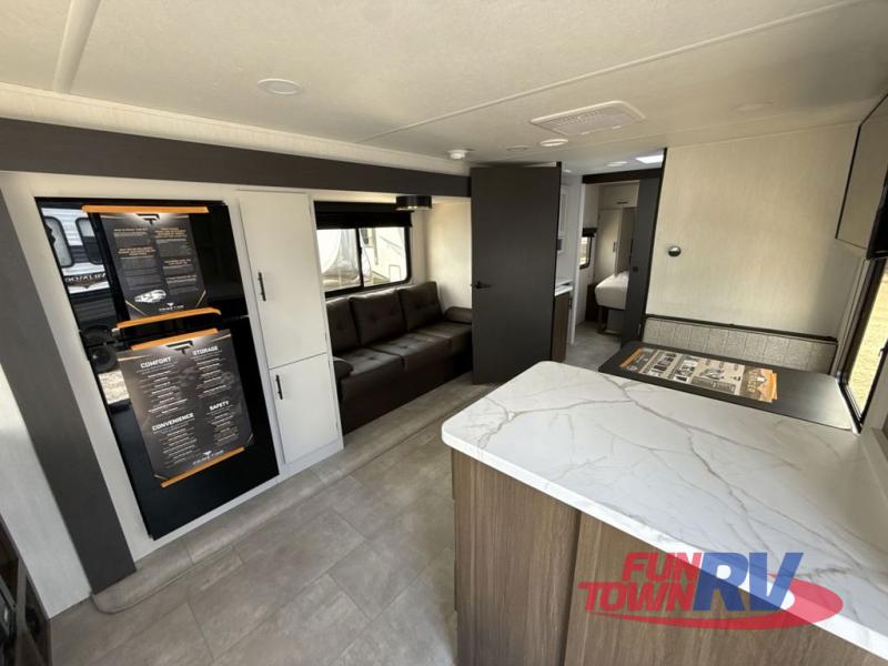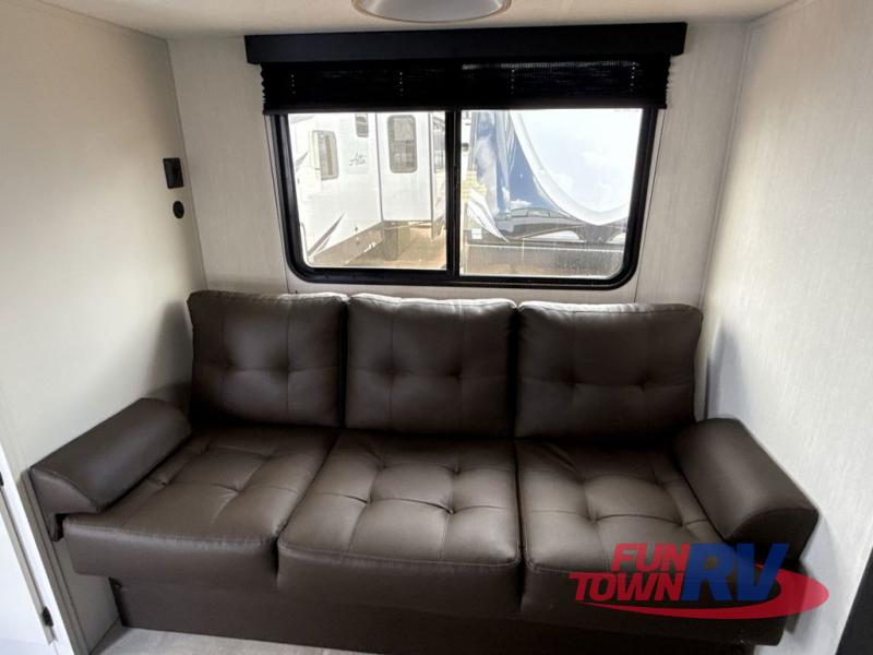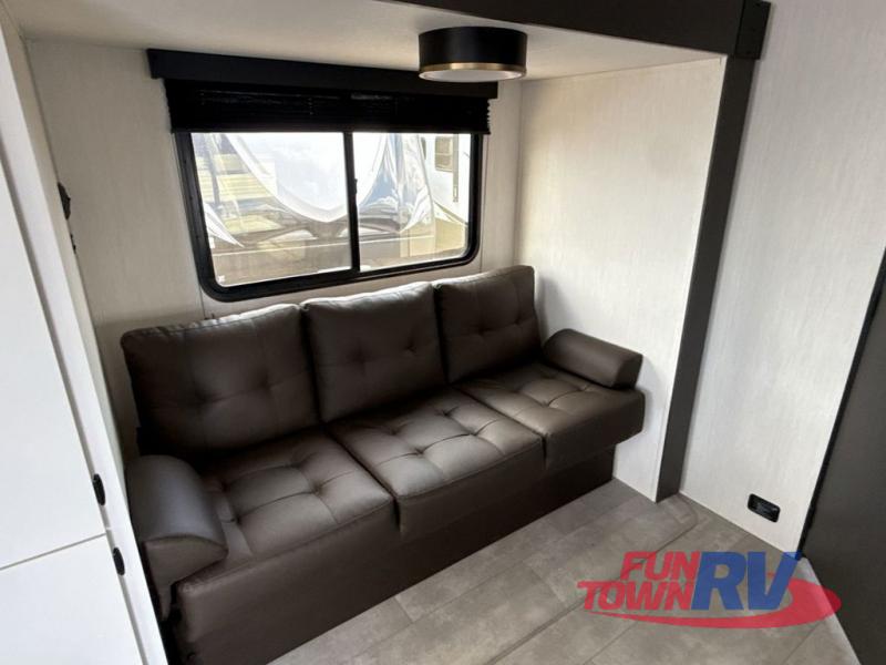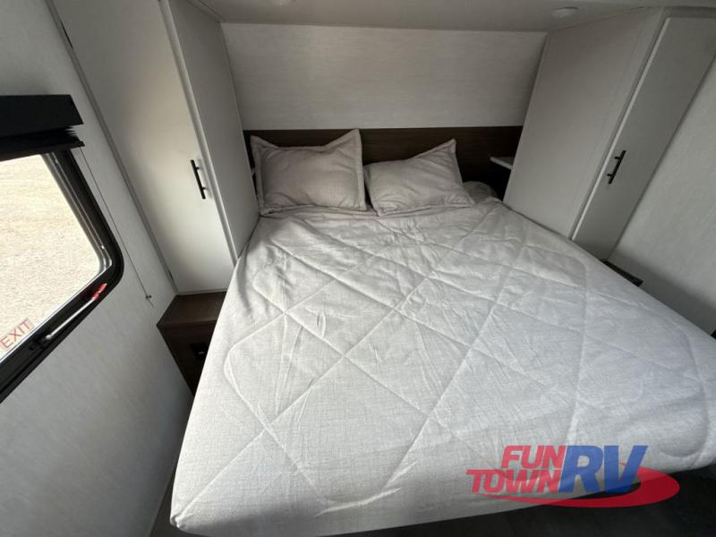 This travel trailer's  modern rear kitchen is equipped with a reliable fridge, well-stocked pantry, and stylish hutch, making meal prep and storage a snap. The versatile jackknife sofa provides additional sleeping space or a cozy spot to unwind, while the intimate booth dinette is perfect for sharing meals or stories with loved ones. The crisp high-definition smart TV is ideal for entertainment on the go, and the practical walk-thru bathroom provides easy access. The serene front bedroom is a peaceful retreat, featuring a comfortable king bed, functional linen closet, spacious wardrobes, and ample overhead cabinets for storing your essentials. One of the standout features of this trailer is the two entry/exit doors, providing added convenience and flexibility.