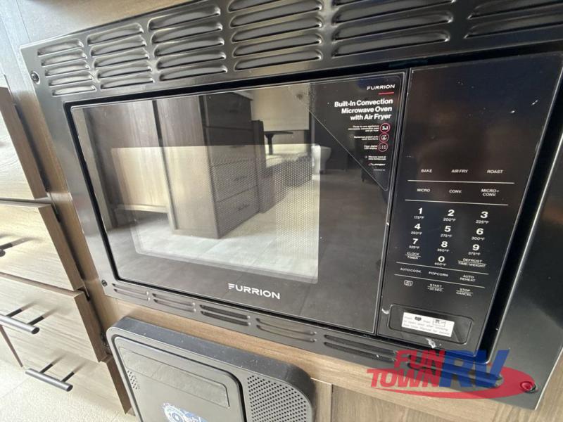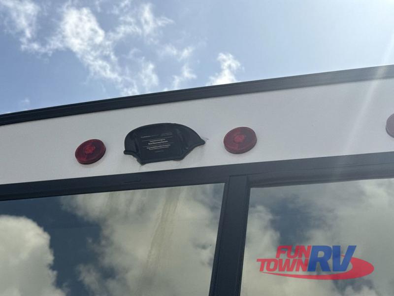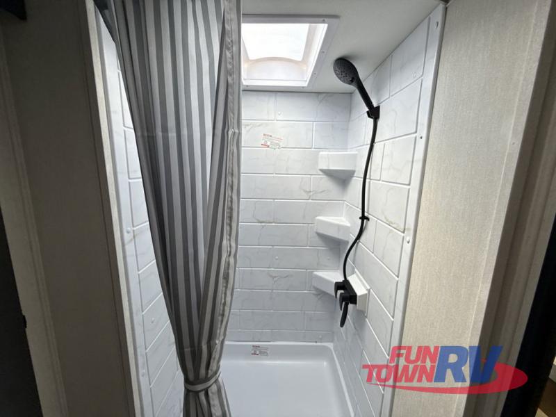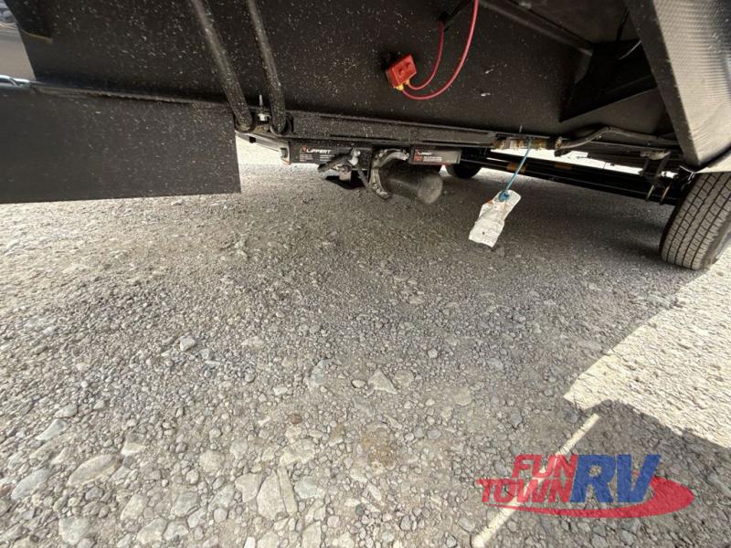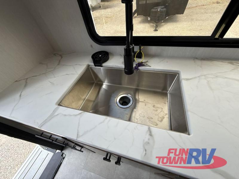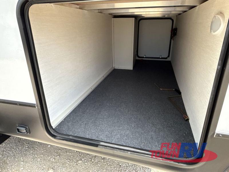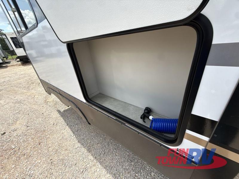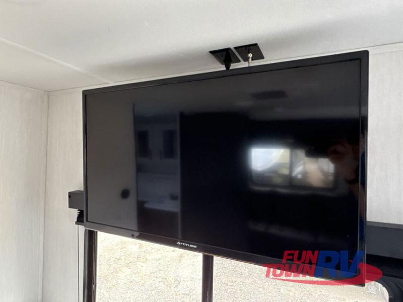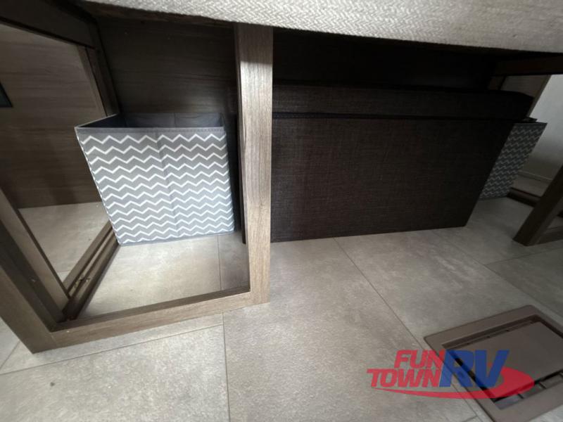 This travel trailer's  modern rear kitchen is equipped with a reliable fridge, well-stocked pantry, and stylish hutch, making meal prep and storage a snap. The versatile jackknife sofa provides additional sleeping space or a cozy spot to unwind, while the intimate booth dinette is perfect for sharing meals or stories with loved ones. The crisp high-definition smart TV is ideal for entertainment on the go, and the practical walk-thru bathroom provides easy access. The serene front bedroom is a peaceful retreat, featuring a comfortable king bed, functional linen closet, spacious wardrobes, and ample overhead cabinets for storing your essentials. One of the standout features of this trailer is the two entry/exit doors, providing added convenience and flexibility.