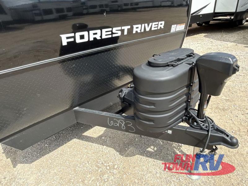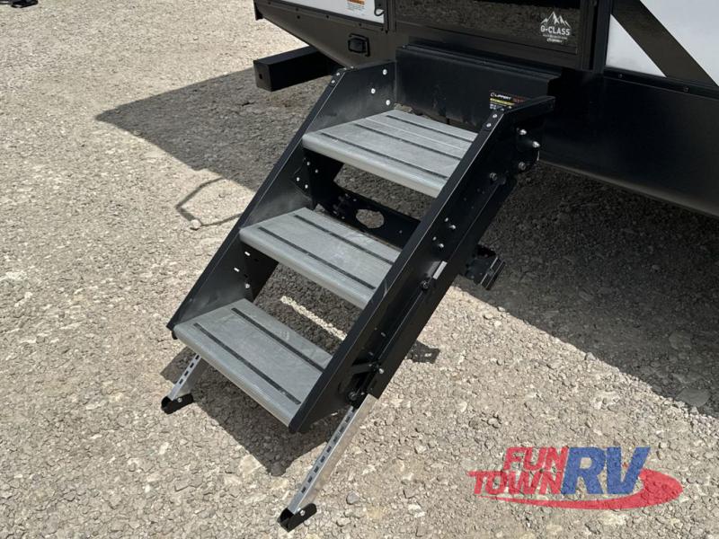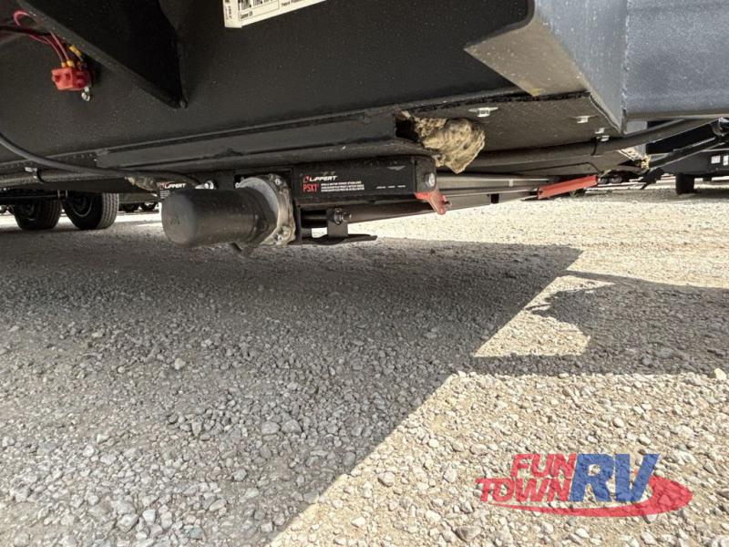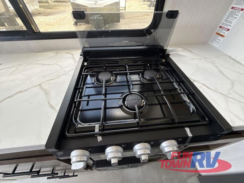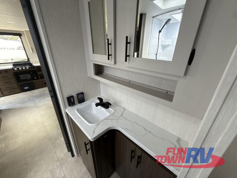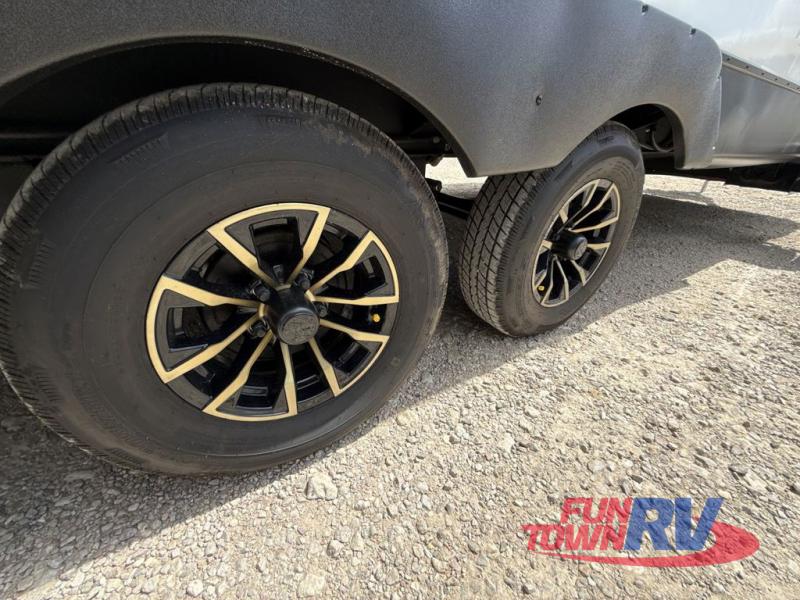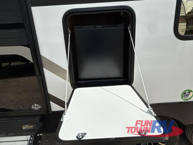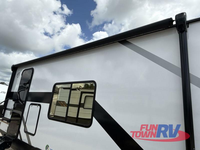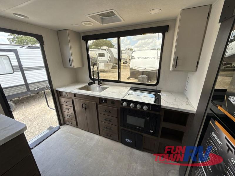 This travel trailer's  modern rear kitchen is equipped with a reliable fridge, well-stocked pantry, and stylish hutch, making meal prep and storage a snap. The versatile jackknife sofa provides additional sleeping space or a cozy spot to unwind, while the intimate booth dinette is perfect for sharing meals or stories with loved ones. The crisp high-definition smart TV is ideal for entertainment on the go, and the practical walk-thru bathroom provides easy access. The serene front bedroom is a peaceful retreat, featuring a comfortable king bed, functional linen closet, spacious wardrobes, and ample overhead cabinets for storing your essentials. One of the standout features of this trailer is the two entry/exit doors, providing added convenience and flexibility.