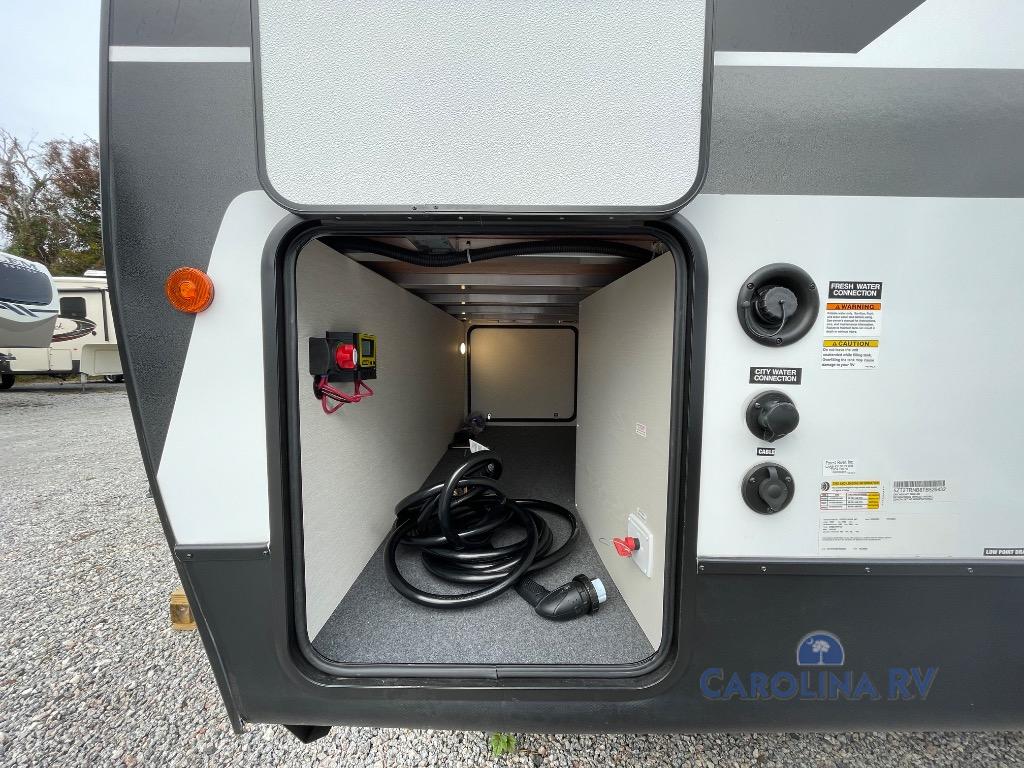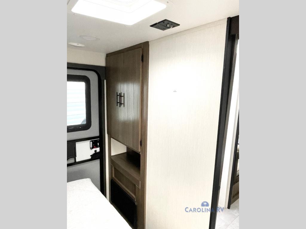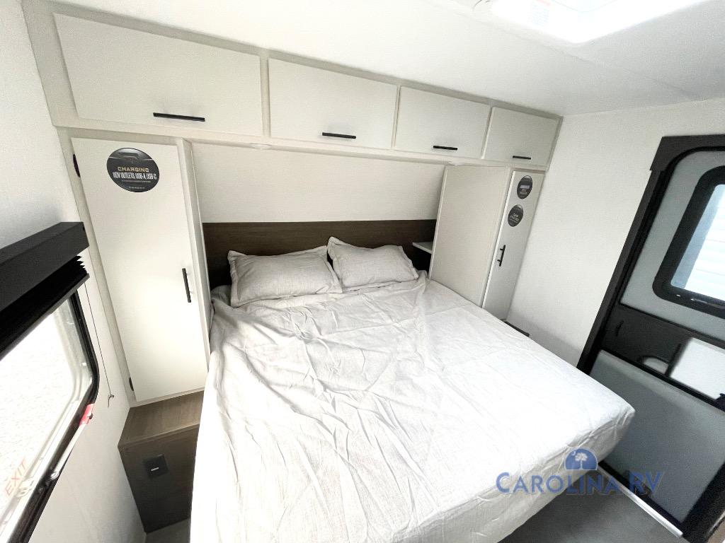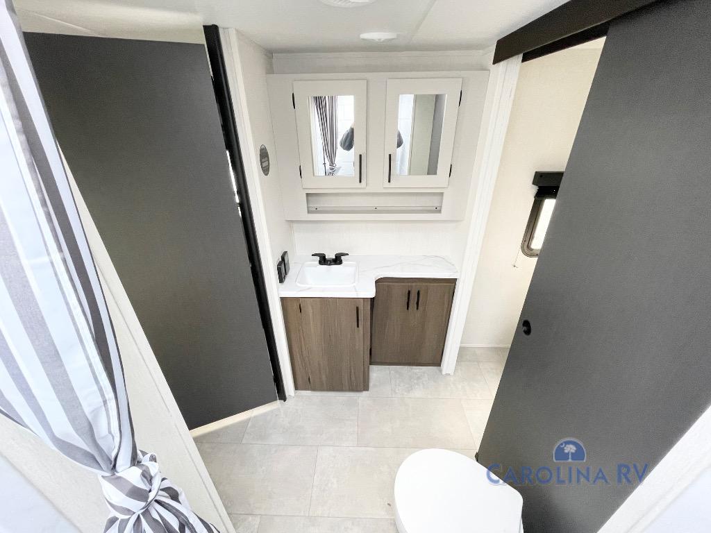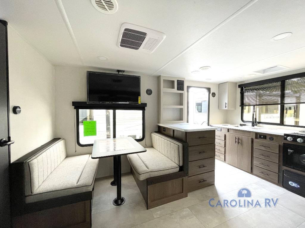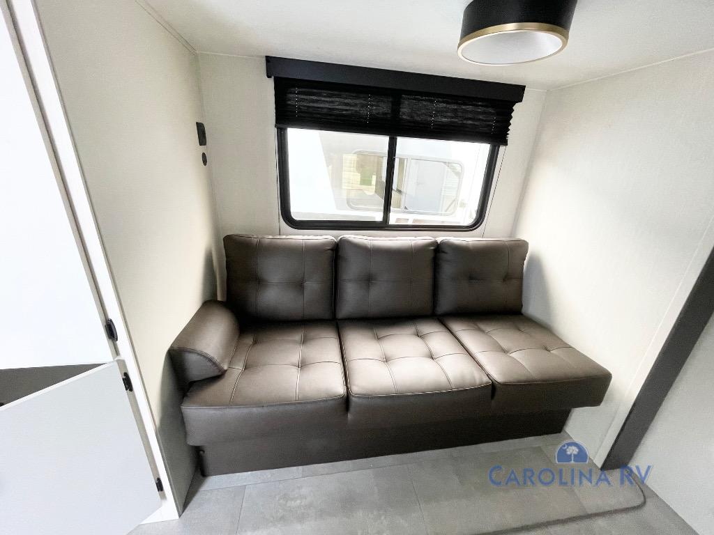 This travel trailer's  modern rear kitchen is equipped with a reliable fridge, well-stocked pantry, and stylish hutch, making meal prep and storage a snap. The versatile jackknife sofa provides additional sleeping space or a cozy spot to unwind, while the intimate booth dinette is perfect for sharing meals or stories with loved ones. The crisp high-definition smart TV is ideal for entertainment on the go, and the practical walk-thru bathroom provides easy access. The serene front bedroom is a peaceful retreat, featuring a comfortable king bed, functional linen closet, spacious wardrobes, and ample overhead cabinets for storing your essentials. One of the standout features of this trailer is the two entry/exit doors, providing added convenience and flexibility.