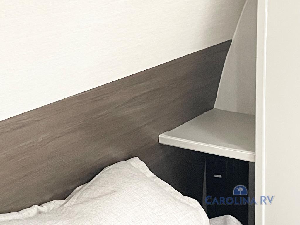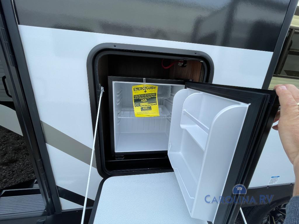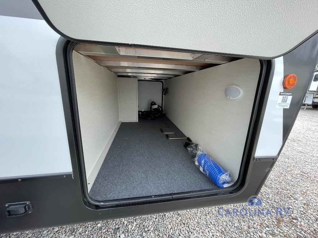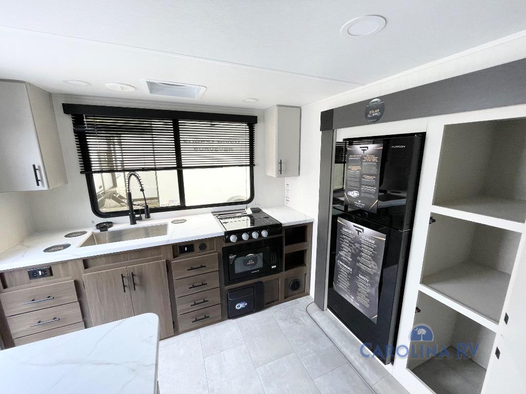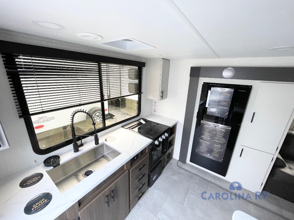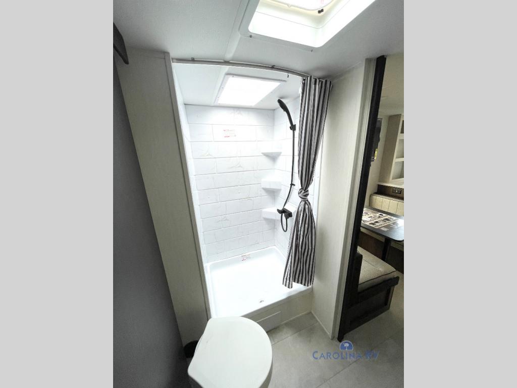 This travel trailer's  modern rear kitchen is equipped with a reliable fridge, well-stocked pantry, and stylish hutch, making meal prep and storage a snap. The versatile jackknife sofa provides additional sleeping space or a cozy spot to unwind, while the intimate booth dinette is perfect for sharing meals or stories with loved ones. The crisp high-definition smart TV is ideal for entertainment on the go, and the practical walk-thru bathroom provides easy access. The serene front bedroom is a peaceful retreat, featuring a comfortable king bed, functional linen closet, spacious wardrobes, and ample overhead cabinets for storing your essentials. One of the standout features of this trailer is the two entry/exit doors, providing added convenience and flexibility.