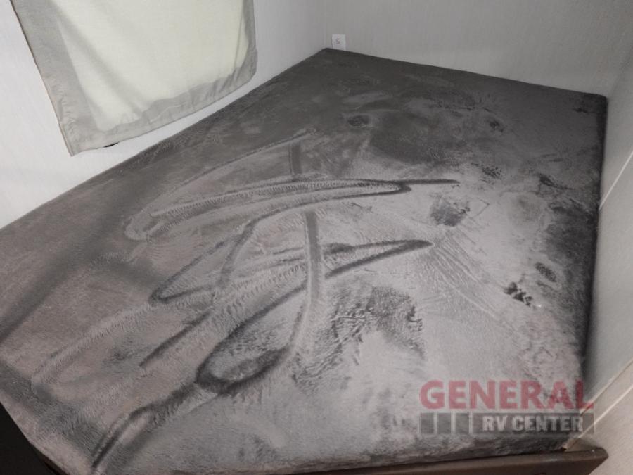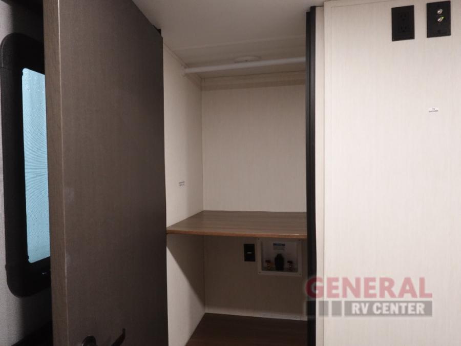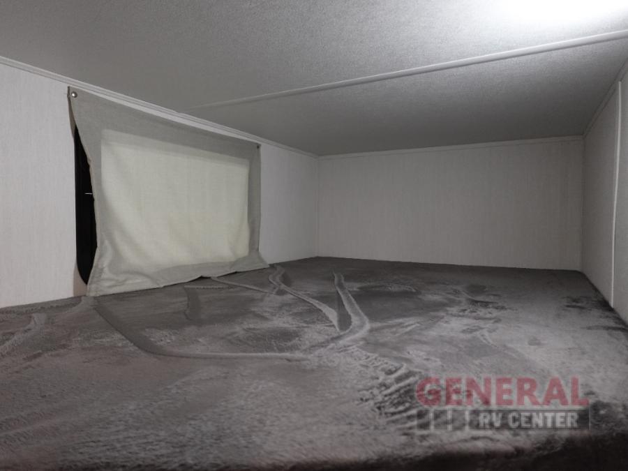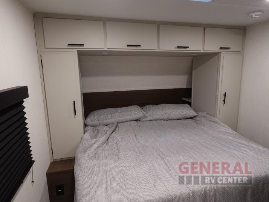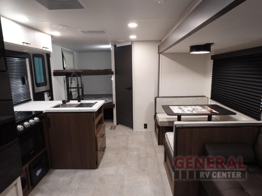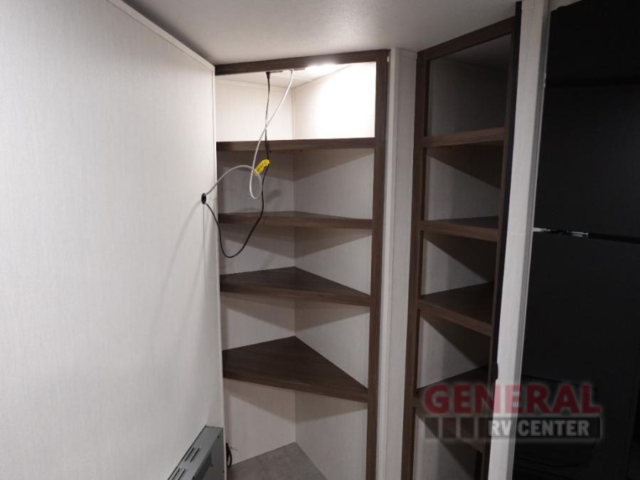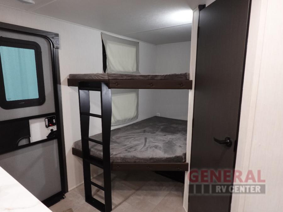 If you're looking for more comfort and a larger sleeping capacity in your next RV, this travel trailer is the one! There are double-size bunks in the rear corner, along with a ladder to easily hop into bed, and the full bath is in the other rear corner for easy nighttime use. You'll enjoy the front private bedroom with its queen bed and dual wardrobes for your things, and a separate closet with washer and dryer prep if you choose to add those appliances. And one of the dual entry doors is located here so you can easily slip out in the morning without waking everyone else up in the trailer! In the morning, you can make breakfast in the full kitchen, then dine at the booth dinette within the large slide out. There is also a jack knife sofa here for more comfort. This travel trailer also includes plenty of storage space, including a walk-in pantry with shelves, an additional storage closet, and a pass-thru storage outside for fishing poles!