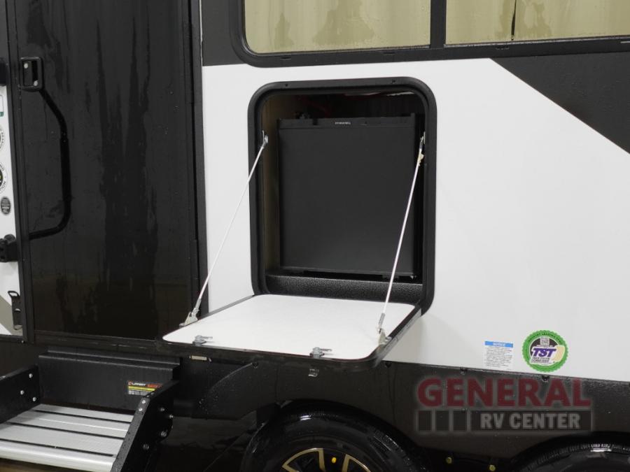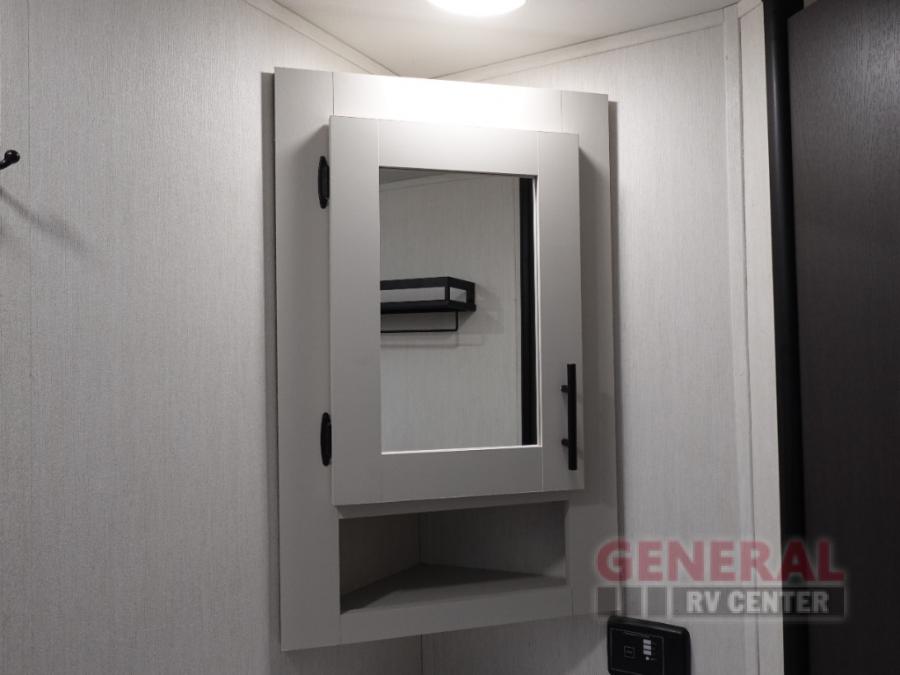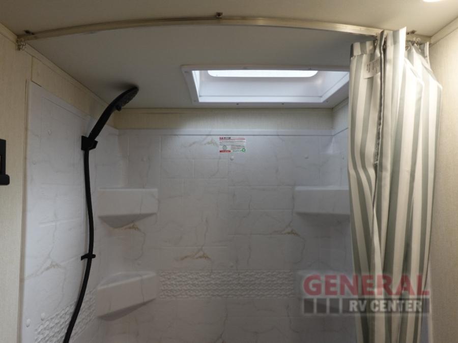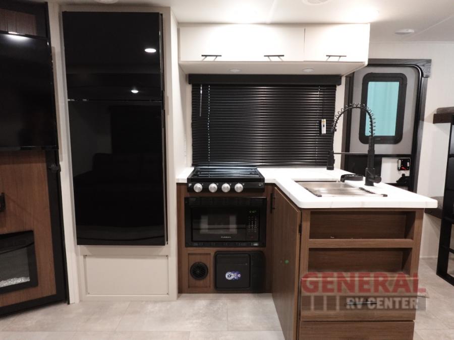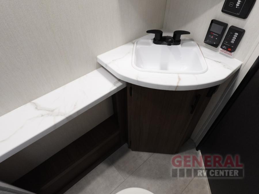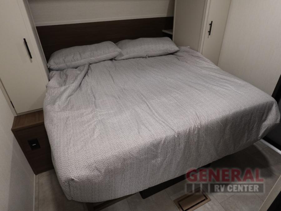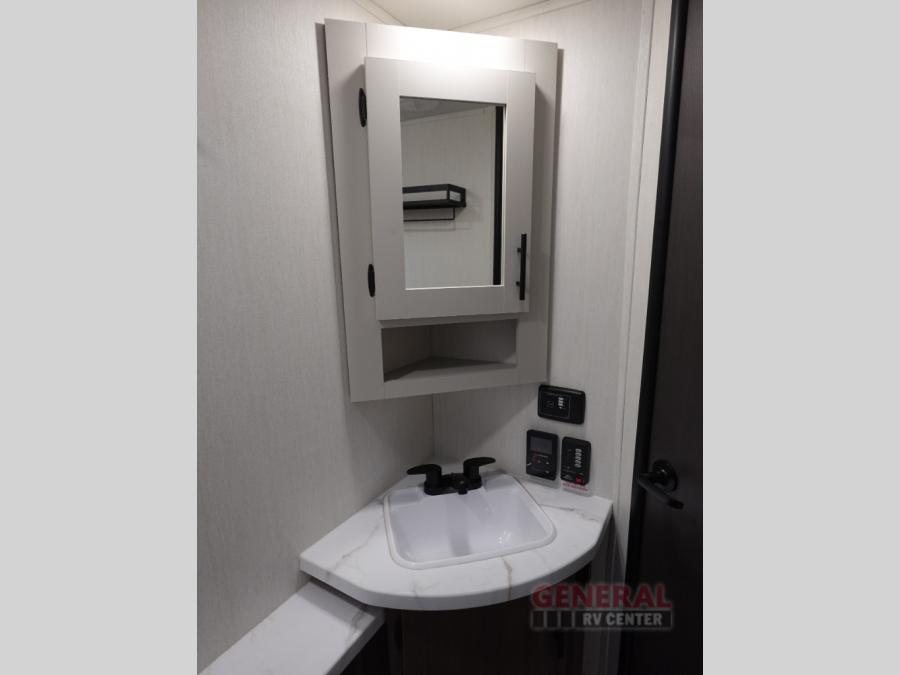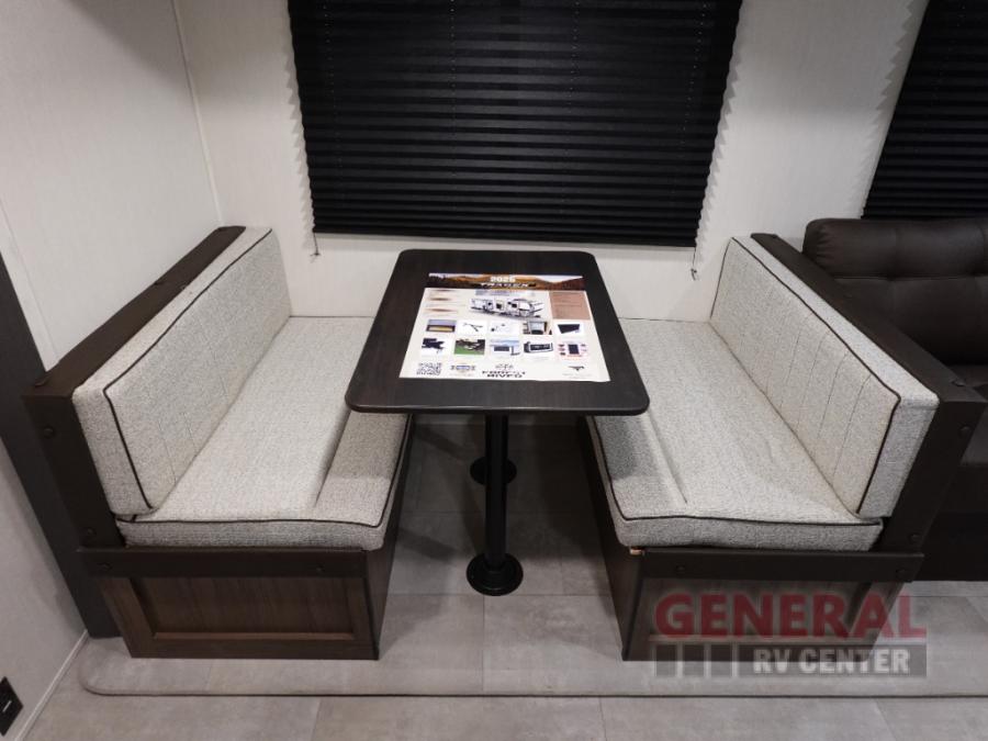 If you're looking for more comfort and a larger sleeping capacity in your next RV, this travel trailer is the one! There are double-size bunks in the rear corner, along with a ladder to easily hop into bed, and the full bath is in the other rear corner for easy nighttime use. You'll enjoy the front private bedroom with its queen bed and dual wardrobes for your things, and a separate closet with washer and dryer prep if you choose to add those appliances. And one of the dual entry doors is located here so you can easily slip out in the morning without waking everyone else up in the trailer! In the morning, you can make breakfast in the full kitchen, then dine at the booth dinette within the large slide out. There is also a jack knife sofa here for more comfort. This travel trailer also includes plenty of storage space, including a walk-in pantry with shelves, an additional storage closet, and a pass-thru storage outside for fishing poles!