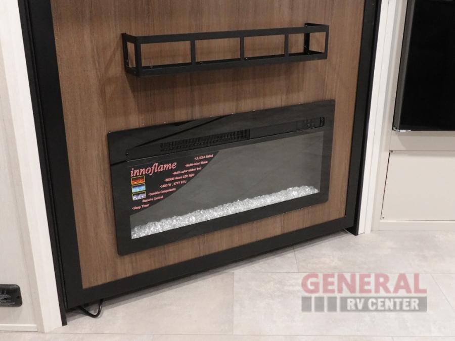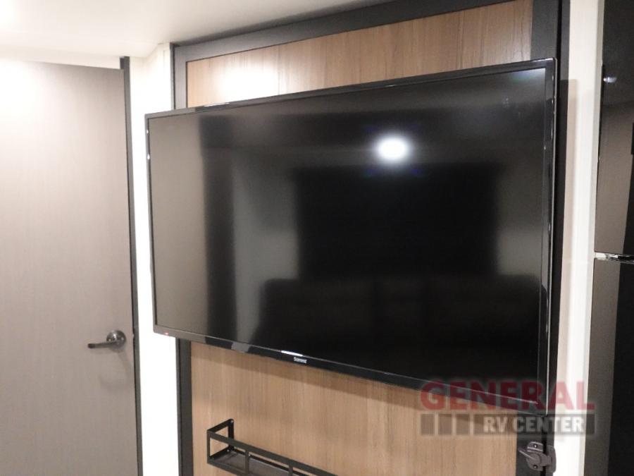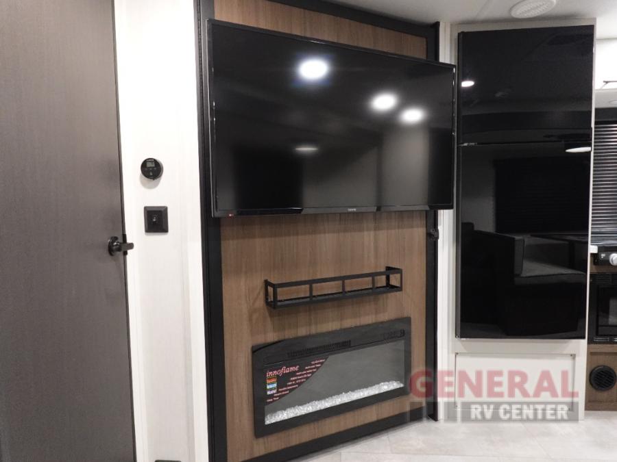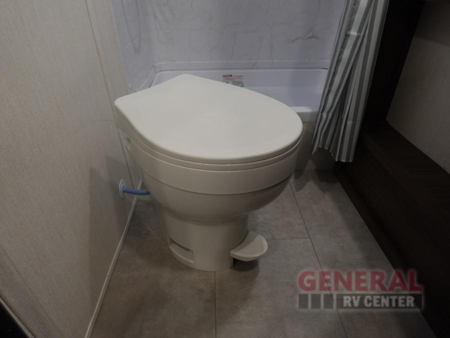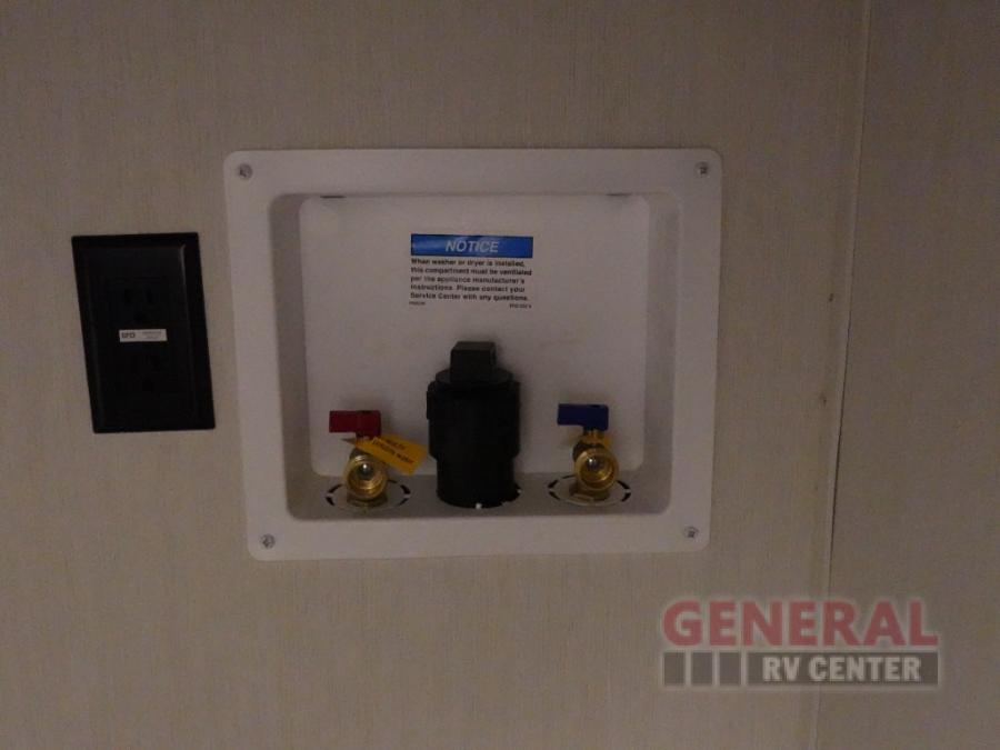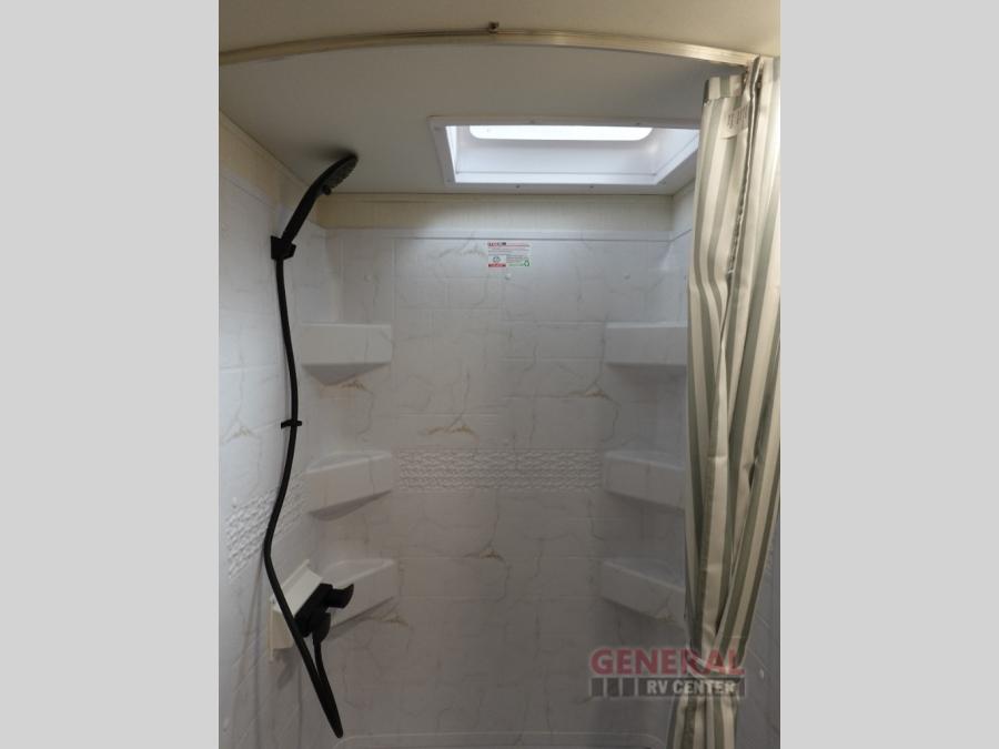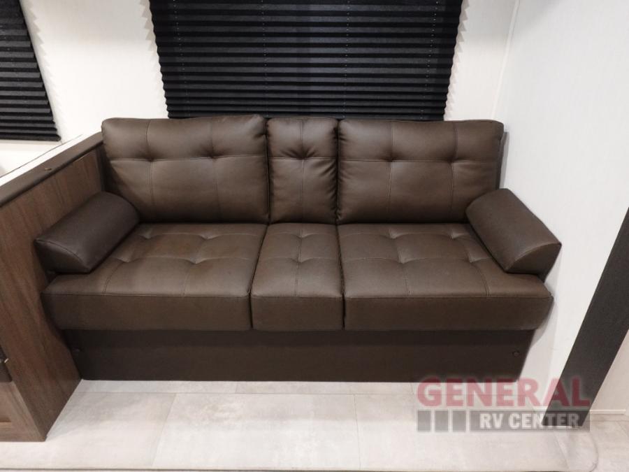 If you're looking for more comfort and a larger sleeping capacity in your next RV, this travel trailer is the one! There are double-size bunks in the rear corner, along with a ladder to easily hop into bed, and the full bath is in the other rear corner for easy nighttime use. You'll enjoy the front private bedroom with its queen bed and dual wardrobes for your things, and a separate closet with washer and dryer prep if you choose to add those appliances. And one of the dual entry doors is located here so you can easily slip out in the morning without waking everyone else up in the trailer! In the morning, you can make breakfast in the full kitchen, then dine at the booth dinette within the large slide out. There is also a jack knife sofa here for more comfort. This travel trailer also includes plenty of storage space, including a walk-in pantry with shelves, an additional storage closet, and a pass-thru storage outside for fishing poles!