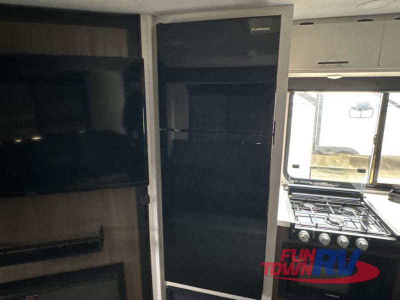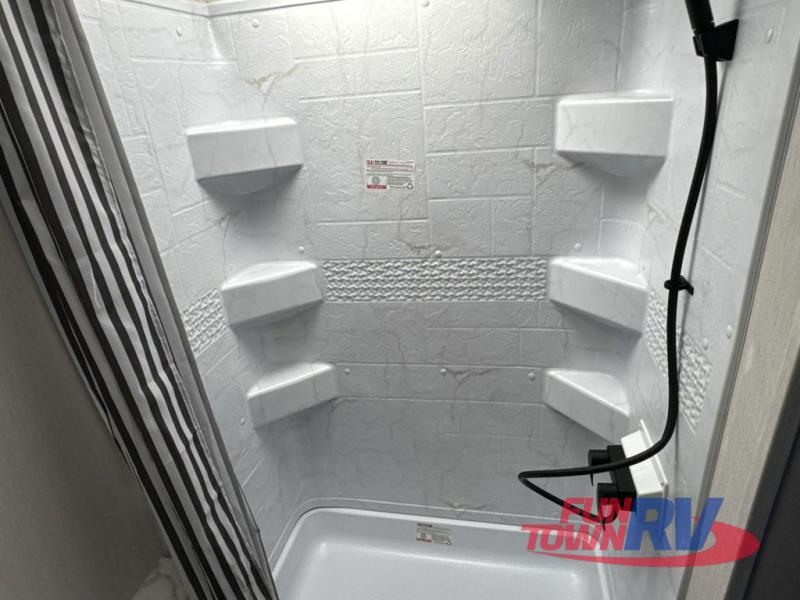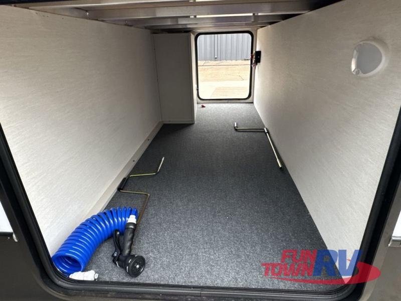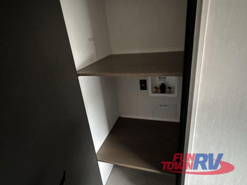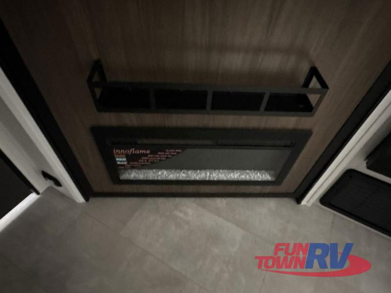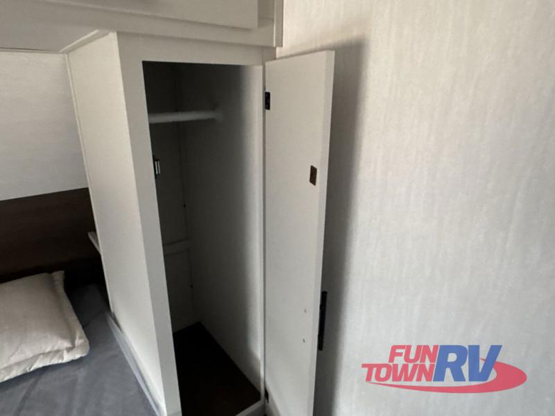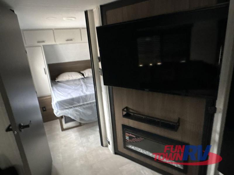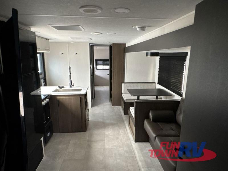 This travel trailer is the best option for a big family! The trailer boasts a spacious bunk bed above a sofa bed, providing ample sleeping space for kids and adults alike. The luxurious front king bed is a serene retreat, featuring expansive wardrobes and overhead cabinets for storing your essentials. The charming booth dinette is a cozy spot for meals or extra sleeping space, as well as the versatile jackknife sofa, which also provides additional sleeping space or a comfortable spot to relax. The sleek entertainment center is perfect for family movie nights. The well-appointed kitchen is equipped with a large fridge, convenient shelves, and a spacious pantry, making meal prep and storage an easy chore. The modern full bathroom features a well-stocked linen closet and provides a convenient space for freshening up. Plus, with two convenient entry/exit doors, this trailer offers added flexibility and ease of use, and the ample overhead cabinets provide additional storage space for your belongings.
