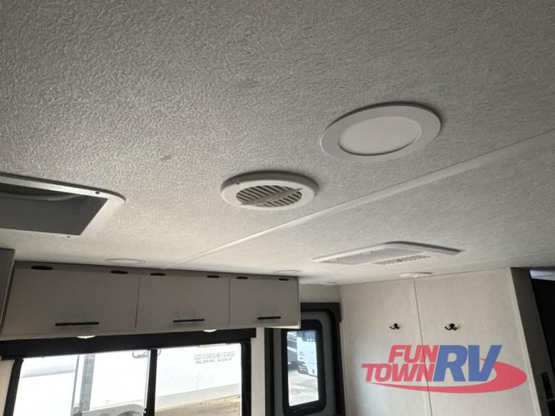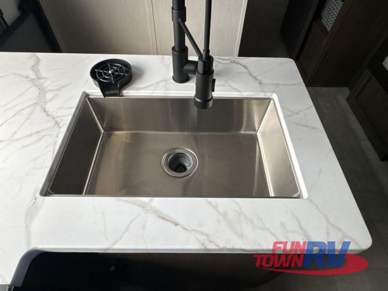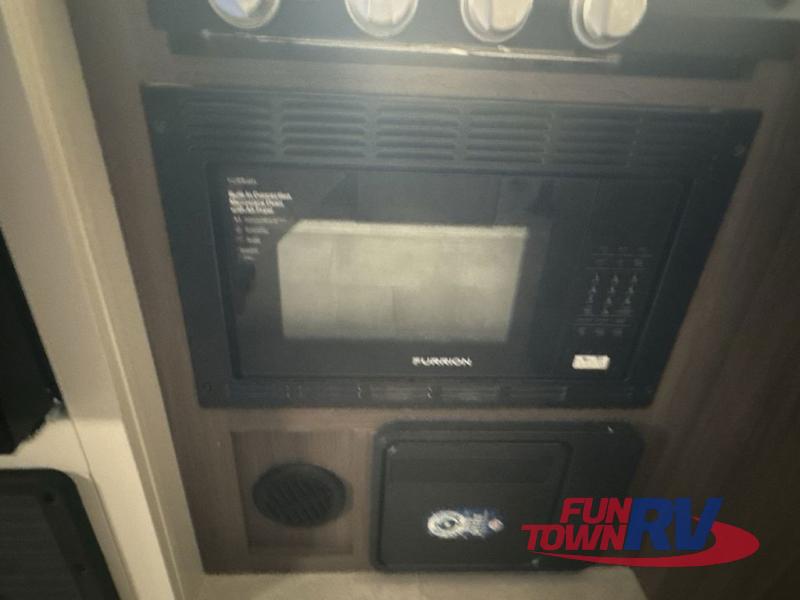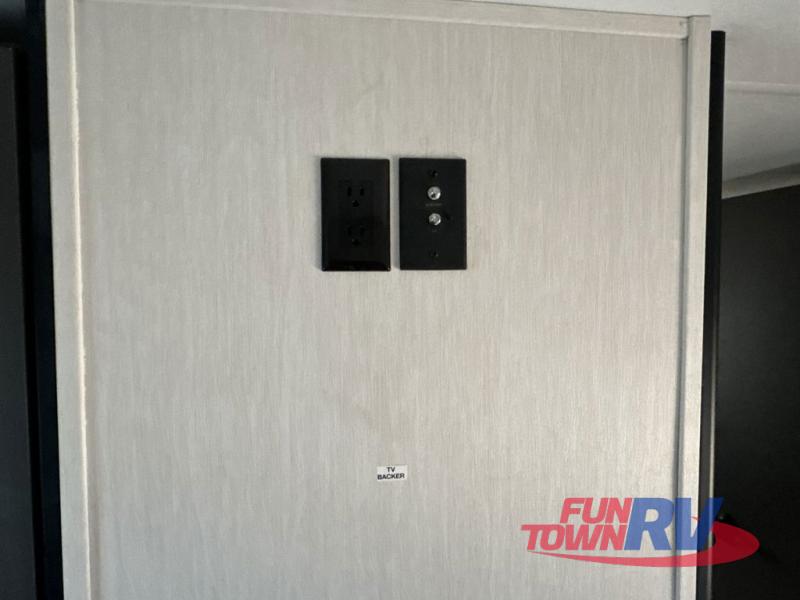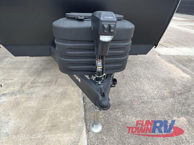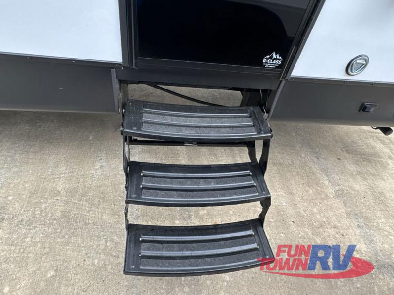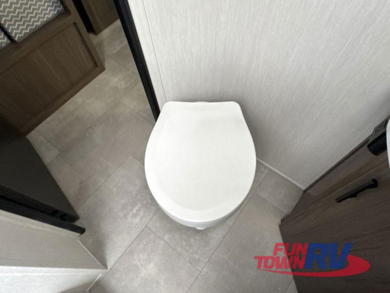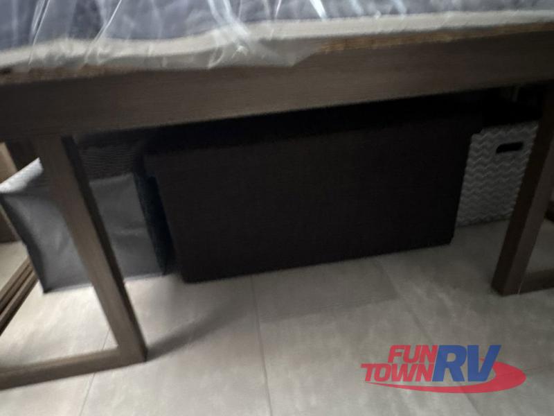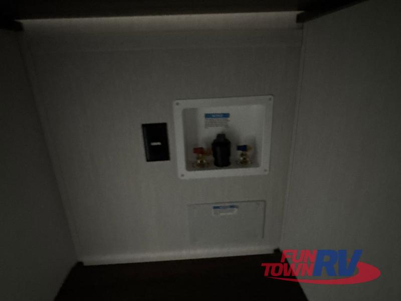 This travel trailer is the best option for a big family! The trailer boasts a spacious bunk bed above a sofa bed, providing ample sleeping space for kids and adults alike. The luxurious front king bed is a serene retreat, featuring expansive wardrobes and overhead cabinets for storing your essentials. The charming booth dinette is a cozy spot for meals or extra sleeping space, as well as the versatile jackknife sofa, which also provides additional sleeping space or a comfortable spot to relax. The sleek entertainment center is perfect for family movie nights. The well-appointed kitchen is equipped with a large fridge, convenient shelves, and a spacious pantry, making meal prep and storage an easy chore. The modern full bathroom features a well-stocked linen closet and provides a convenient space for freshening up. Plus, with two convenient entry/exit doors, this trailer offers added flexibility and ease of use, and the ample overhead cabinets provide additional storage space for your belongings.