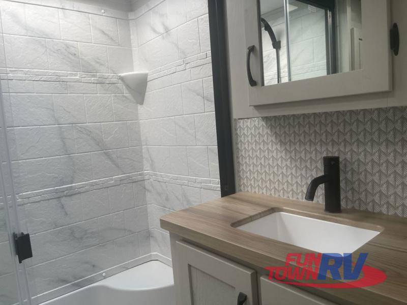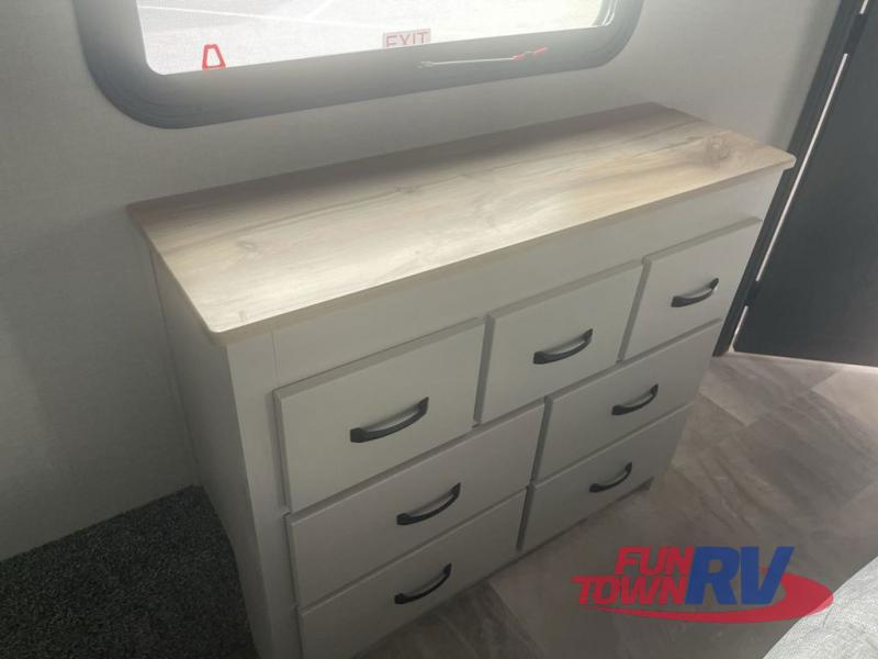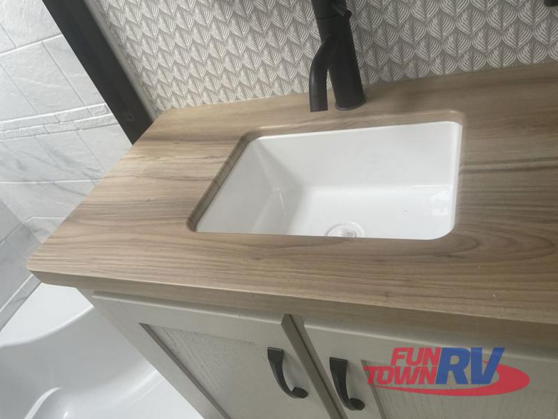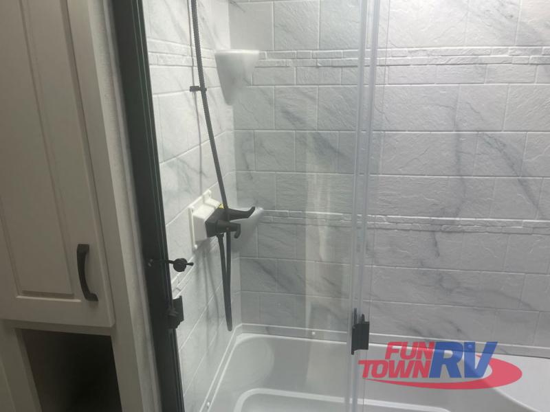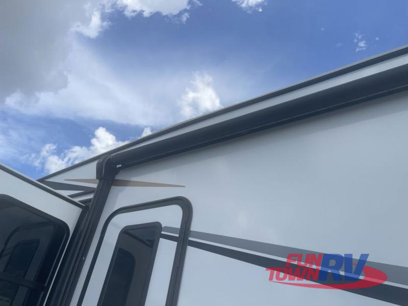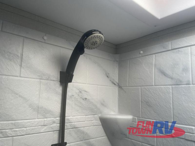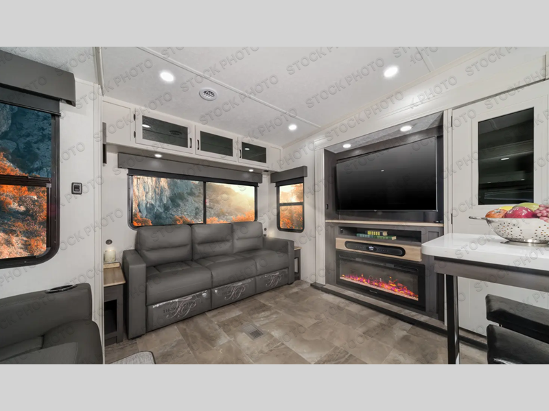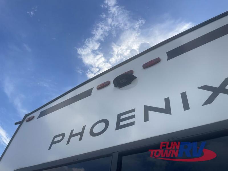 With any Phoenix mid-profile fifth wheel by Shasta RVs, the stand out construction features include residential 5" truss rafters, full walk-on roof decking, vacuum bonded and aluminum framed sidewalls with rot proof AZDEL composite sidewall panels. The Weather Shield+ offers cold and hot testing, 12V thermal tank heaters on all tanks, a sectionalized underbelly and heated gate valves and more so you can camp during any season you wish. The Road Armor Suspension by Trail Air will make towing easier than ever, and the upgraded marine-style convenience center includes a black tank flush plus a hot/cold shower to wash off hiking gear. Head inside to find solid surface countertops and sink covers, an upgraded 50" 4K Smart LED TV in the living room, USB/USB-C charging ports, and an upgraded 60K BTU on-demand water heater to name a few comforts!