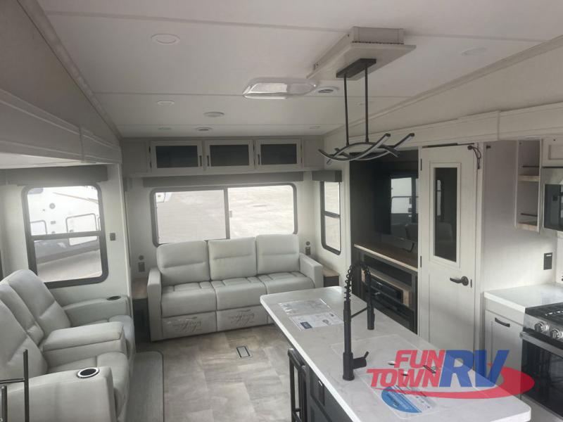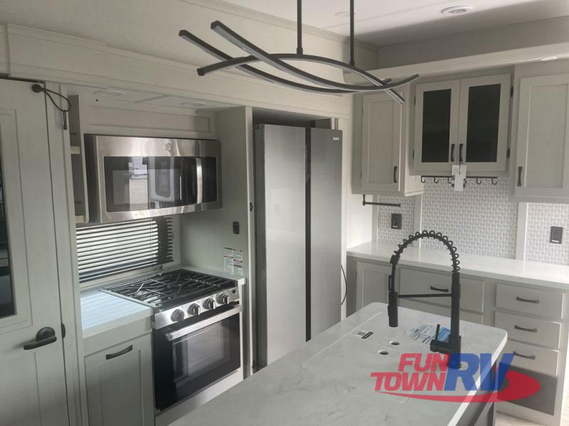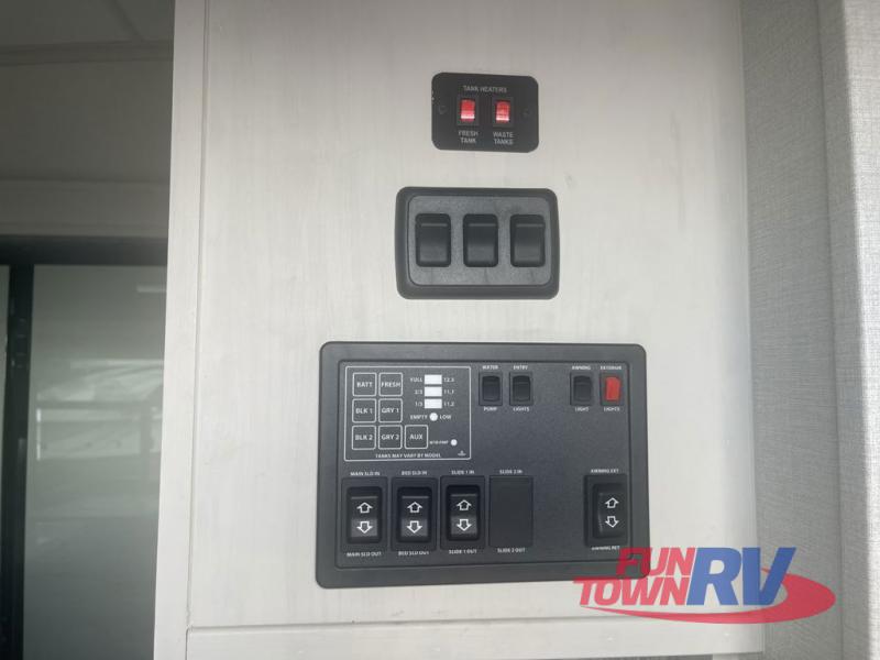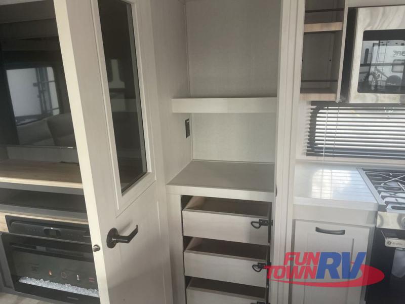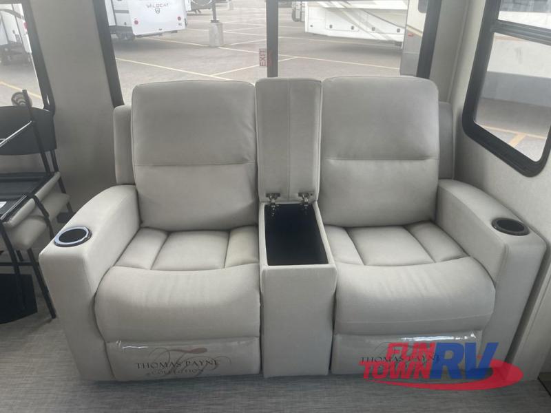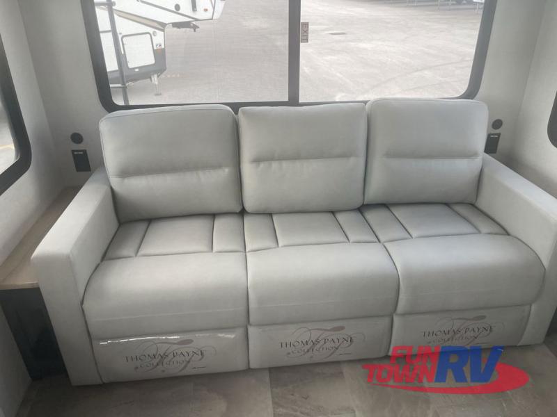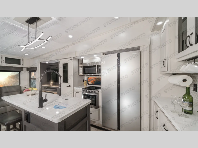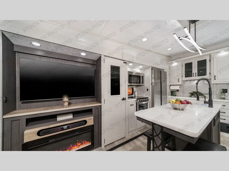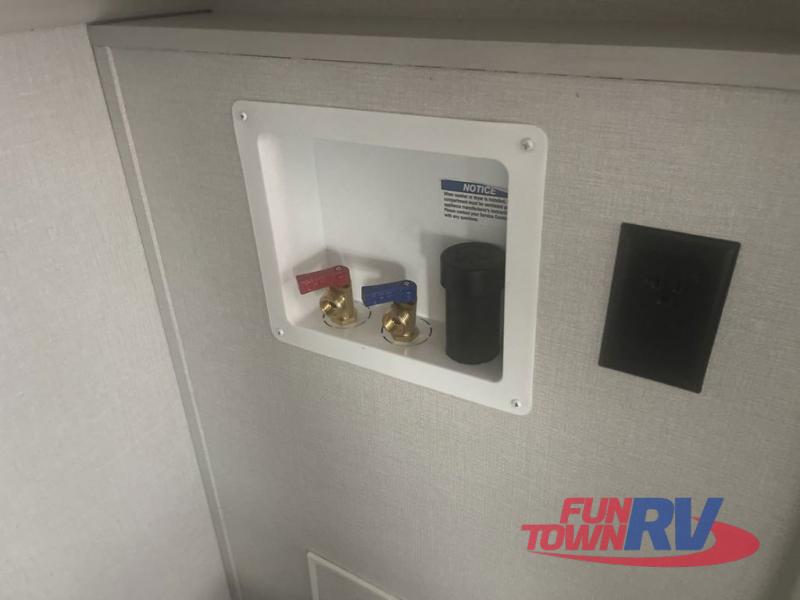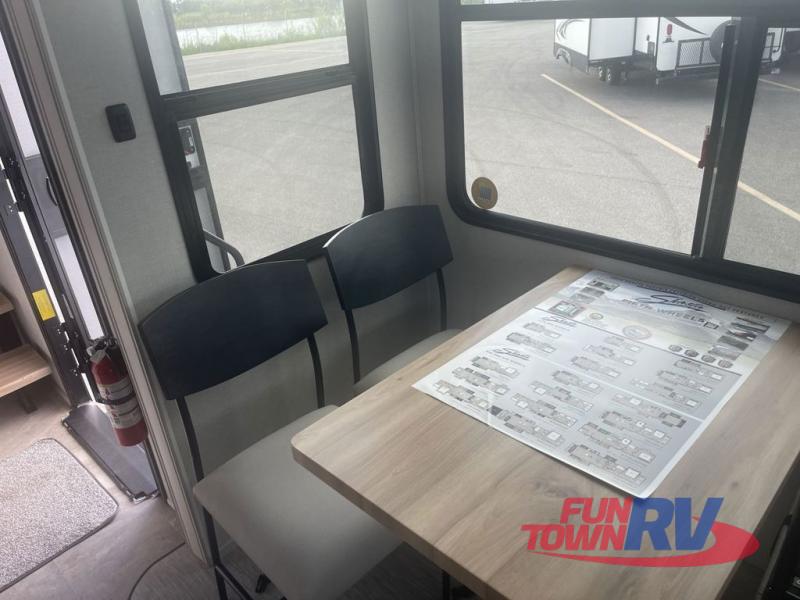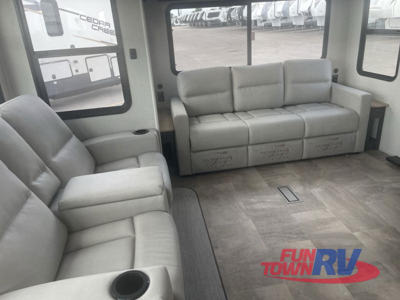 Sit back and relax on the theater seats, the rear tri-fold hide-a-bed sofa or on one of the four chairs at the free standing table. You can enjoy the outdoors through all the windows as you plan your outside activities. The cook may like to whip up a meal using the full kitchen amenities including two pantries, and extra counter space along one wall plus the island which includes two barstools. At night you can get cleaned up in the full bathroom with a shower that includes a seat and sliding glass doors, plus a large linen cabinet. The front bedroom offers privacy when you have overnight guests sleep on the sofa, and extra floor space to move about thanks to the slide. And the front wall wardrobe allows you to keep your clothes wrinkle-free, plus there is washer and dryer prep if you want to add those appliances.
