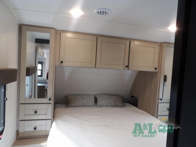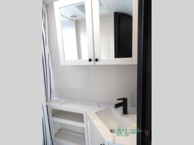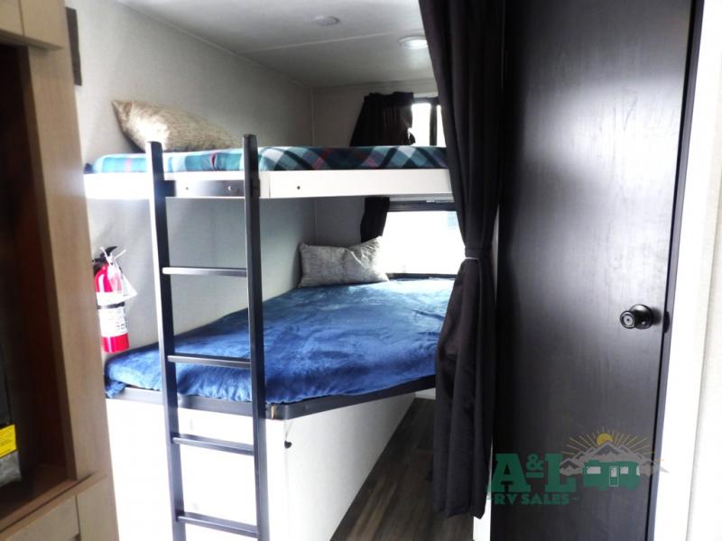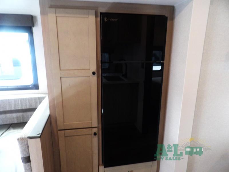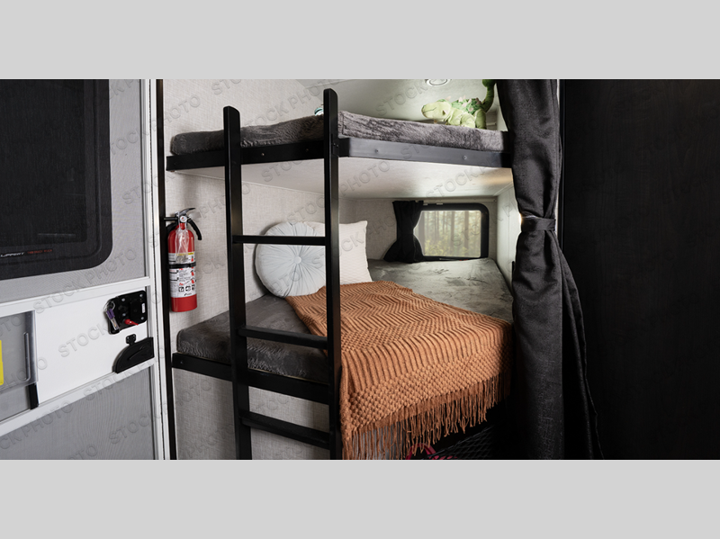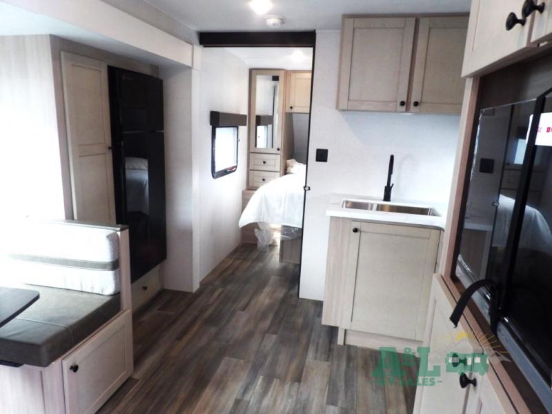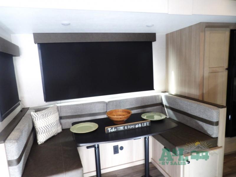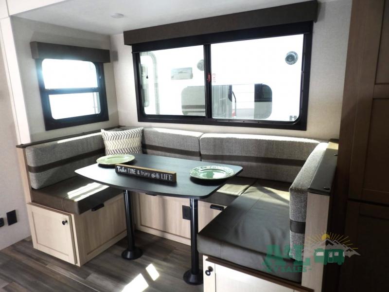 This trailer allows a bigger group enough space to sleep eight, plus an inside kitchen with full amenities and an outside kitchen to feed everyone! The combined living and kitchen area is spacious with a large slide out that includes the U-shaped dinette which doubles as sleeping space, a pantry and the 10 cu. ft. 12V refrigerator which allows more floor space when inside. The cook will enjoy the L-shaped area to make meals with overhead storage for cooking items, and everyone can watch the smart HDTV/entertainment center, and there is a second pantry behind the TV for even more storage. The full bathroom will keep everyone clean before bedtime, and the exterior spray port will keep your shoes and bikes clean.
