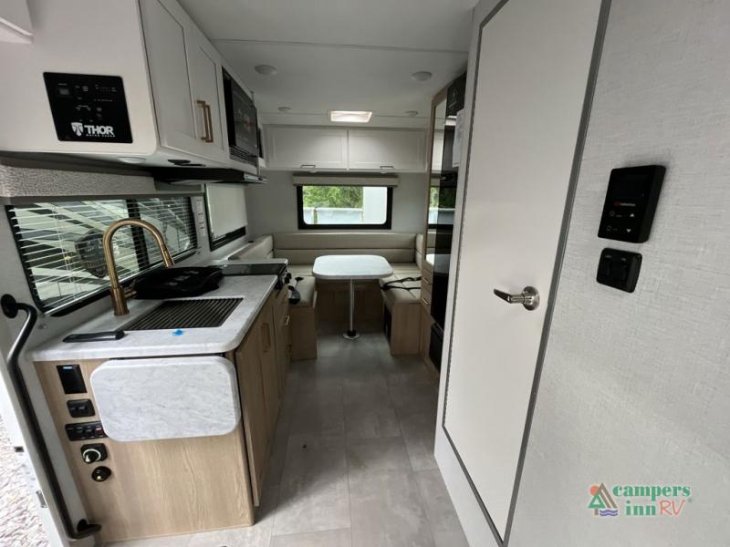 With any Chateau ESpec Essential Class C gas motorhome by Thor Motor Coach, you will find convenient amenities, a modern interior, and a reliable Ford E-Series chassis, with an optional Chevy chassis on select models to power your adventures. There is welded tubular aluminum roof and sidewall cage construction, a one-piece fiberglass front cap, and premium one-piece Crossflex exterior roofing for added strength. Residential vinyl flooring will be easy to keep clean, and you'll love the sleek look of the Coastline Grey flat panel cabinet doors. These motorhomes also include a 4.0 kW gas generator and a 30-amp shoreline power cord to keep you going, along with a tankless water heater and 13,500 roof front A/C to ensure your comfort!