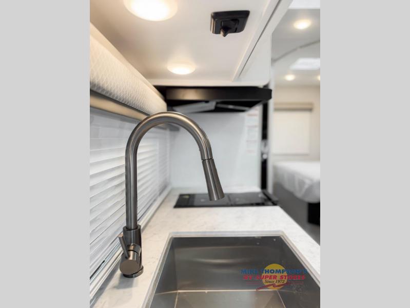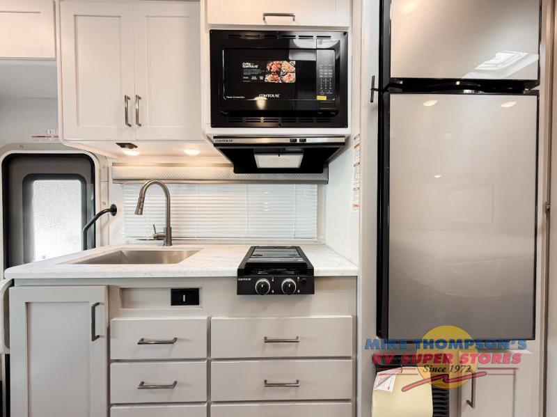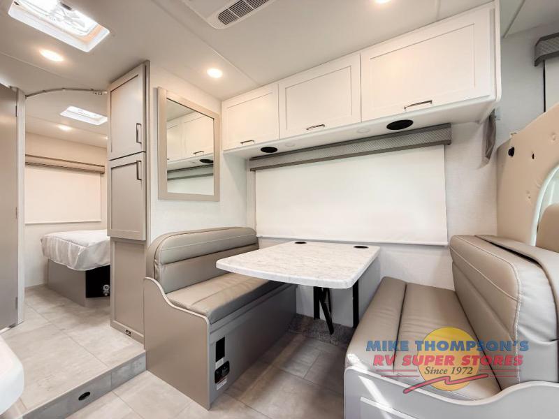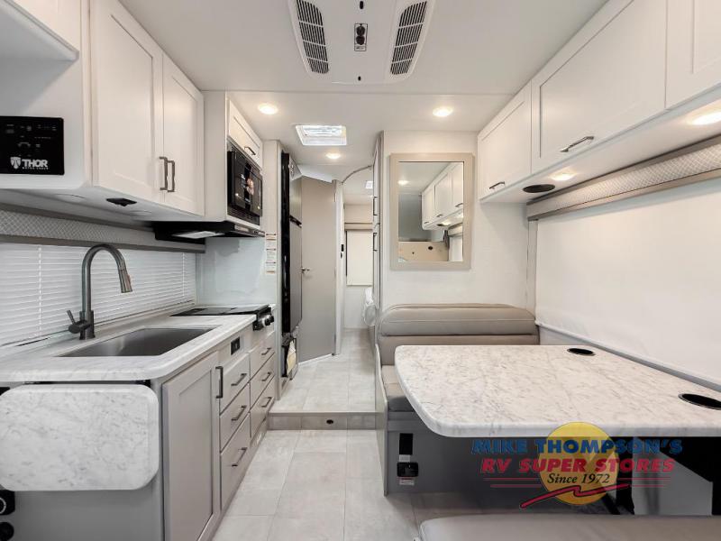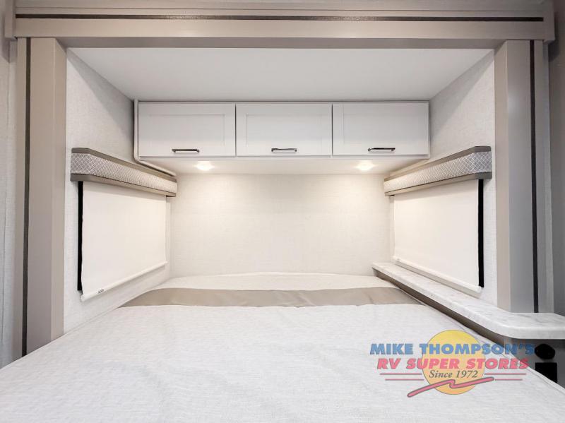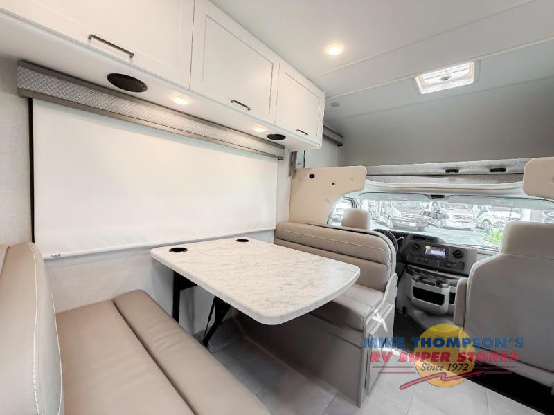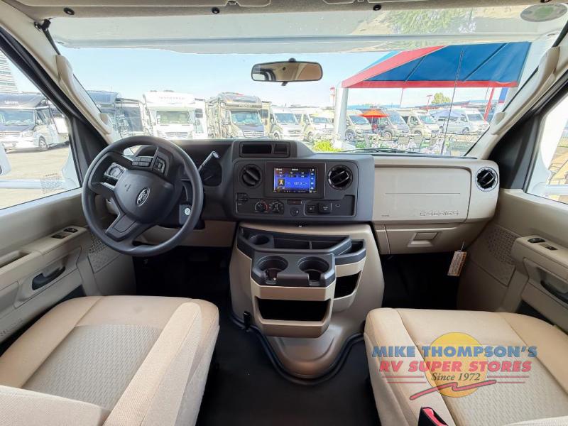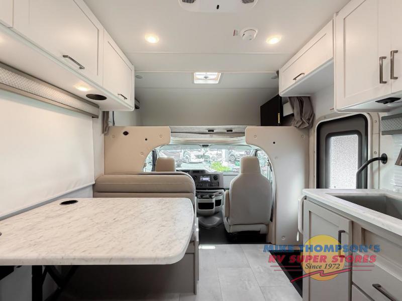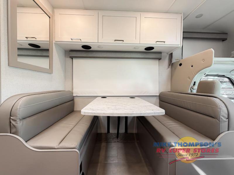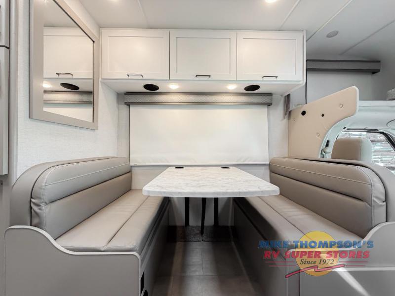 With any Chateau ESpec Essential Class C gas motorhome by Thor Motor Coach, you will find convenient amenities, a modern interior, and a reliable Ford E-Series chassis, with an optional Chevy chassis on select models to power your adventures. There is welded tubular aluminum roof and sidewall cage construction, a one-piece fiberglass front cap, and premium one-piece Crossflex exterior roofing for added strength. Residential vinyl flooring will be easy to keep clean, and you'll love the sleek look of the Coastline Grey flat panel cabinet doors. These motorhomes also include a 4.0 kW gas generator and a 30-amp shoreline power cord to keep you going, along with a tankless water heater and 13,500 roof front A/C to ensure your comfort!