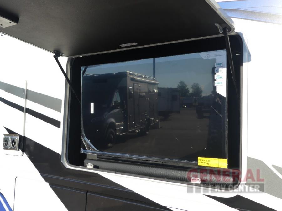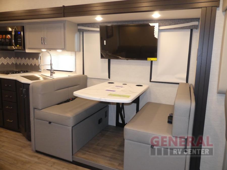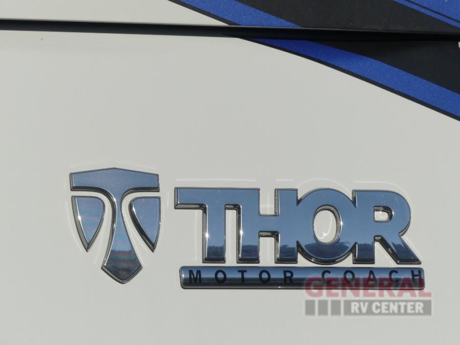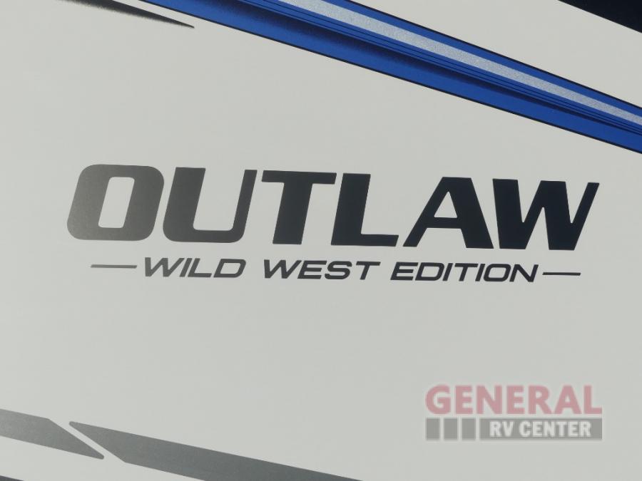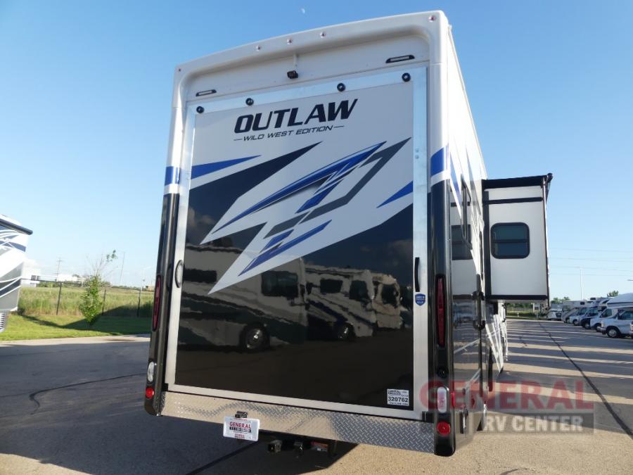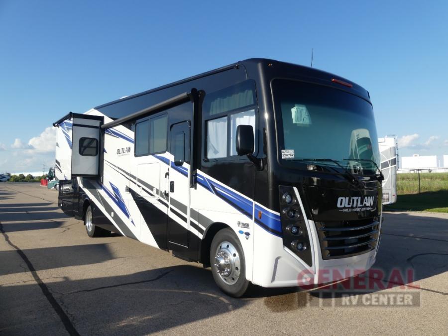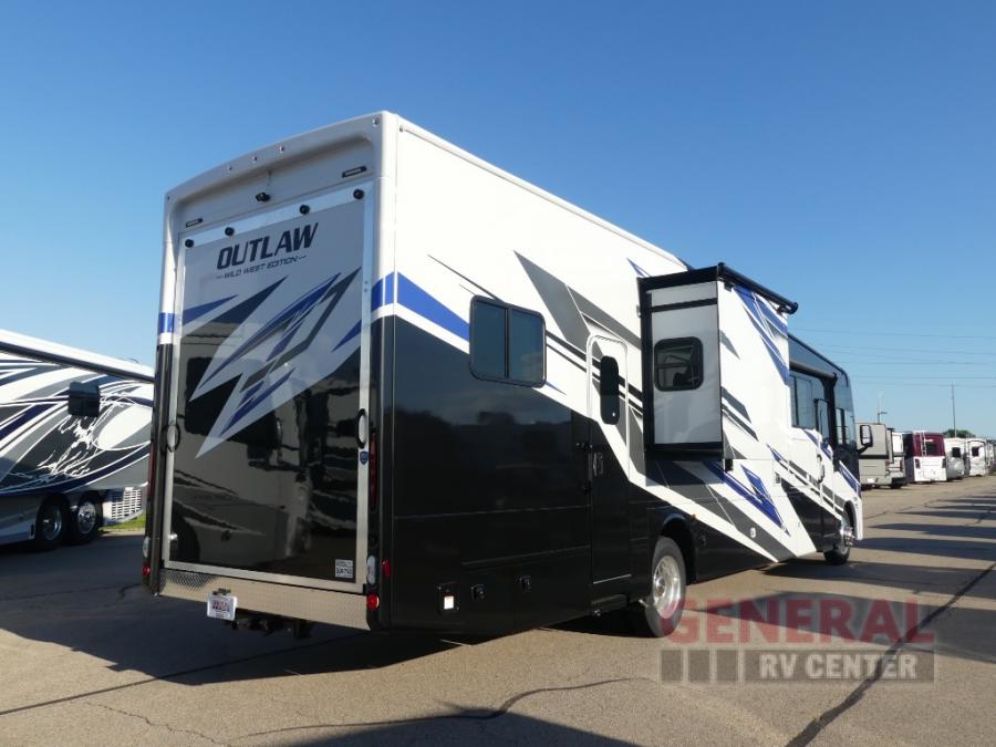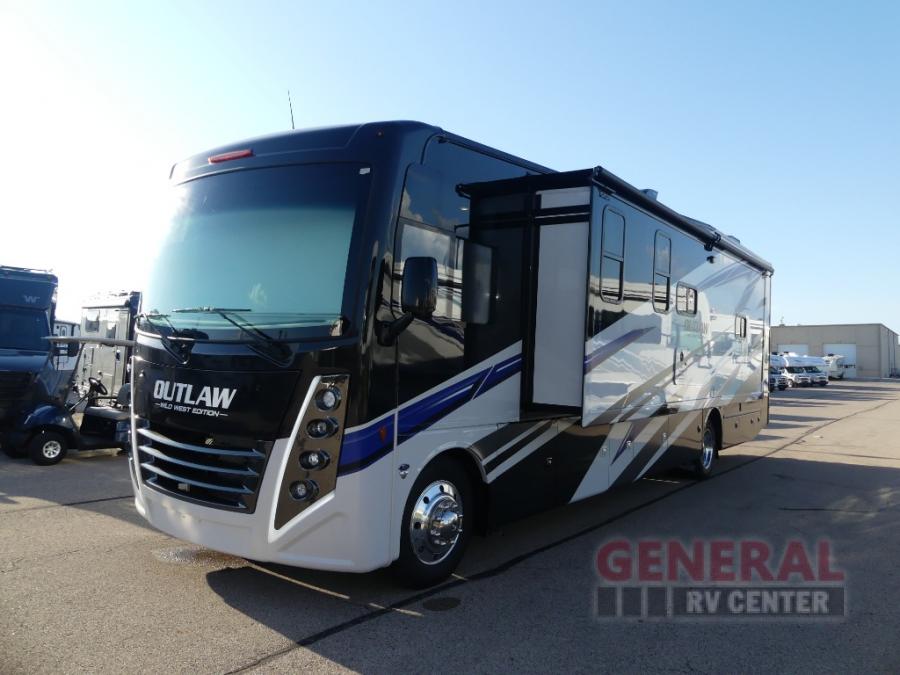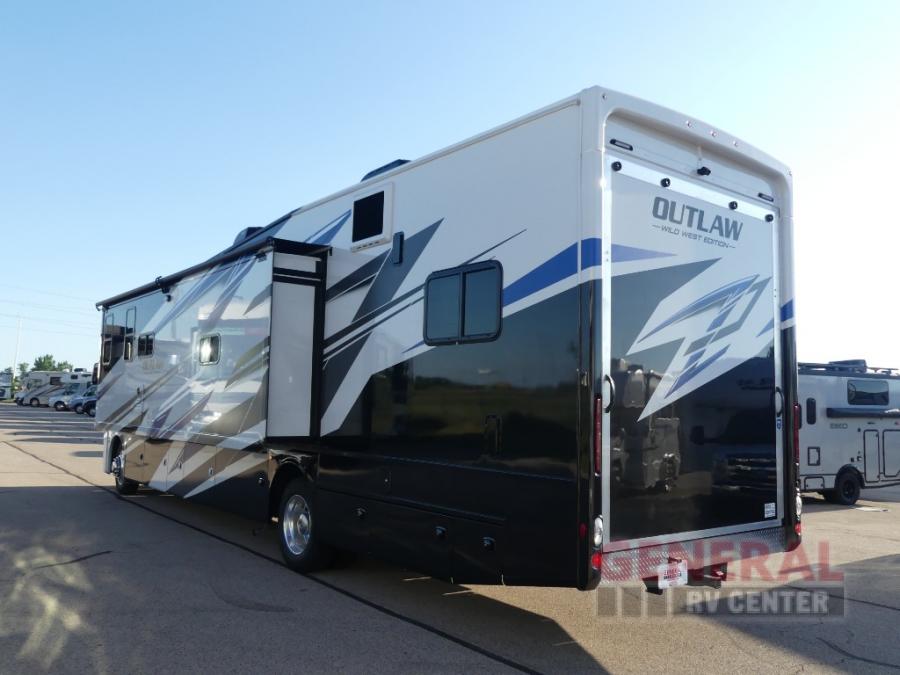 With any Outlaw Wild West Edition Class A gas toy hauler by Thor Motor Coach, you will have a capable and powerful motorhome for all your adventures. There is a vacu-bond laminated roof, walls, and floor with block foam insulation, a premium one-piece domed roof membrane, and a welded tubular steel floor for added strength. You will love having an 8,000 lb. trailer hitch for your towing needs, and the air ventilation sidewalls vents in the garage will be appreciated when gas and oil odors are present. Head inside to find residential vinyl flooring, full extension soft close metal ball-bearing drawer guides, and solid surface countertops in the kitchen. Some of the cockpit features the driver will enjoy are the 10.1" touchscreen dash radio, the blind spot detection, and the back-up monitor for easier parking. The RapidCamp+ multiplex wiring control system with a 7" screen also comes standard, along with an Onan RV QG 5500 gas generator with automatic generator start for added convenience. More utilities include a tankless water heater, a whole coach water filtration system, a 100-watt solar charging system, and more!