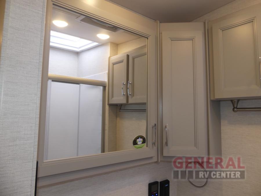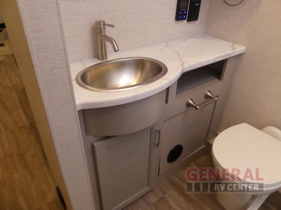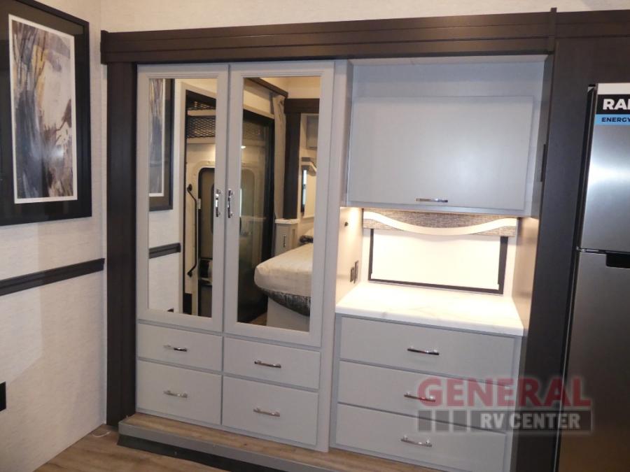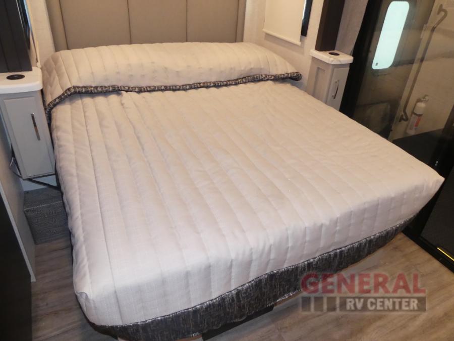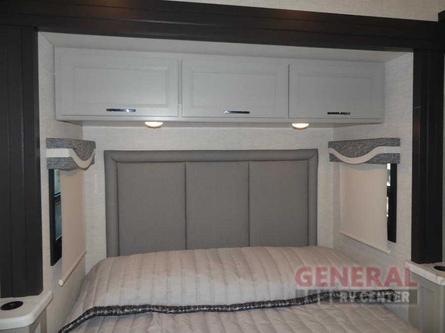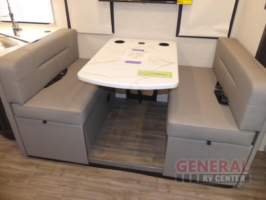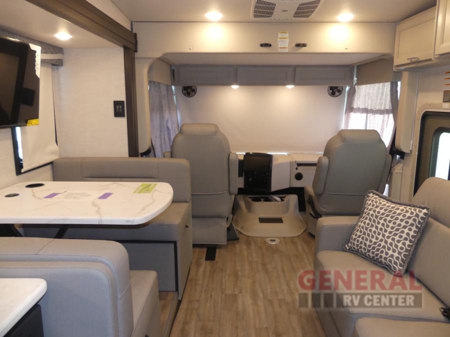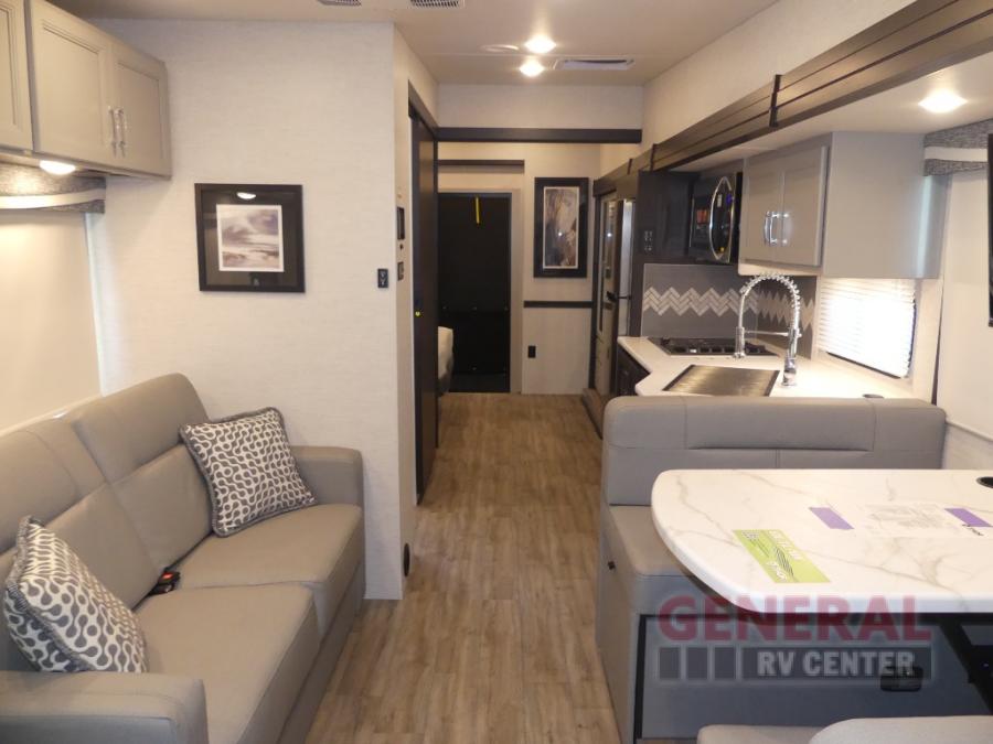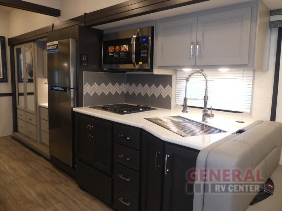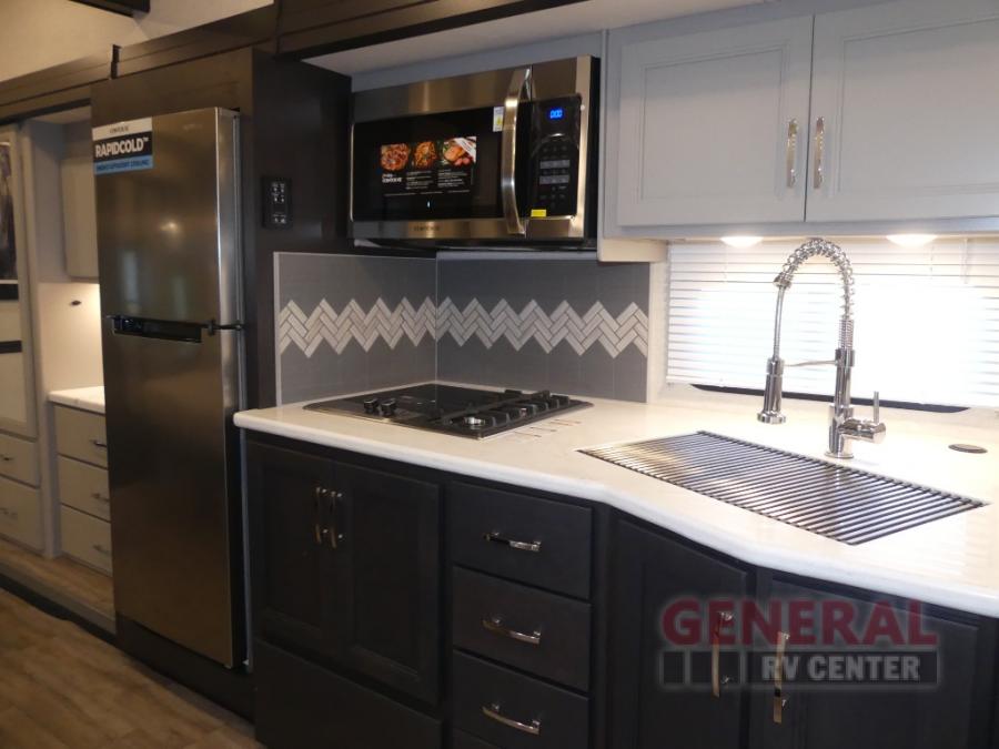 With any Outlaw Wild West Edition Class A gas toy hauler by Thor Motor Coach, you will have a capable and powerful motorhome for all your adventures. There is a vacu-bond laminated roof, walls, and floor with block foam insulation, a premium one-piece domed roof membrane, and a welded tubular steel floor for added strength. You will love having an 8,000 lb. trailer hitch for your towing needs, and the air ventilation sidewalls vents in the garage will be appreciated when gas and oil odors are present. Head inside to find residential vinyl flooring, full extension soft close metal ball-bearing drawer guides, and solid surface countertops in the kitchen. Some of the cockpit features the driver will enjoy are the 10.1" touchscreen dash radio, the blind spot detection, and the back-up monitor for easier parking. The RapidCamp+ multiplex wiring control system with a 7" screen also comes standard, along with an Onan RV QG 5500 gas generator with automatic generator start for added convenience. More utilities include a tankless water heater, a whole coach water filtration system, a 100-watt solar charging system, and more!