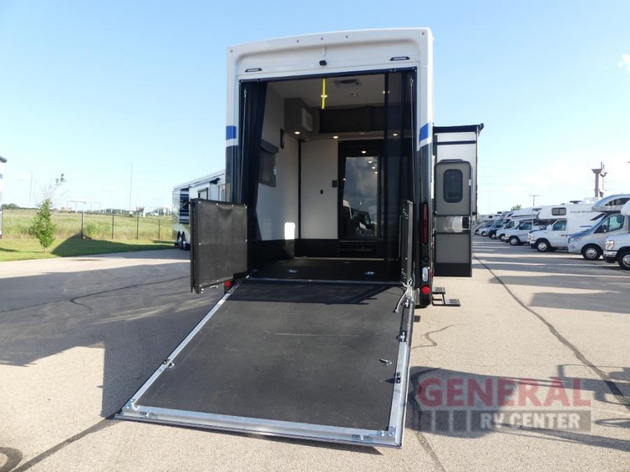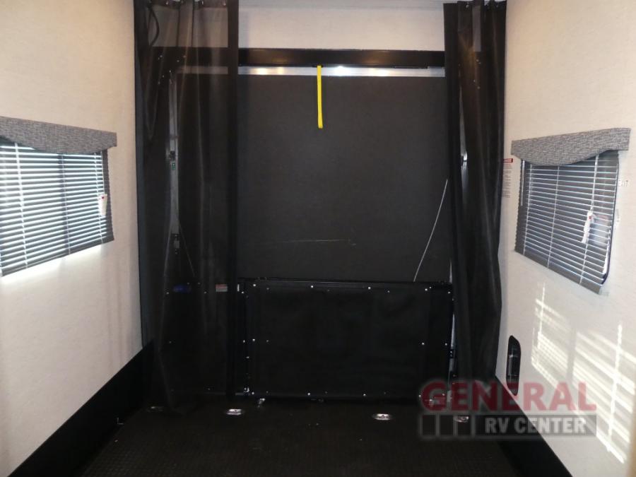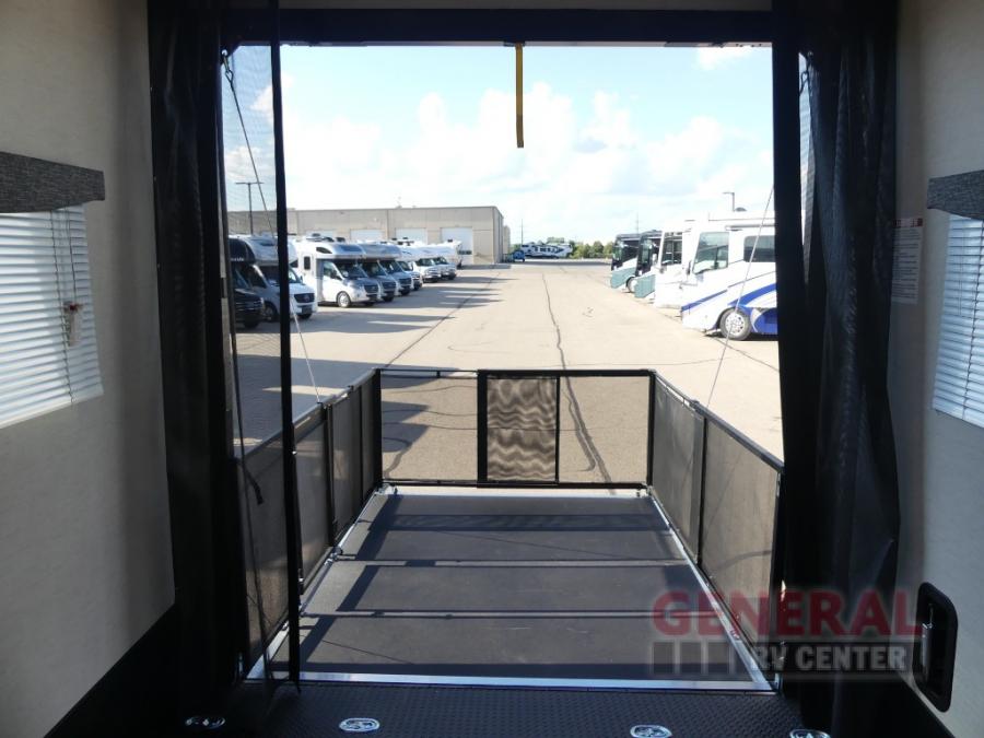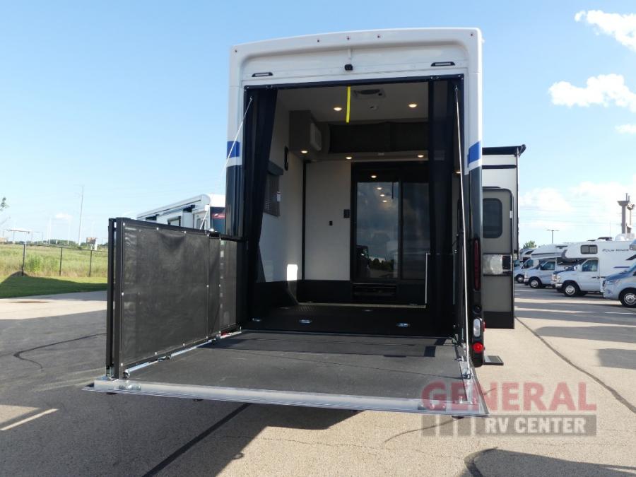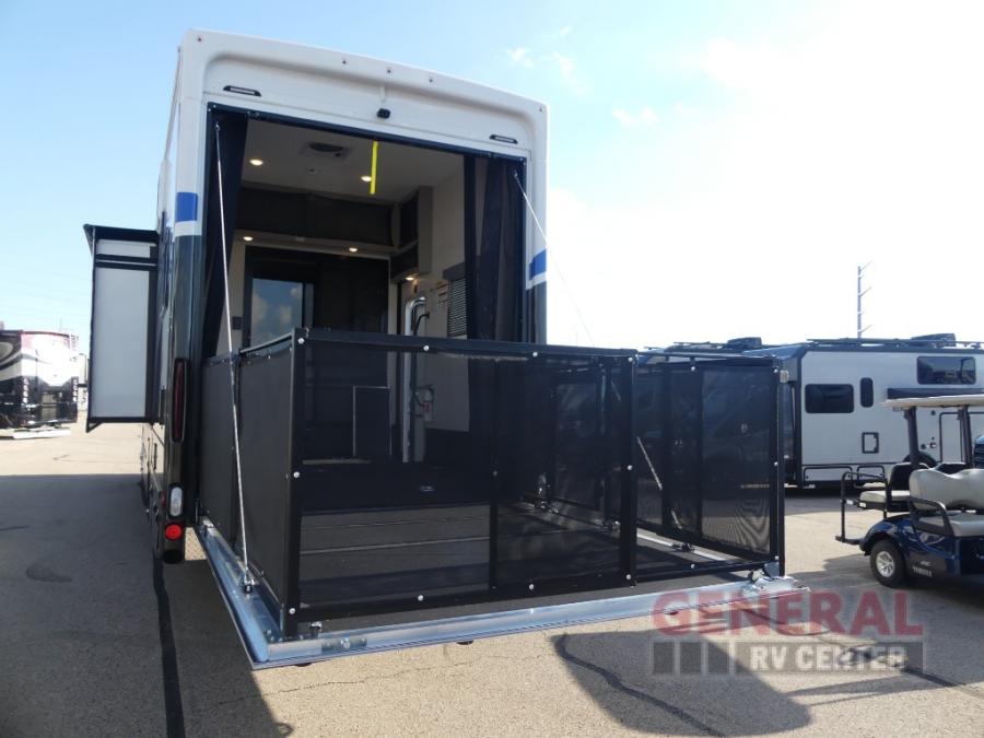 Whether you're heading to the lake, a bike show, or business expo, this toy hauler coach will be perfect for all your needs. You will have an 8' x 10' 2" garage with ample space for your items, and the bug screen on the back will let you enjoy fresh air without the bugs. You can also use the ramp door as a patio deck when you want to entertain guests! The private bedroom includes an RV queen bed with TV prep and a closet to keep your clothes tidy. The kitchen includes a two burner gas range with a single induction cooktop, an over-the-range convection microwave, and a residential refrigerator for generous food storage. Your crew can get comfortable on the Dream Dinette and sofa bed, and there is a drop-down overhead bunk for more sleeping space. And the full-wall slide here will open up your whole coach for more comfort!