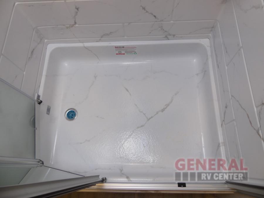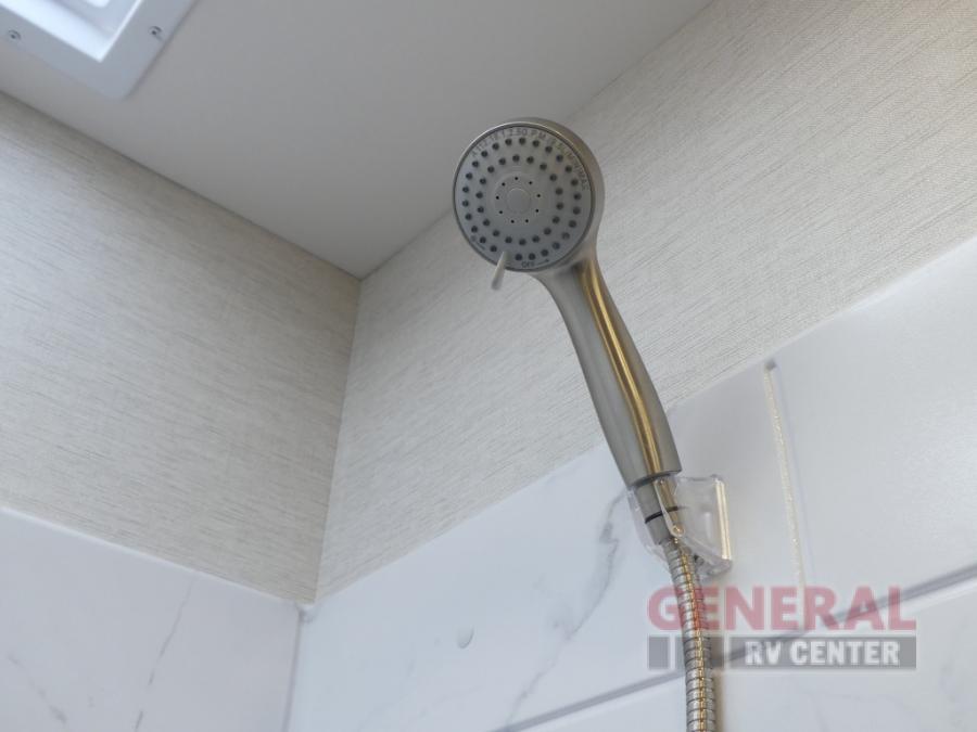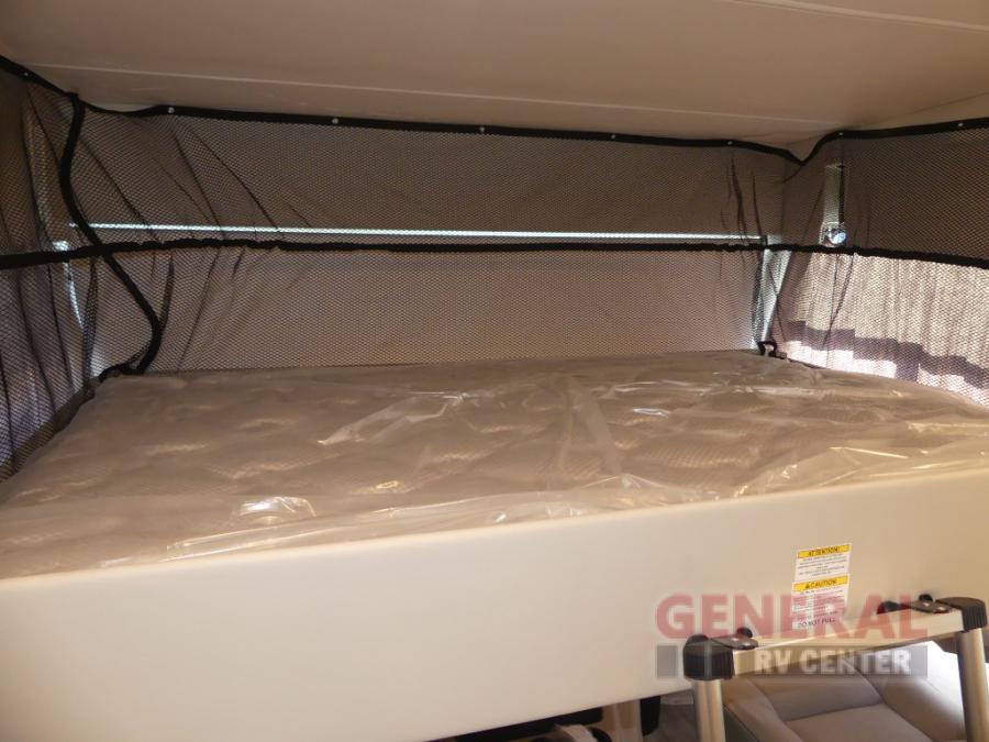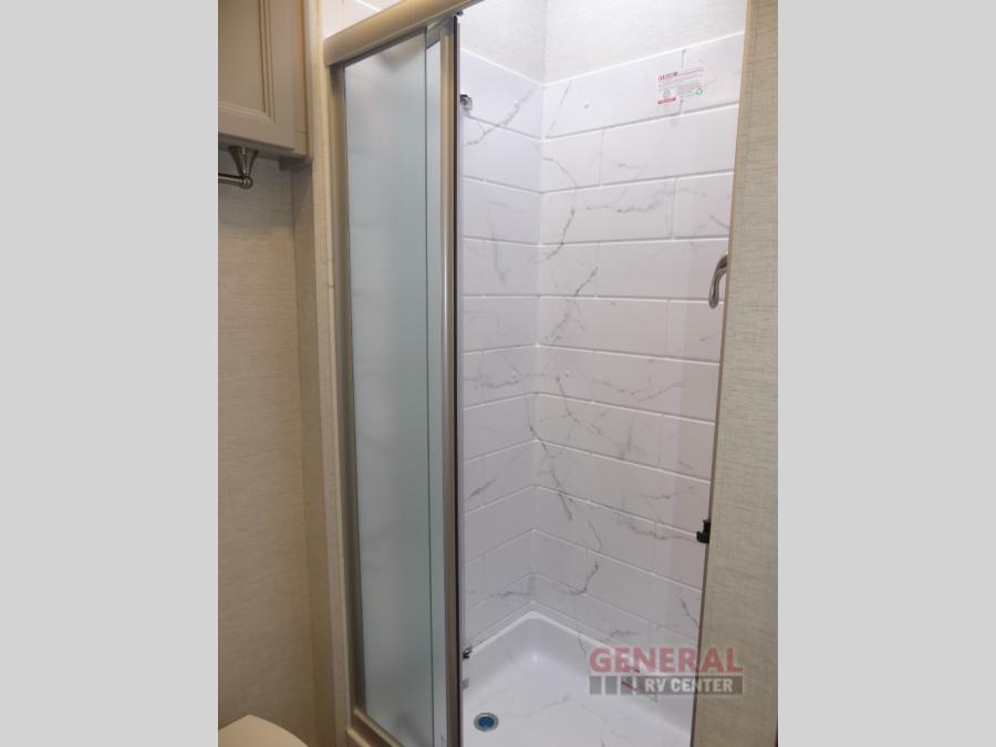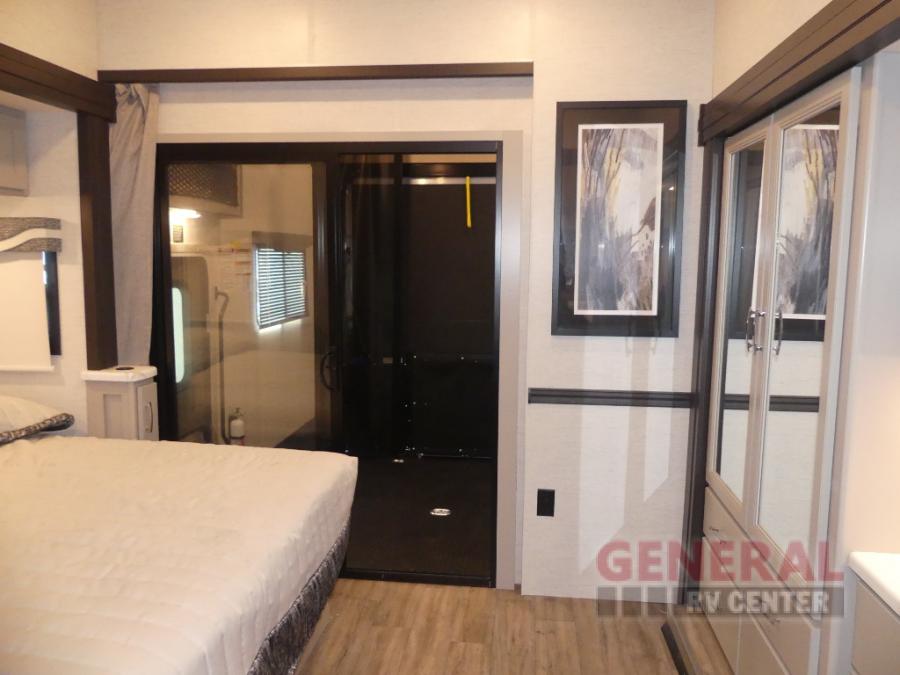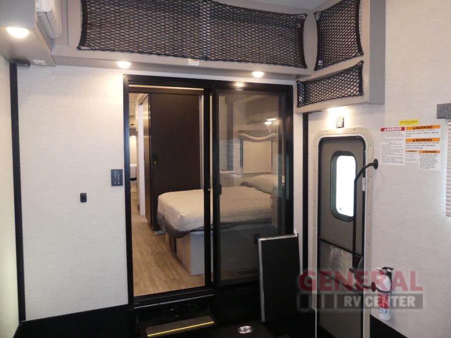 Whether you're heading to the lake, a bike show, or business expo, this toy hauler coach will be perfect for all your needs. You will have an 8' x 10' 2" garage with ample space for your items, and the bug screen on the back will let you enjoy fresh air without the bugs. You can also use the ramp door as a patio deck when you want to entertain guests! The private bedroom includes an RV queen bed with TV prep and a closet to keep your clothes tidy. The kitchen includes a two burner gas range with a single induction cooktop, an over-the-range convection microwave, and a residential refrigerator for generous food storage. Your crew can get comfortable on the Dream Dinette and sofa bed, and there is a drop-down overhead bunk for more sleeping space. And the full-wall slide here will open up your whole coach for more comfort!