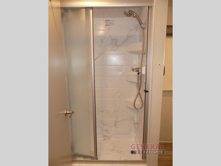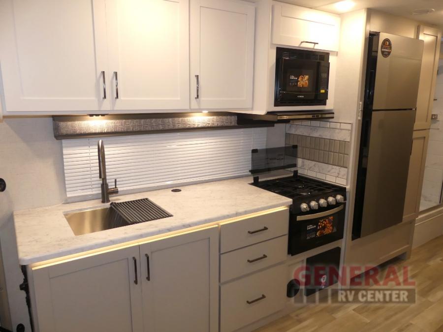 You're sure to have a great time in this coach that can sleep six each night! The rear bedroom includes an RV queen bed and dual closets to keep your things organized, plus the bath is close by for easy nighttime use. Here, you'll find a private toilet and sink, with the independent shower right across the hall. Your guests can sleep on the 70" dream dinette within the large slide out, or the cab-over bunk up front! A three burner gas cooktop and microwave oven will let you make meals for your crew, and a 12V refrigerator will keep perishables fresh. This unit also includes an exterior kitchen, allowing you to cook in the open fresh air!