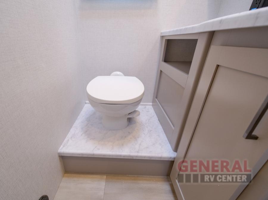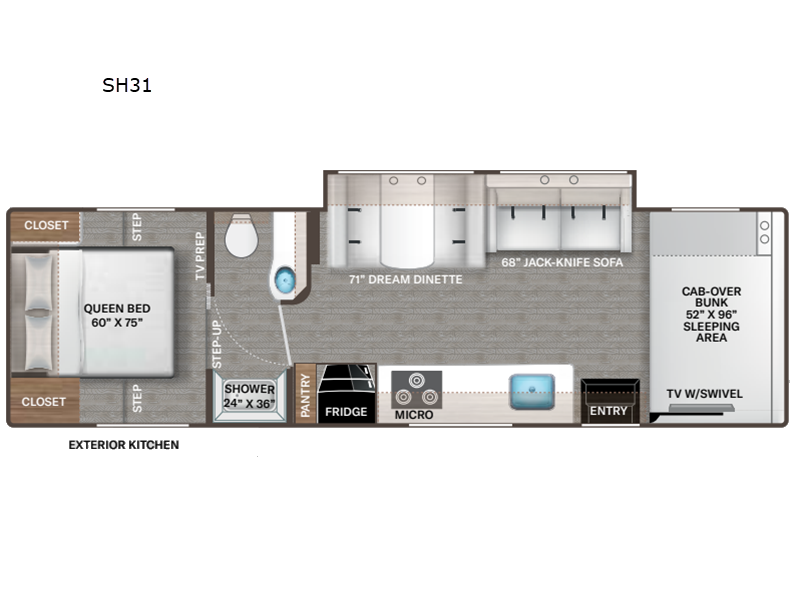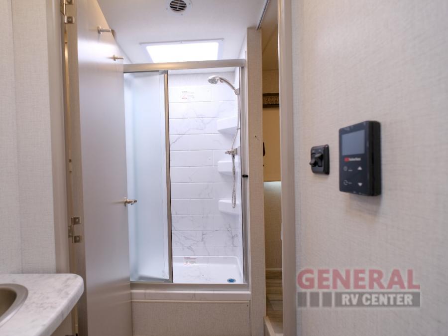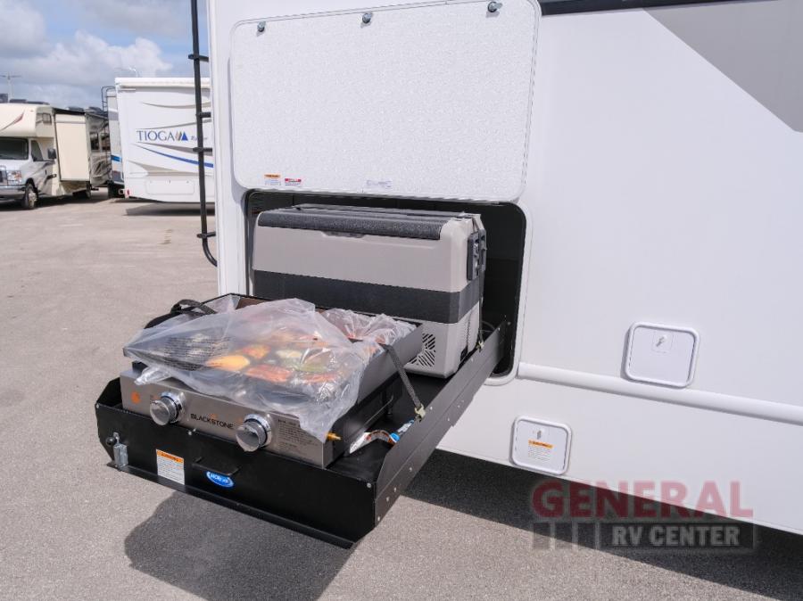 You're sure to have a great time in this coach that can sleep six each night! The rear bedroom includes an RV queen bed and dual closets to keep your things organized, plus the bath is close by for easy nighttime use. Here, you'll find a private toilet and sink, with the independent shower right across the hall. Your guests can sleep on the 70" dream dinette within the large slide out, or the cab-over bunk up front! A three burner gas cooktop and microwave oven will let you make meals for your crew, and a 12V refrigerator will keep perishables fresh. This unit also includes an exterior kitchen, allowing you to cook in the open fresh air!
