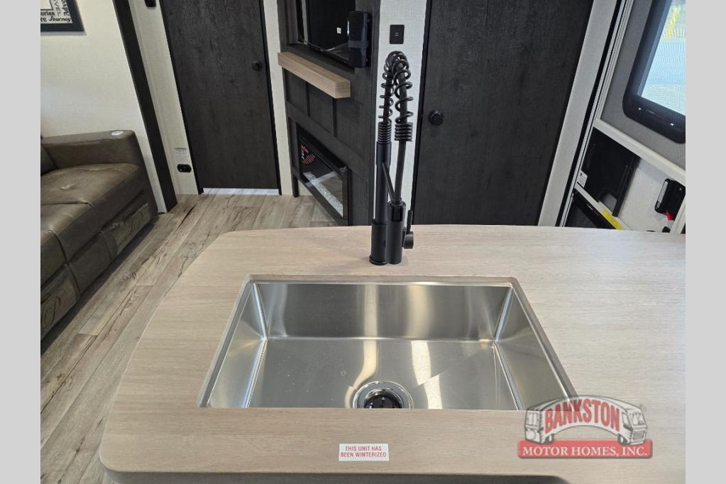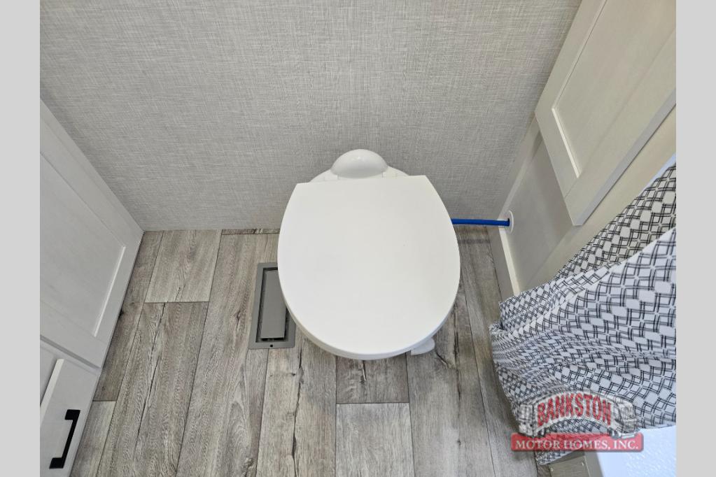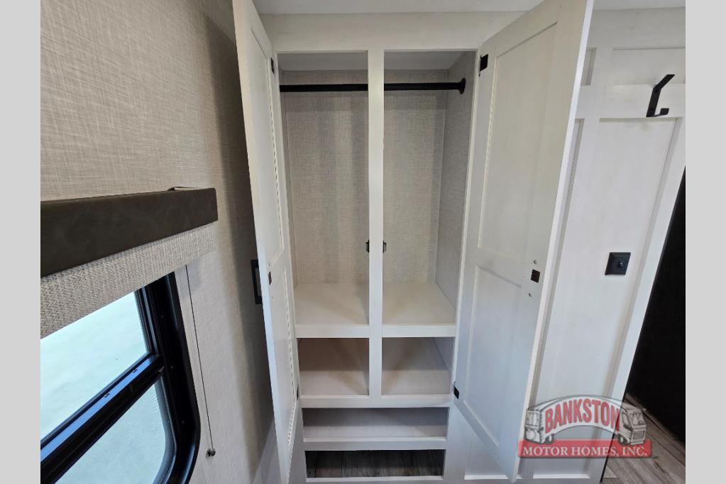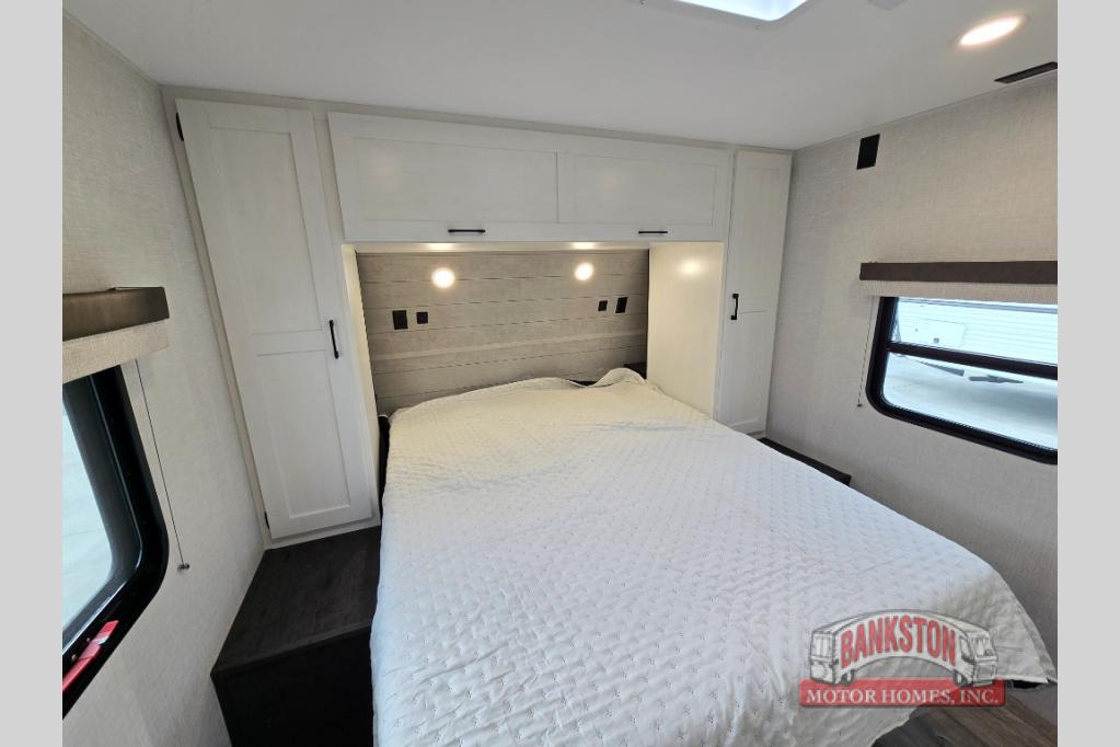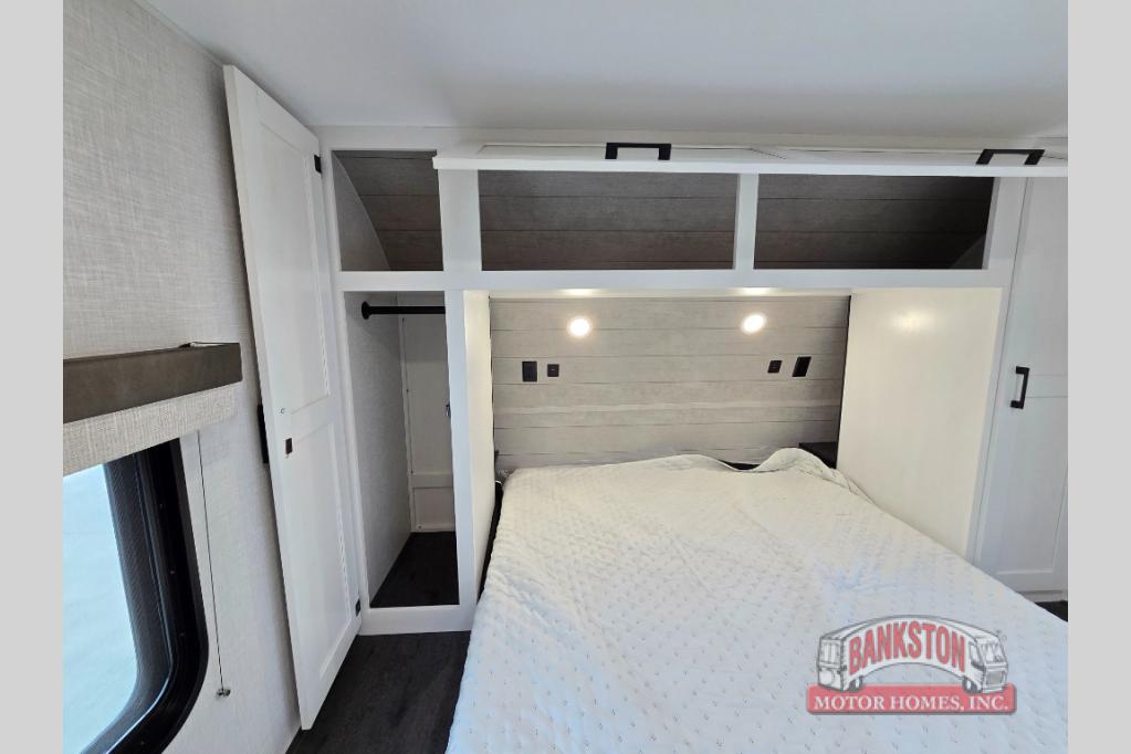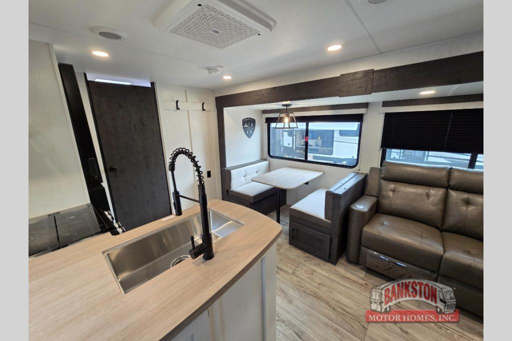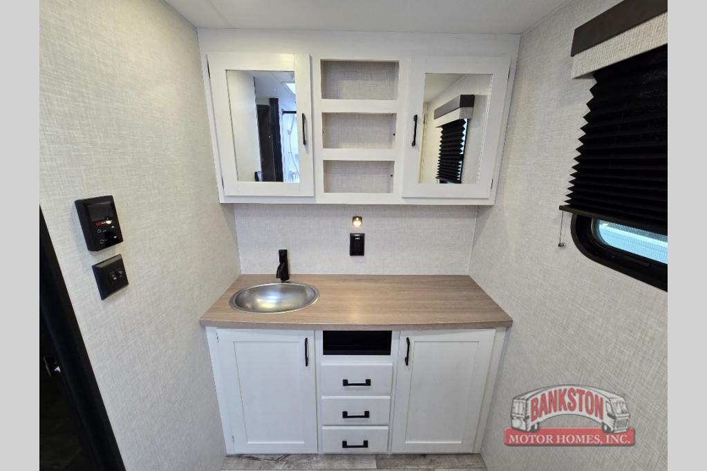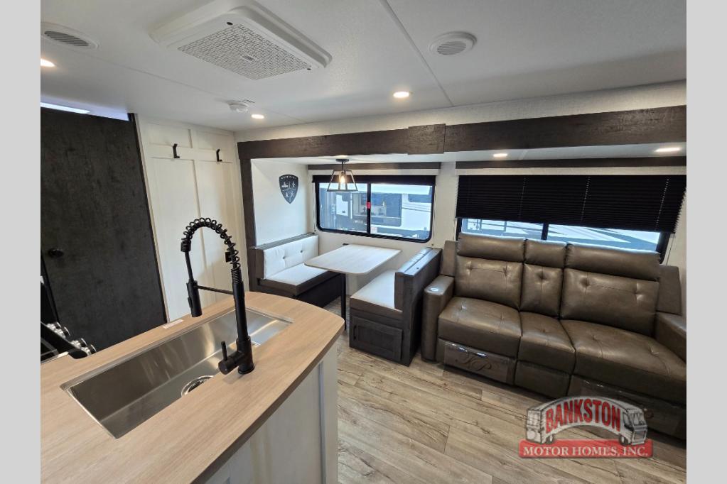 You will be enchanted by this travel trailer features! Starting with the rear bathroom which offers a convenient linen closet, keeping your essentials within reach. Moving forward to the kitchen area, the sit n’ slide booth dinette is a fun and functional spot for meals or socializing, also the kitchen is well-equipped with a 10 cu refrigerator, three-burner cooktop, and pantry, making you feel right at home. For the entertainment and leisure, the sofa provides a comfortable spot to relax, and the fireplace adds a cozy touch to the interior plus, the 40” TV is perfect for family movie nights or enjoying your favorite shows on the go. The front bedroom offers a spacious queen bed, overhead cabinet, and wardrobe. The exterior awning provides shade and protection from the elements, while the pass-through storage will provide ample space for your outdoor gear and equipment.