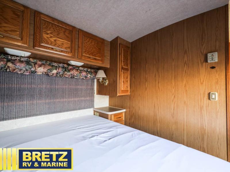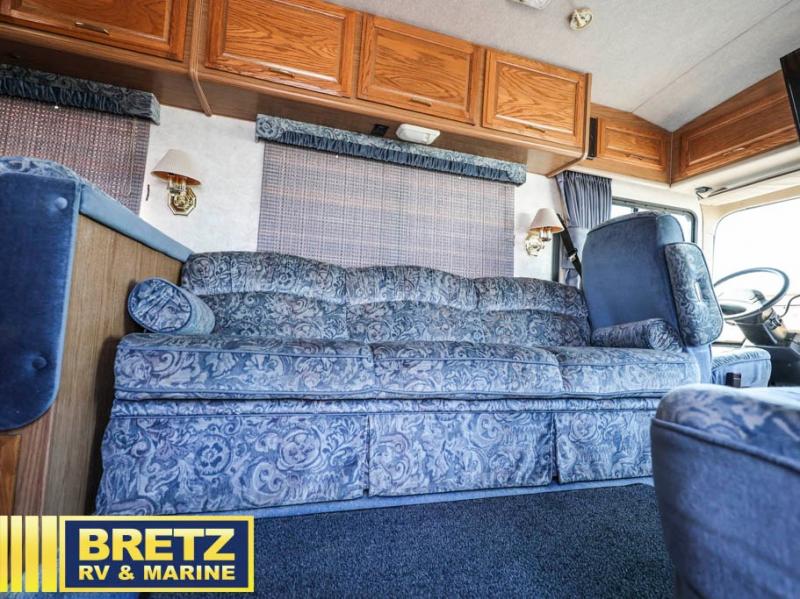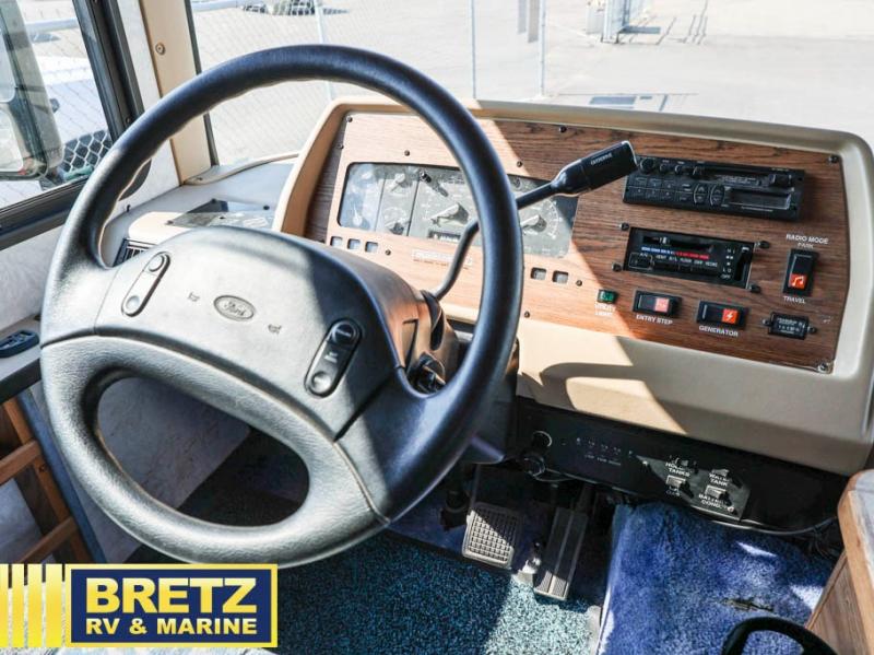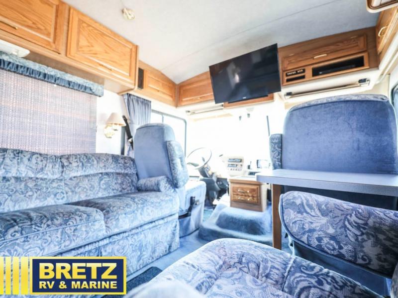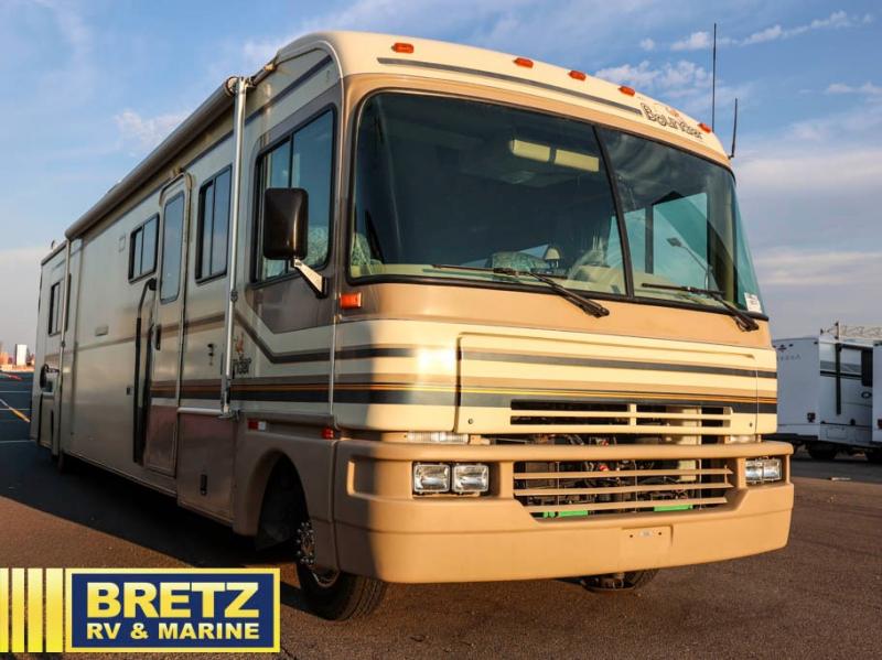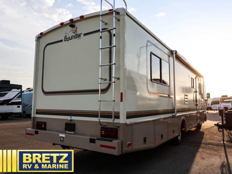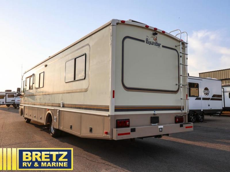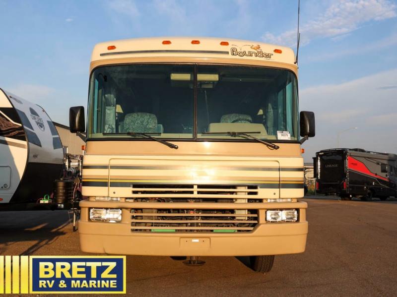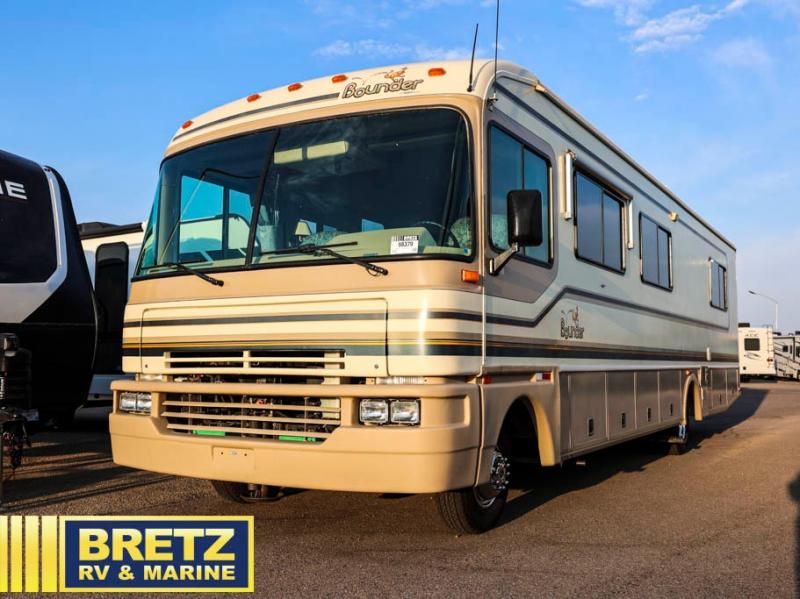 The 1995 Bounder 34J is a 34-foot, Class A motorhome built by Fleetwood on either a Chevrolet or Ford chassis, featuring a queen-size bed, full kitchen and bath, and 2 air conditioners powered by a generator. It offers significant onboard storage, hydraulic leveling jacks, and an awning. While specific features vary by unit, many were equipped with amenities like a microwave, oven, stovetop, and a large refrigerator with a freezer.