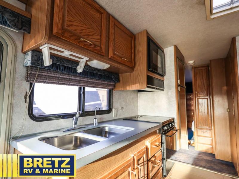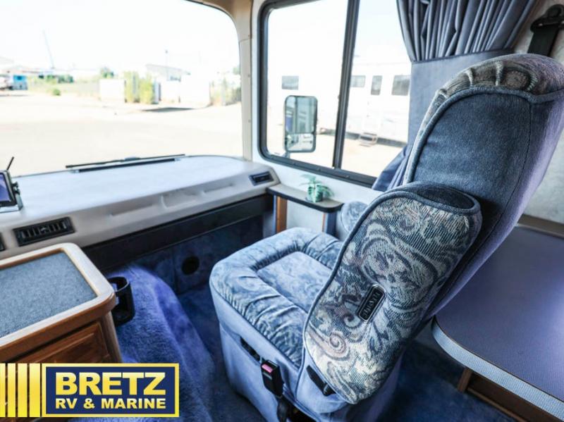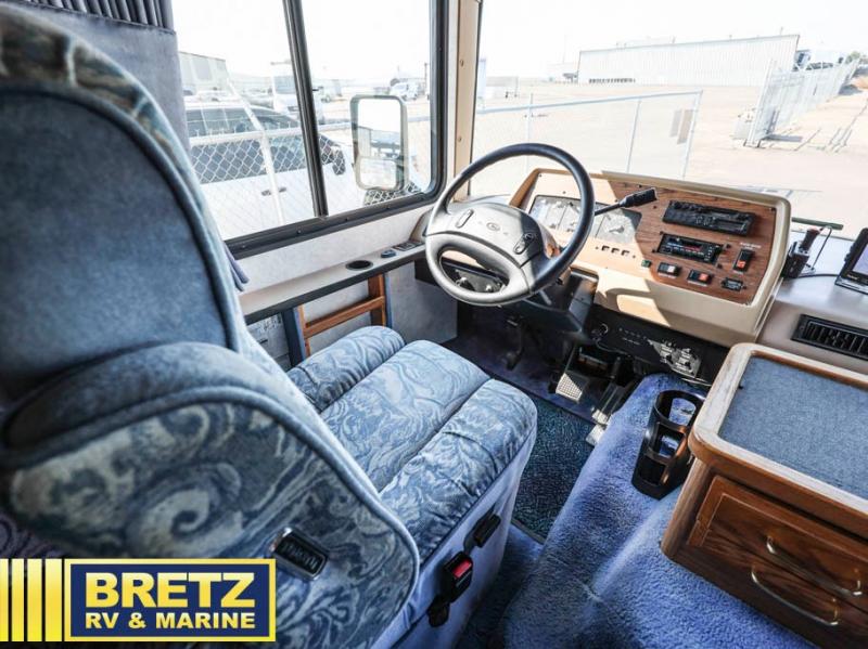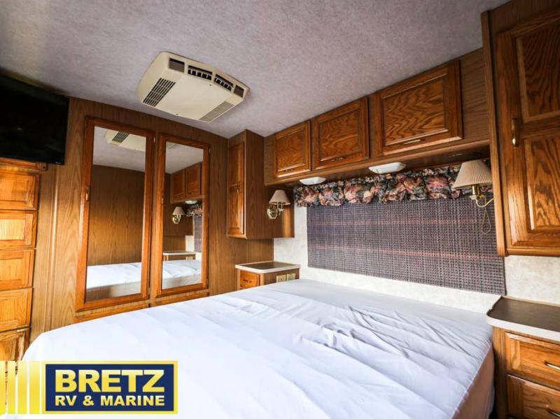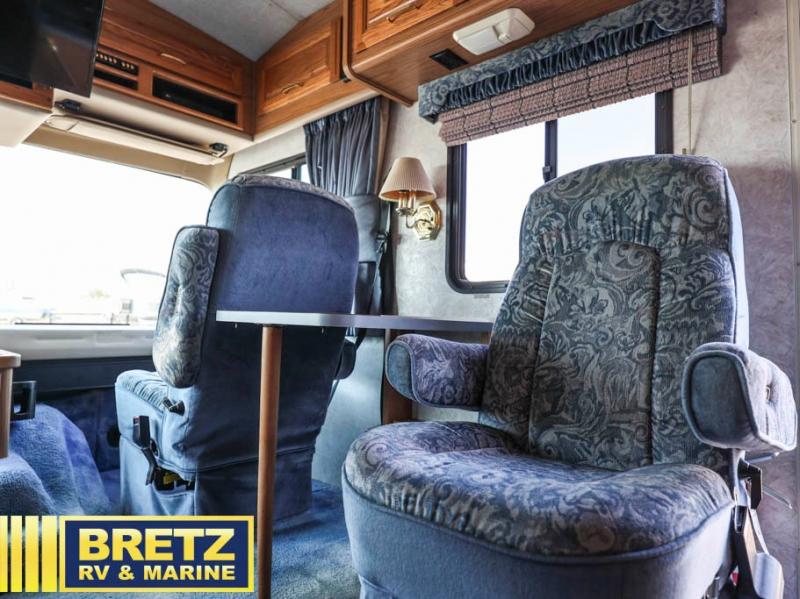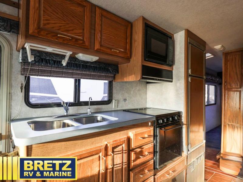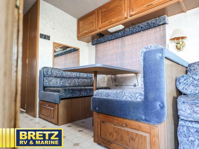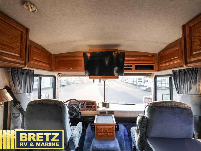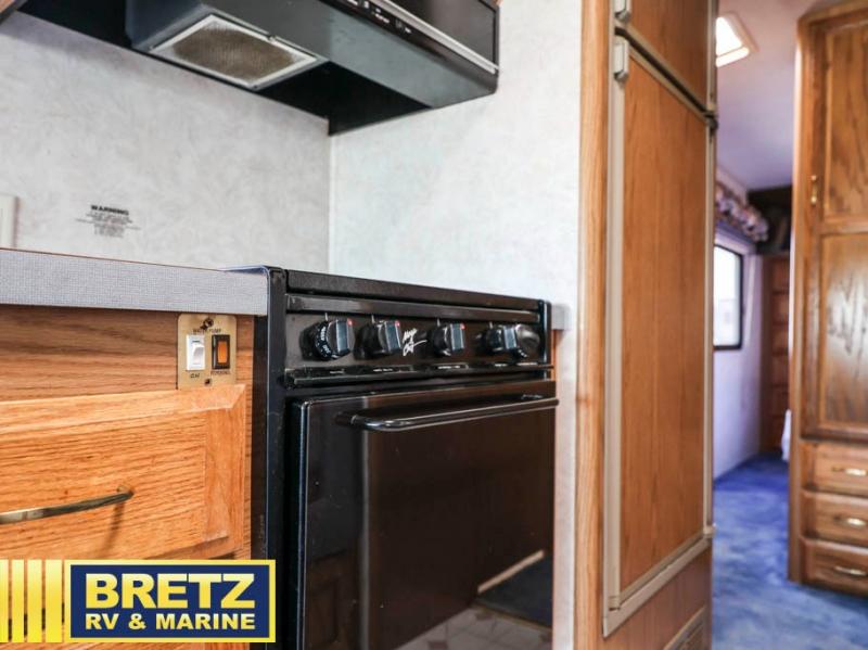 The 1995 Bounder 34J is a 34-foot, Class A motorhome built by Fleetwood on either a Chevrolet or Ford chassis, featuring a queen-size bed, full kitchen and bath, and 2 air conditioners powered by a generator. It offers significant onboard storage, hydraulic leveling jacks, and an awning. While specific features vary by unit, many were equipped with amenities like a microwave, oven, stovetop, and a large refrigerator with a freezer.