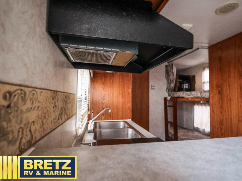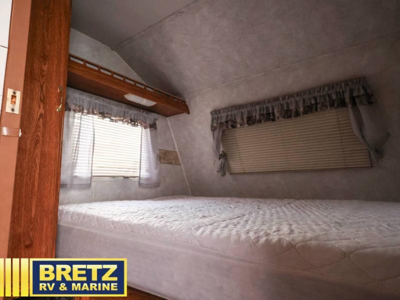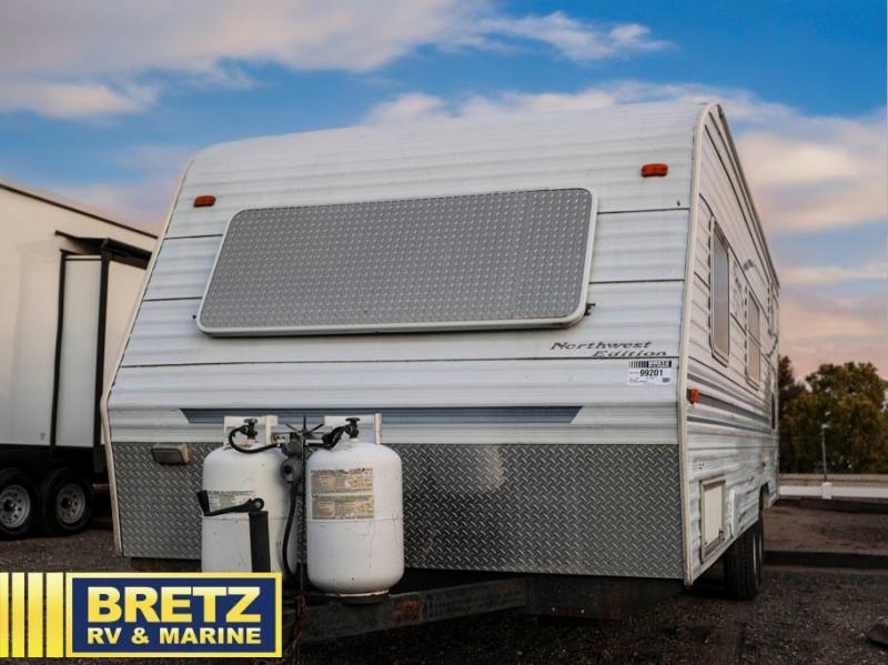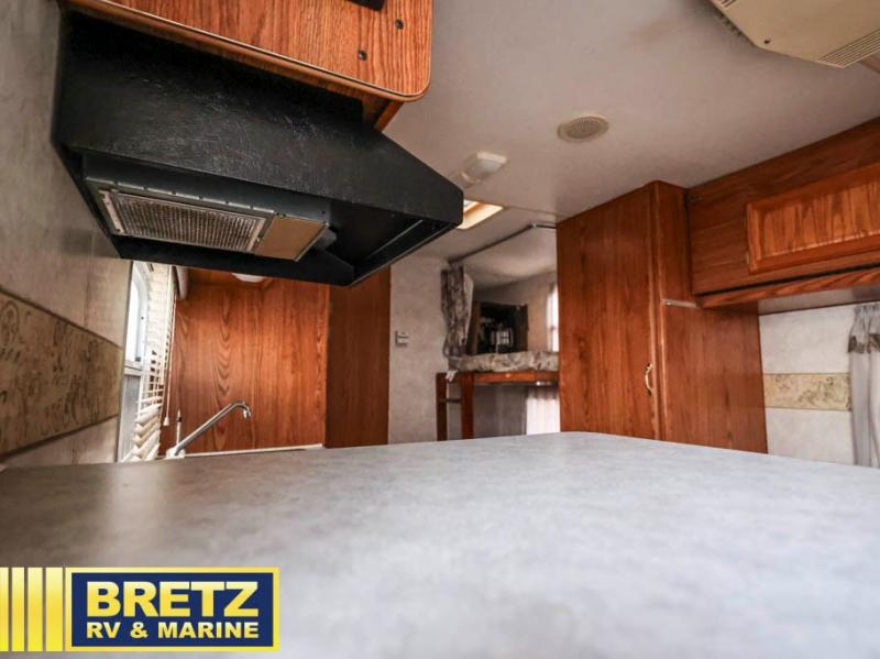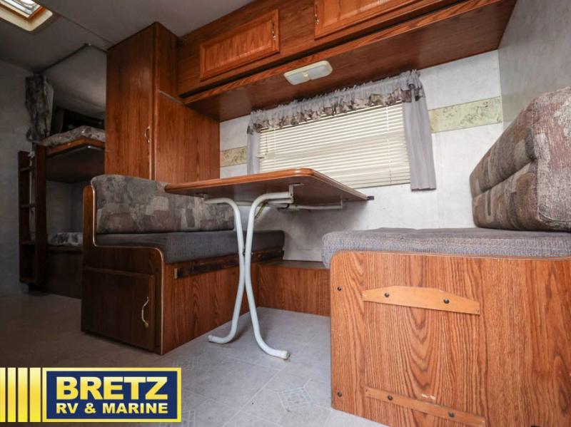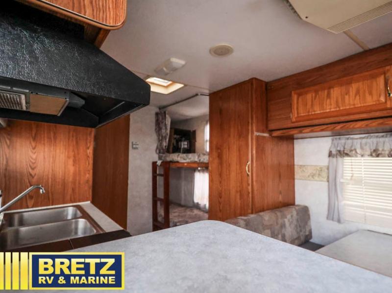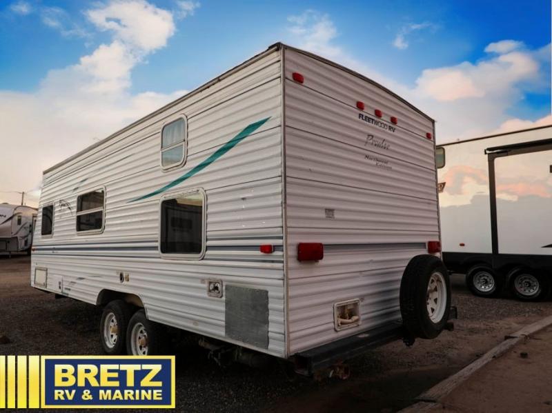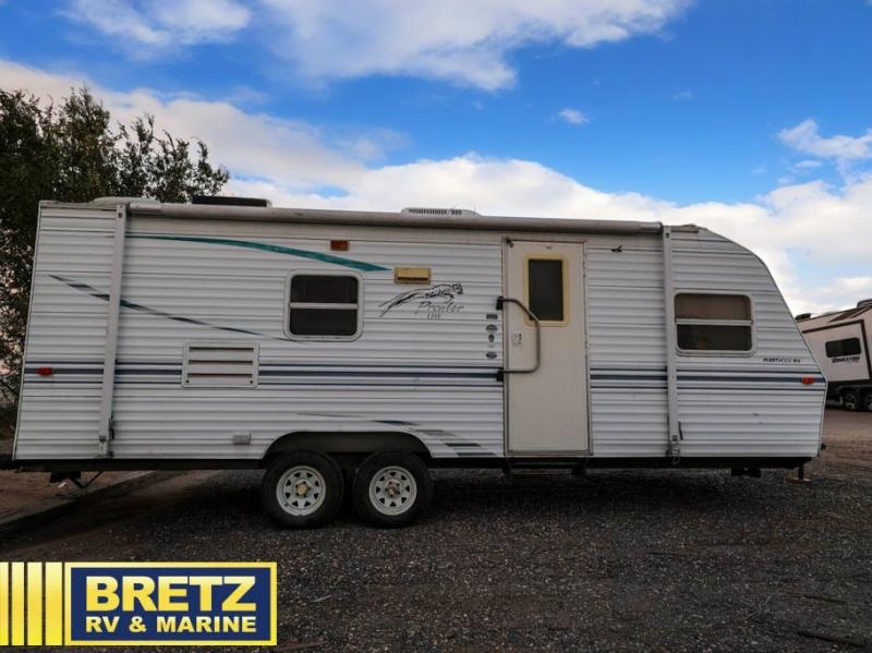 is a 2001 Lite Series travel trailer manufactured by Fleetwood RV. The "8242" model number indicates a specific floor plan within the Lite Series. Key features include a seamless rubber roof, fiberglass exterior, and a double-bowl stainless steel galley sink.